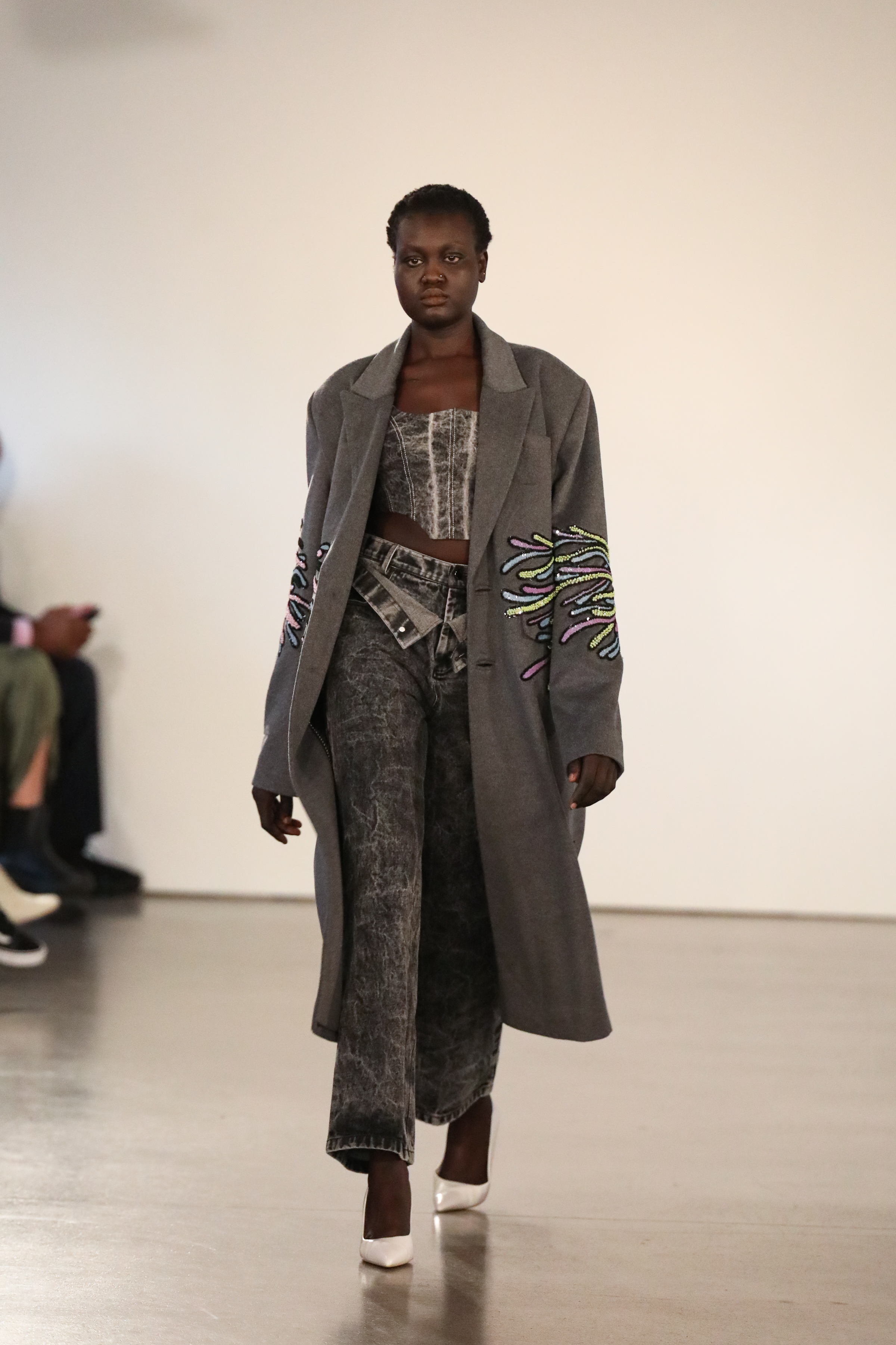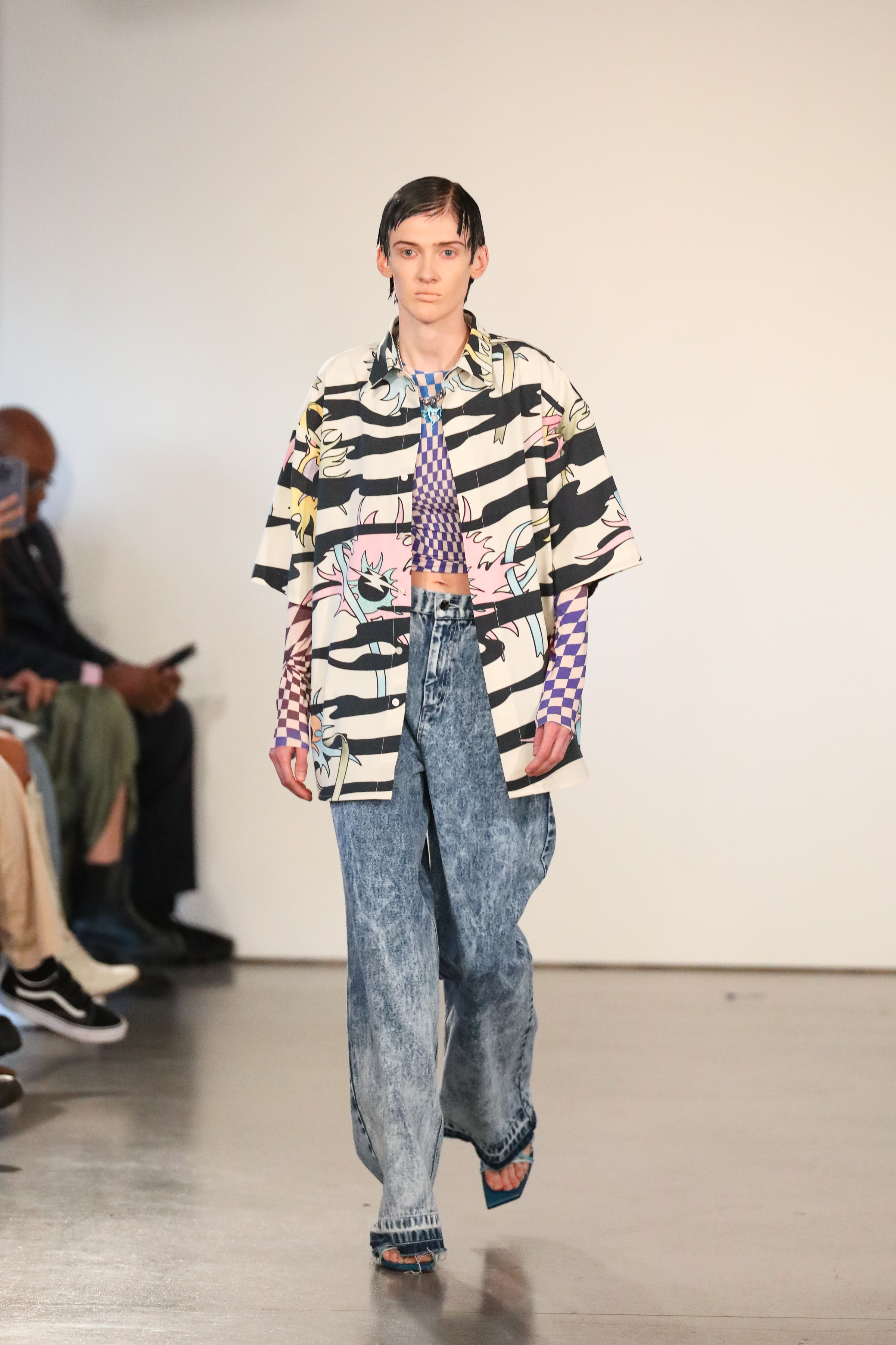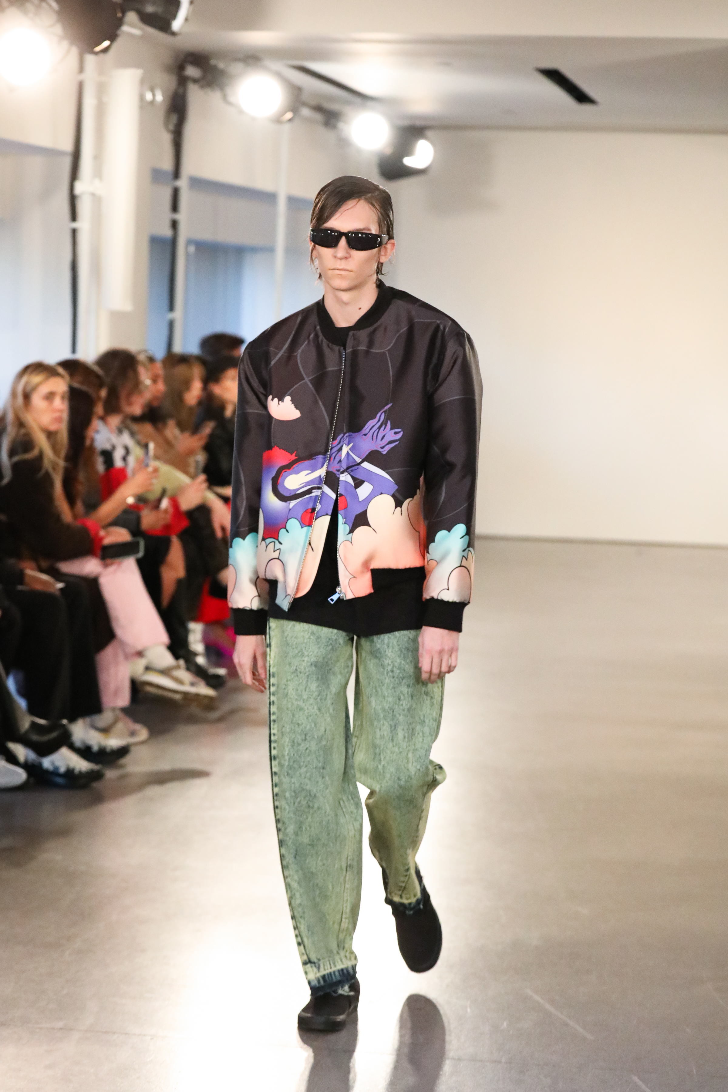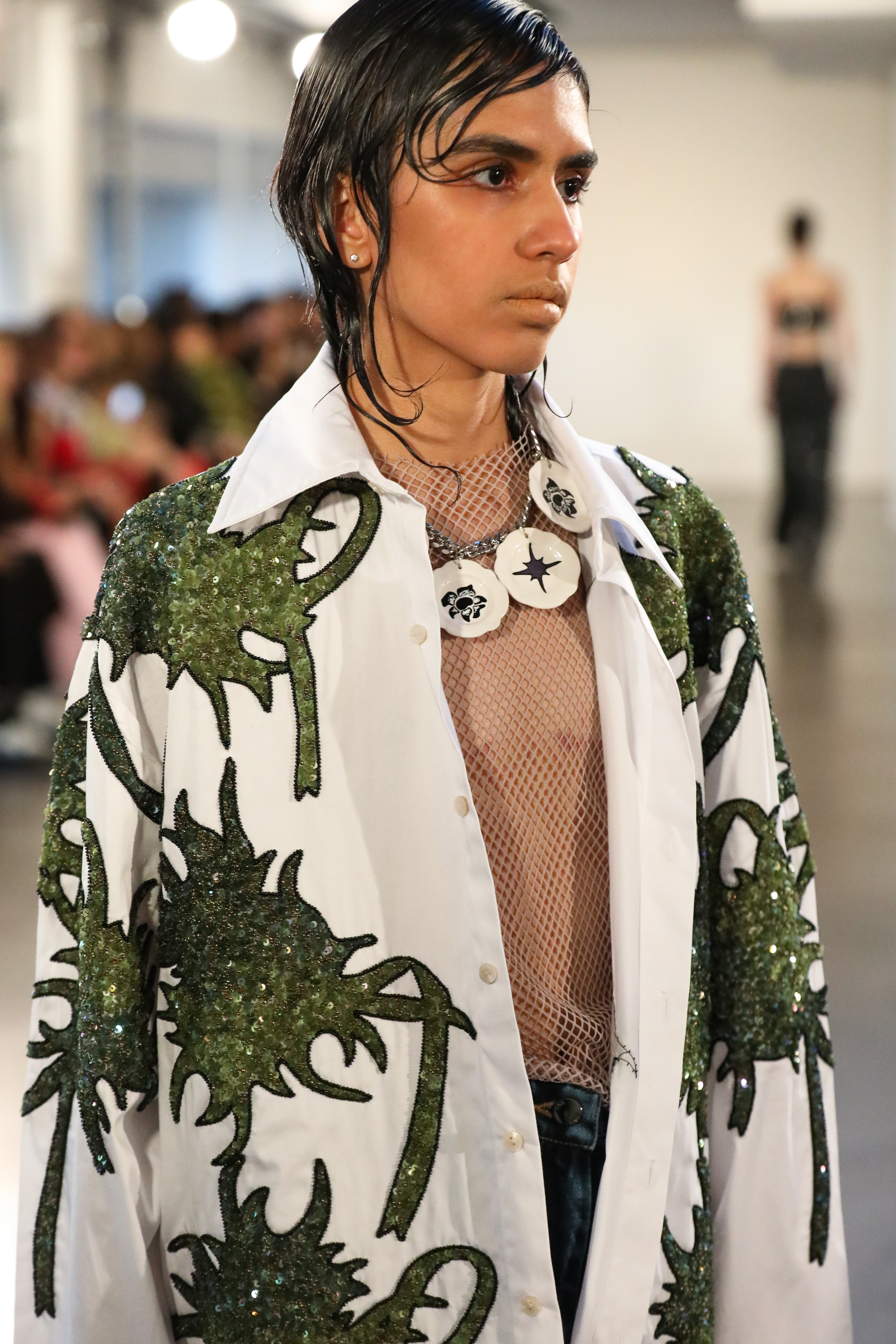 Through a mix of simple psychedelic elements and extravagant blooms of embroidered motifs classically tailored relaxed pieces, the dichotomy of an active imagination is brought to the forefront. A party for one turned rife with ruination, a creature emanating from a mirror-ball sparkling in the mind, Flowers that act as transformative portals; it’s all as real as real can be in the endless realm of the mind.