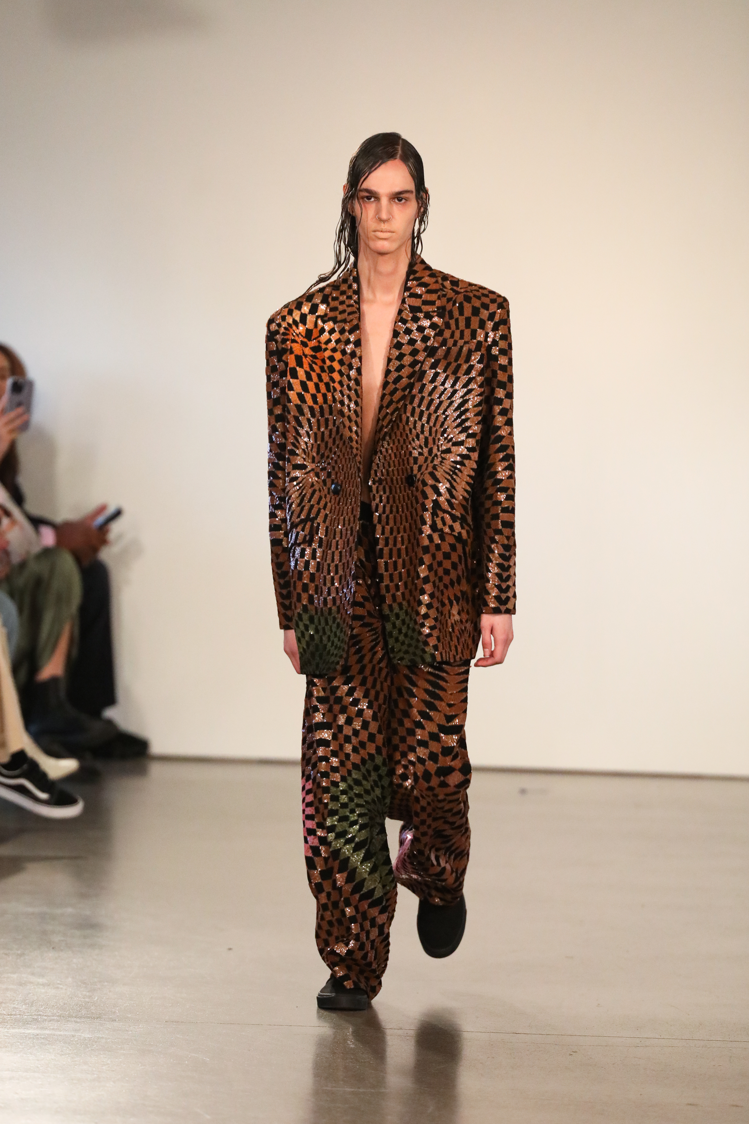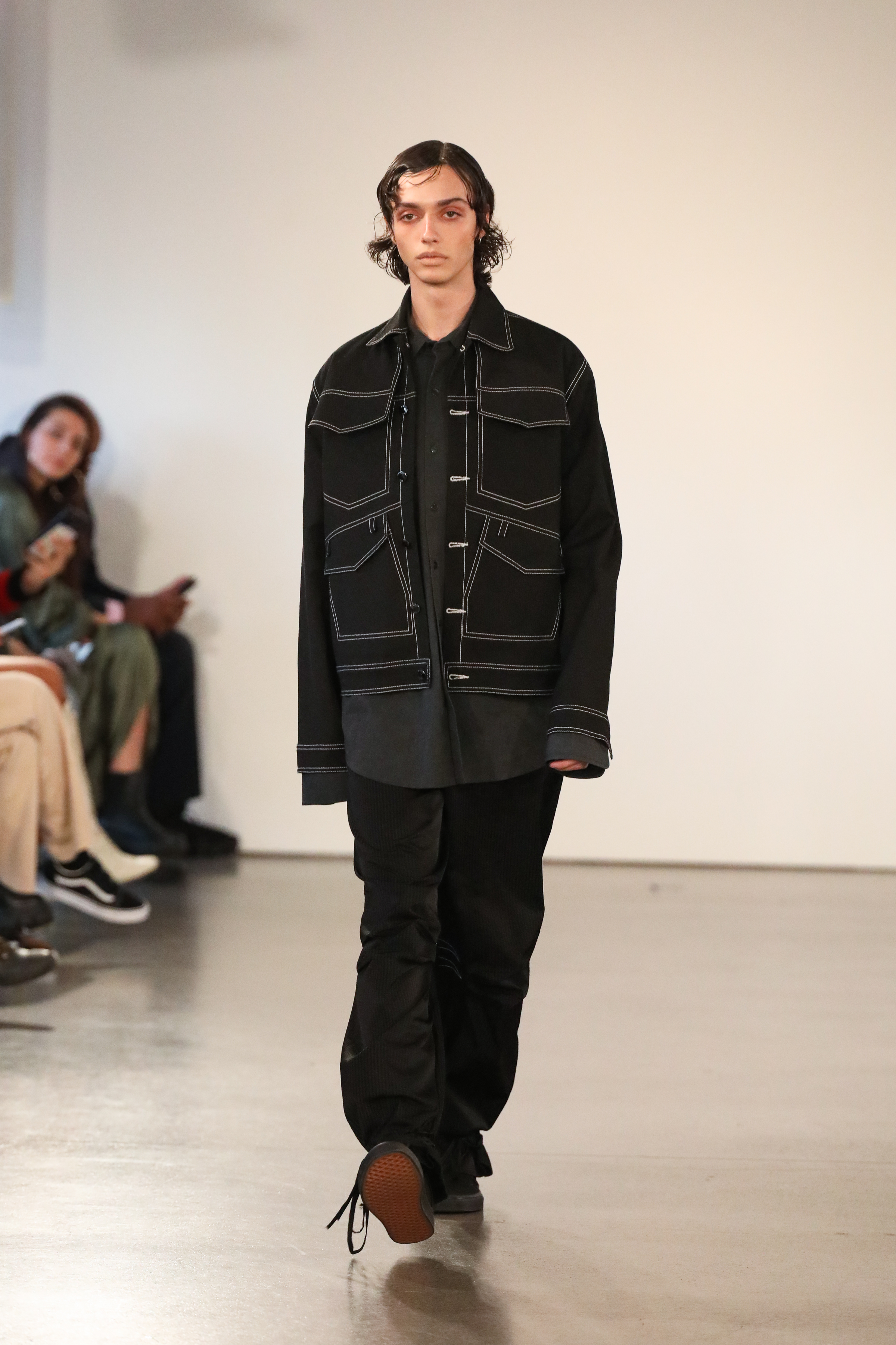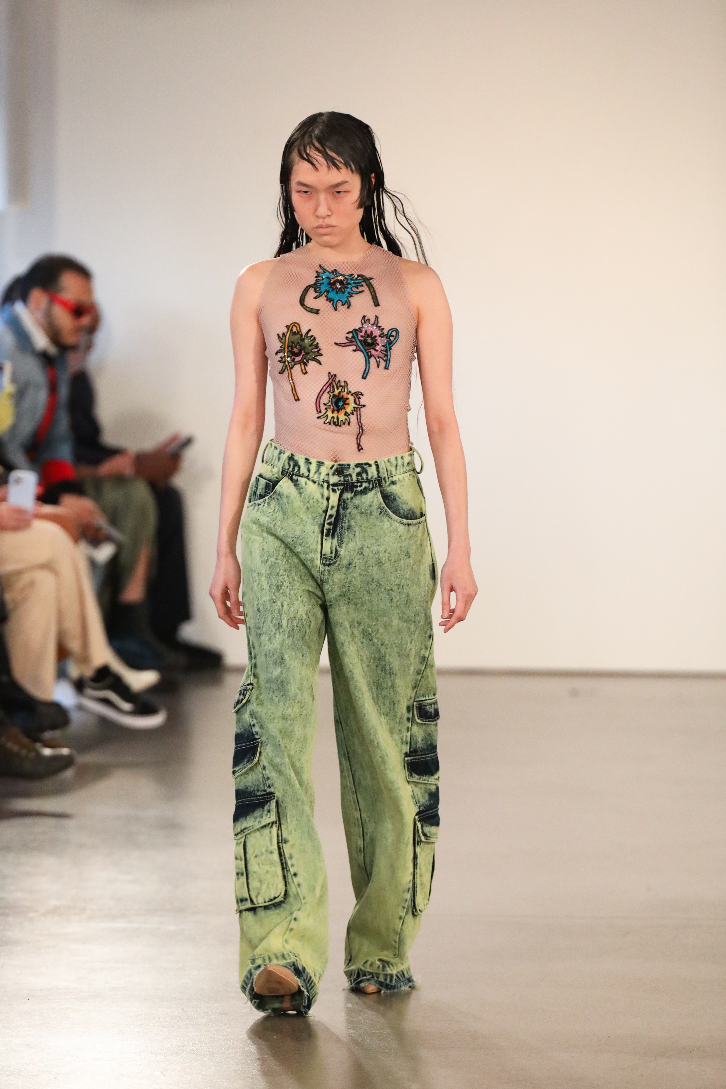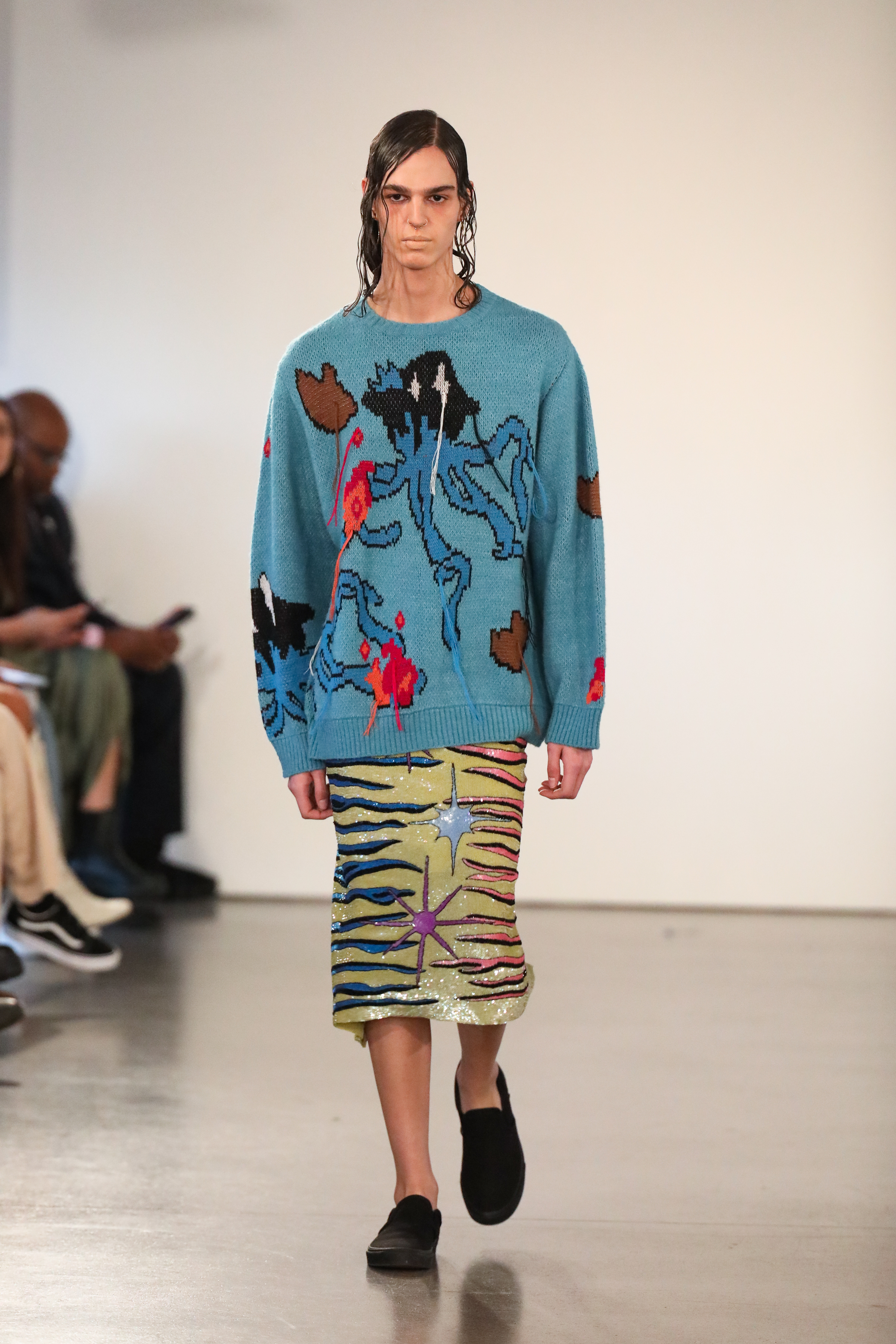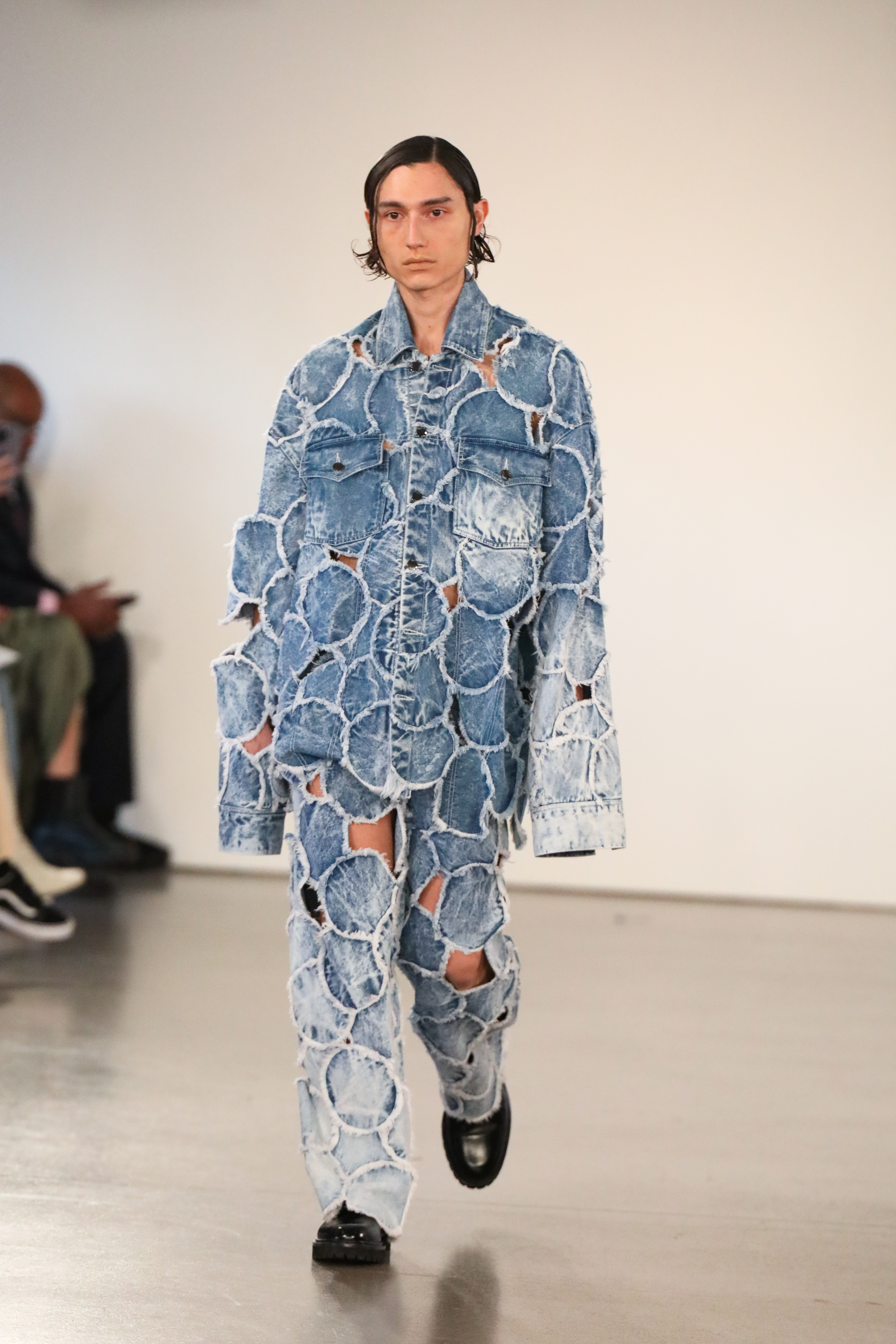 Through a mix of simple psychedelic elements and extravagant blooms of embroidered motifs classically tailored relaxed pieces, the dichotomy of an active imagination is brought to the forefront. A party for one turned rife with ruination, a creature emanating from a mirror-ball sparkling in the mind, Flowers that act as transformative portals; it’s all as real as real can be in the endless realm of the mind.