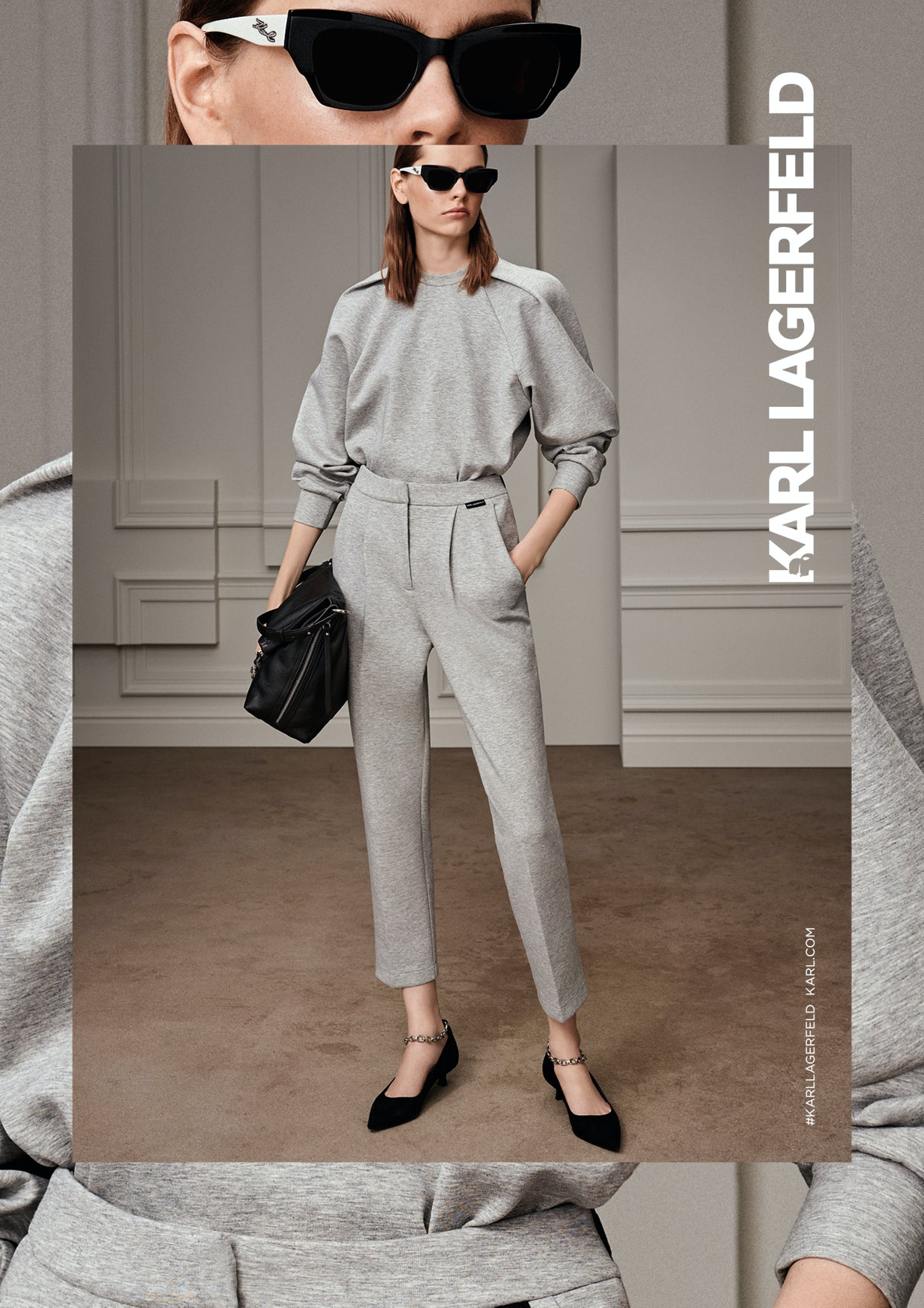 One of the most illustrious figures of the century was French queen Marie Antoinette, who was renowned for her sense of fashion. KARL LAGERFELD revisits the prominent silhouettes of her era including corset shapes, peplum seamlines and ruffled trims. Shades of cotton candy pink are combined with KARL’s quintessential palette of black and white. At the same time, themes of ‘90s power dressing appear in pant suits, jackets and trousers; the signature look is tailored and modern.
