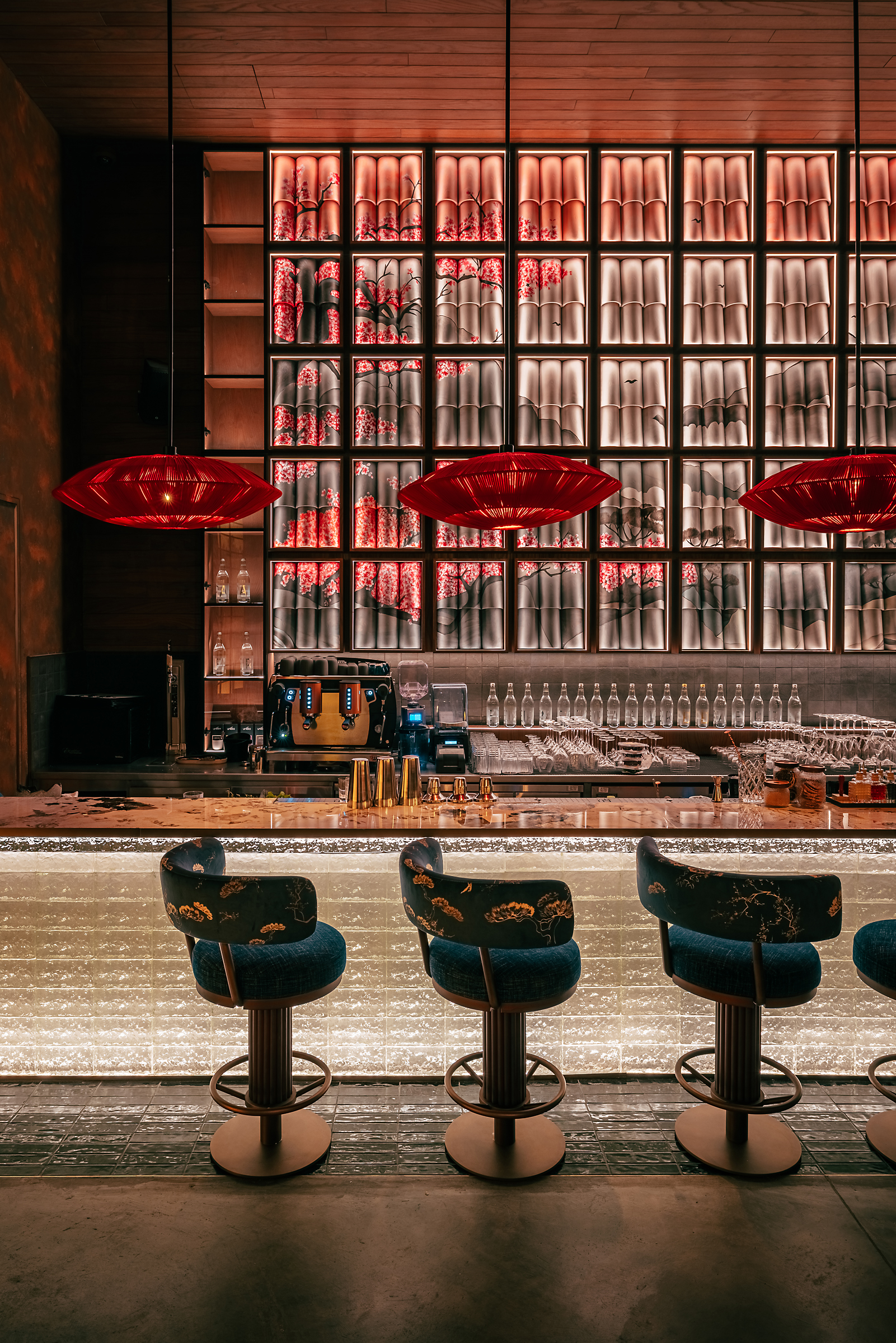Designed by DBM Studio under the leadership of Mahsa Gholizadeh, the interiors reflect a fusion of nature and urban elegance, inspired by traditional Japanese aesthetics and contemporary architectural elements. The design draws from the beauty of Mount Fuji framed by delicate cherry blossoms, incorporating bespoke details, artist-painted terracotta tiles, and nature-infused elements that bring warmth and authenticity to the space. From laser-painted masterpieces and hand-painted cherry blossoms to custom glass installations, every aspect of Kiyoshi’s interiors has been carefully curated to create an engaging and sophisticated dining atmosphere. Whether seated indoors amid intricate design details or enjoying the stunning Dubai Creek skyline from the terrace, guests are invited into an immersive space that harmonizes tradition with modernity.