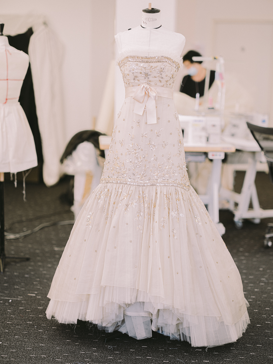 The dress was entirely remade for the movie in the CHANEL ateliers, and it required a total amount of 1034 hours of work (700 hours for embroideries) by five full-time seamstresses.