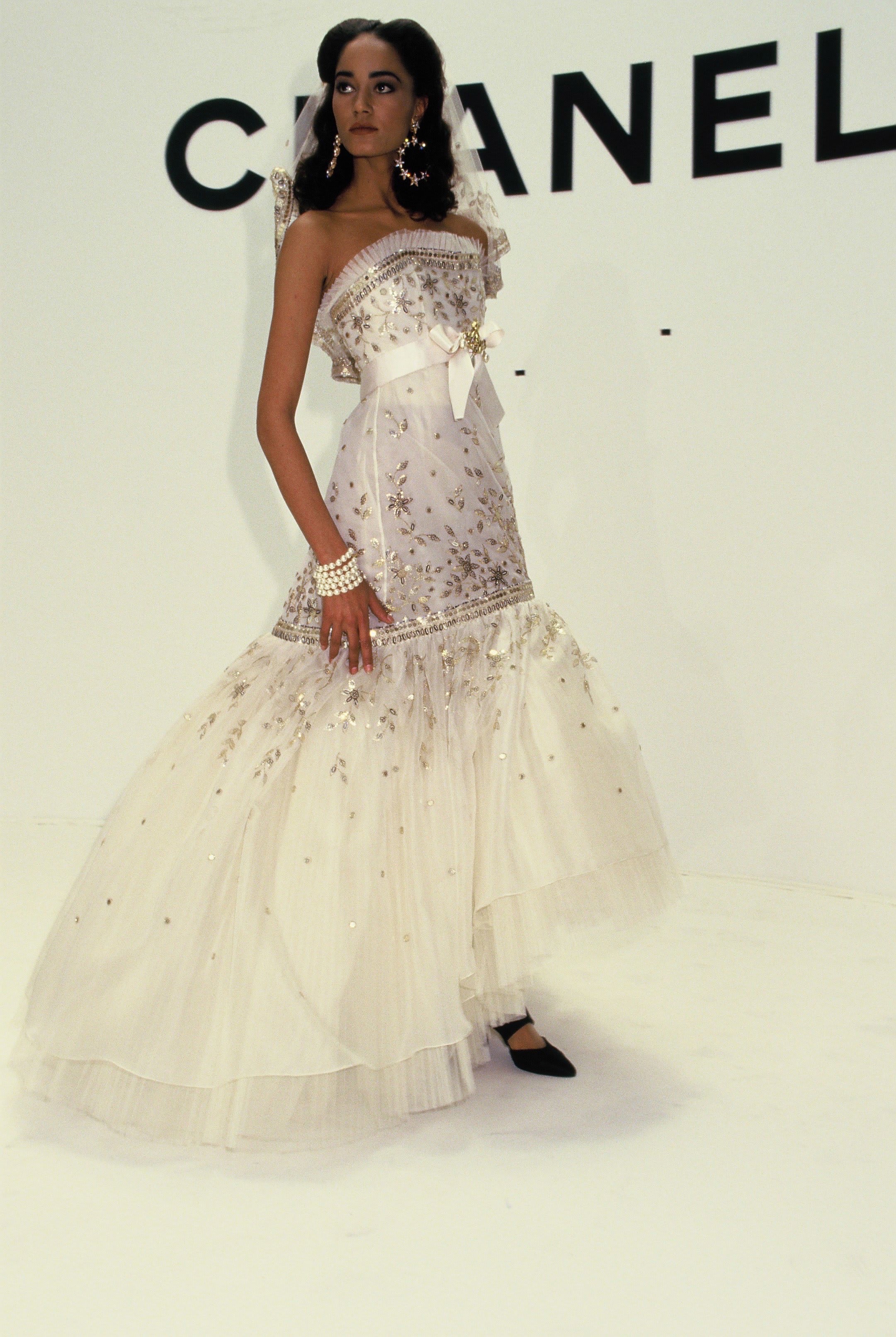 This strapless, boned dress has a straight neckline trimmed with a delicate pleated tulle ruffle and a frieze composed of ovum and florets, an appliquéd satin belt with a bow at the front, a skirt fitted down to the hips then gathered and longer at the back, as well as multiple tulle flounces mounted on an organza petticoat. Embroidery by Lesage and Pleating by Lognon.