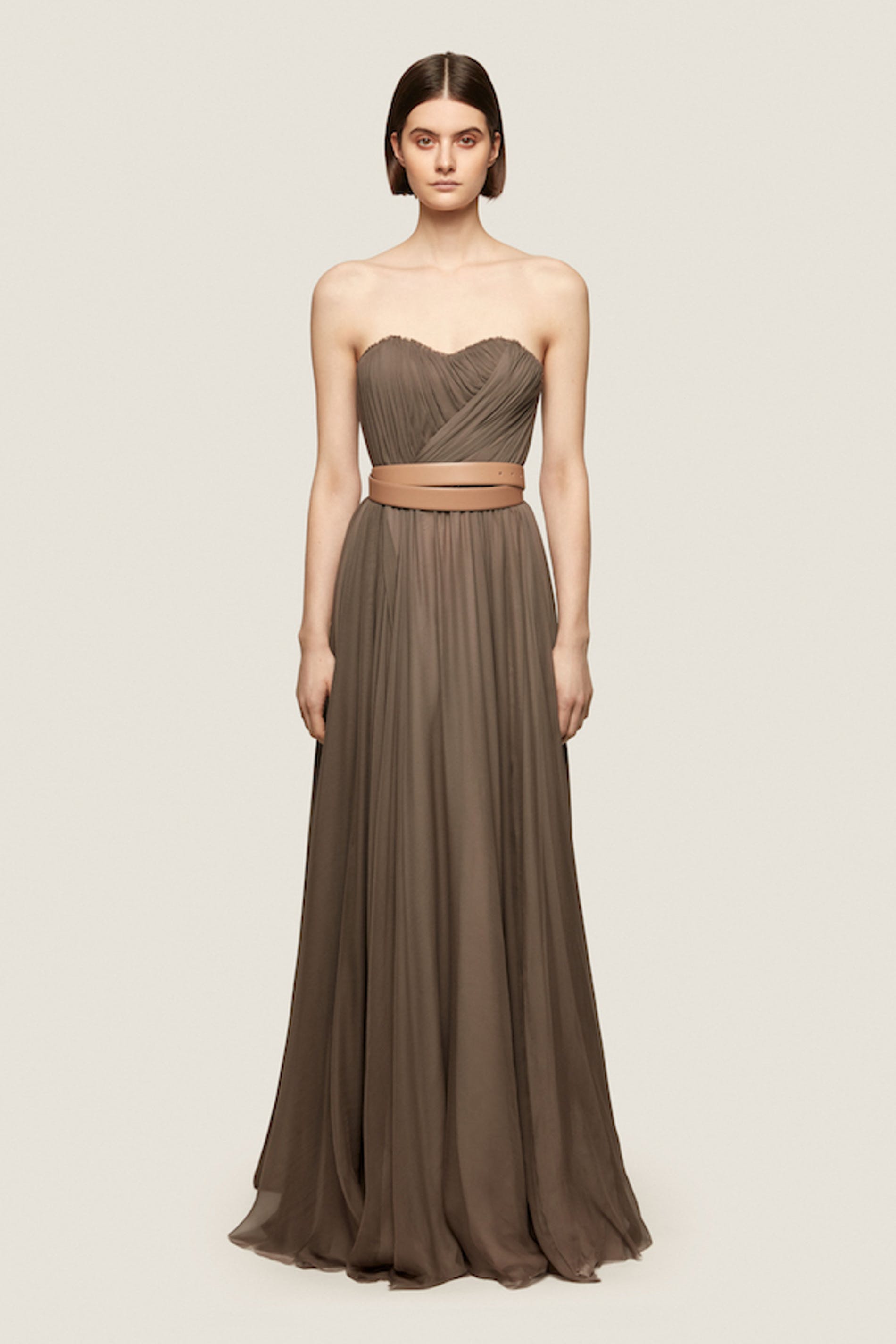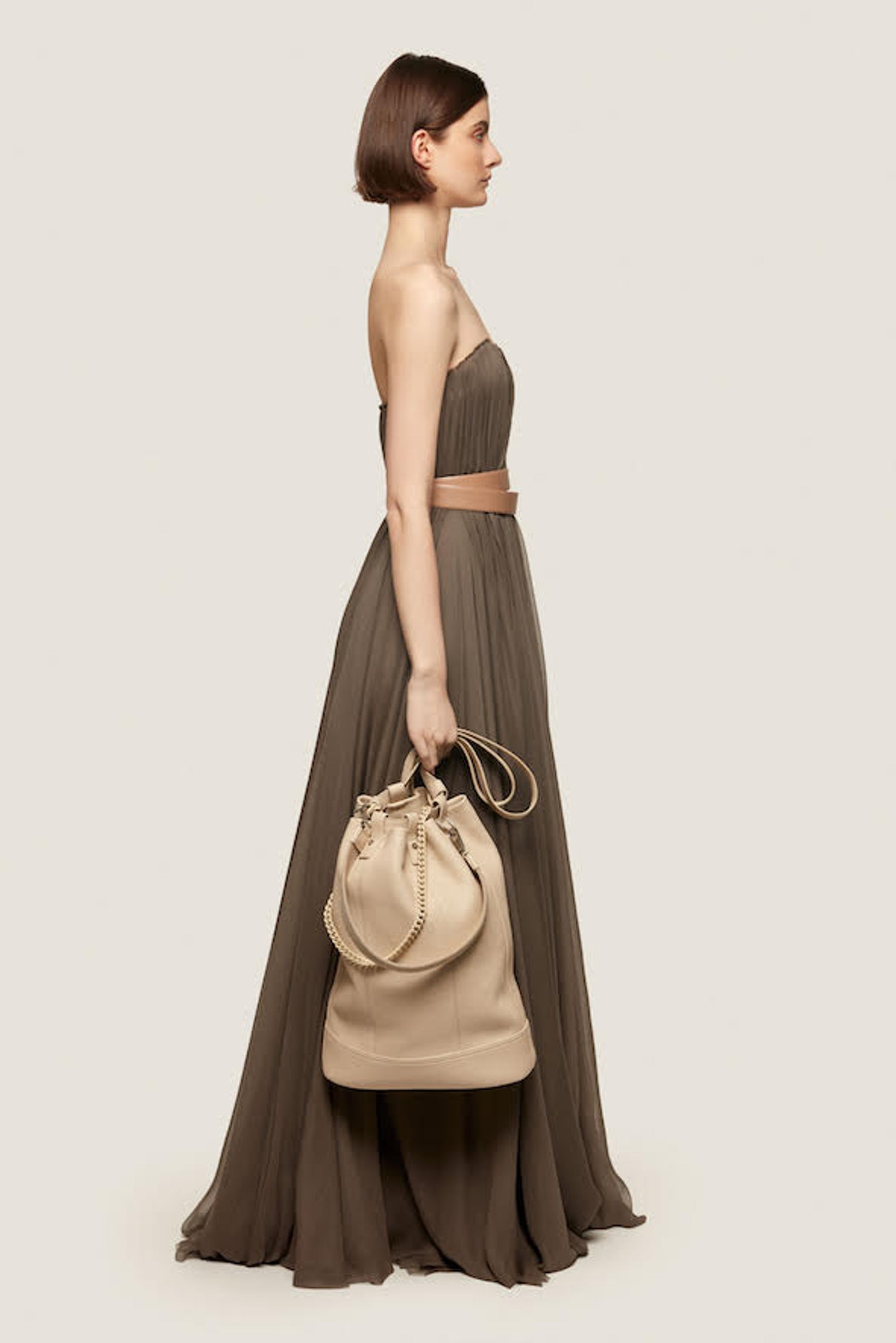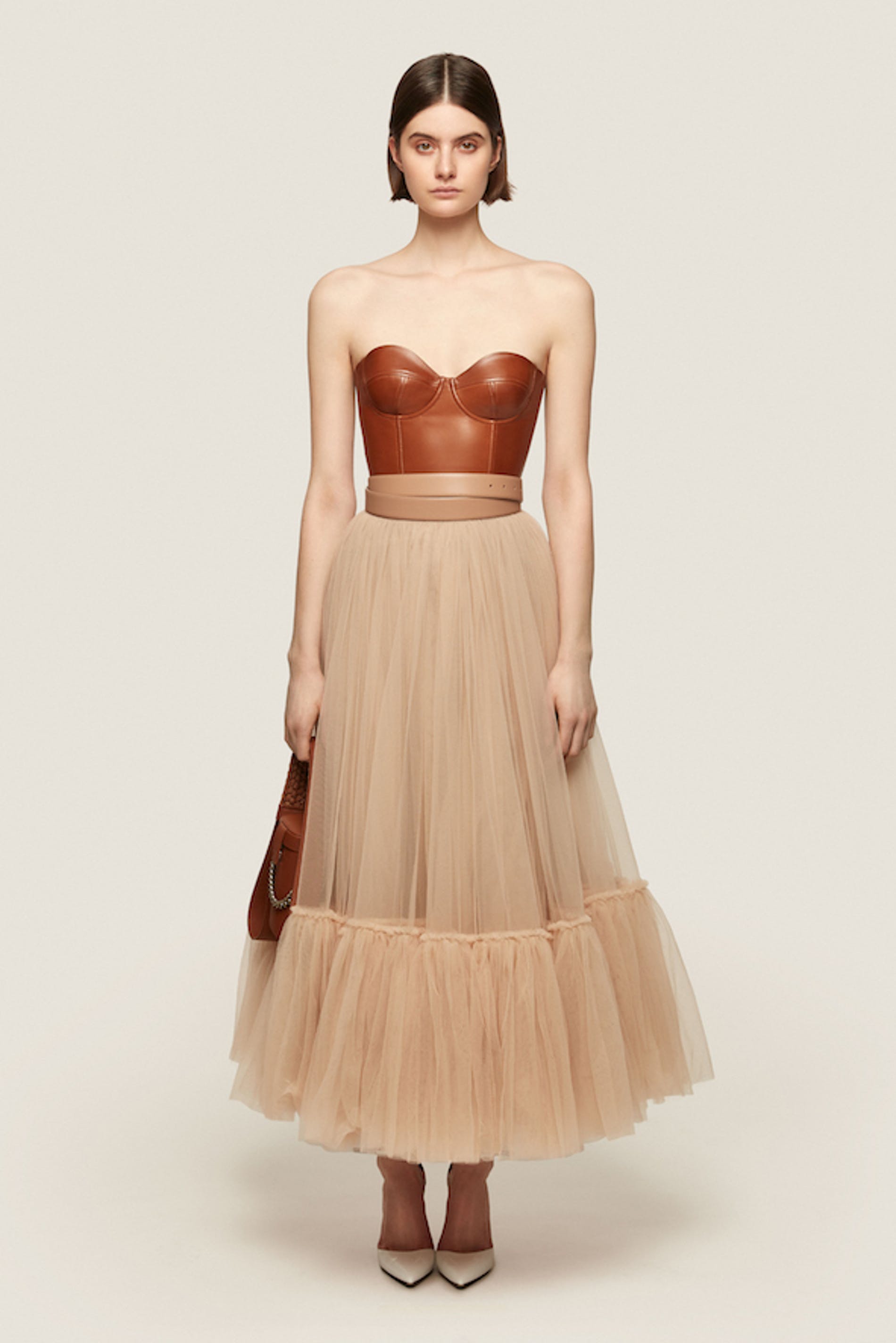 Defining strong, feminine style the collection translates in ‘dream-like’ silhouettes, techniques and futuristic cross-cultural references - In this world, couture era tailoring combined with soft shades of air-light tulle, nostalgically stitched and quilted nappa in clean modernist forms in clinical white. Beatnik-generation fringed nubuck suede sits next to dramatic couture evening elements of gathered tulle and feathers, cashmere lounge suits and feminine retro printed silk.