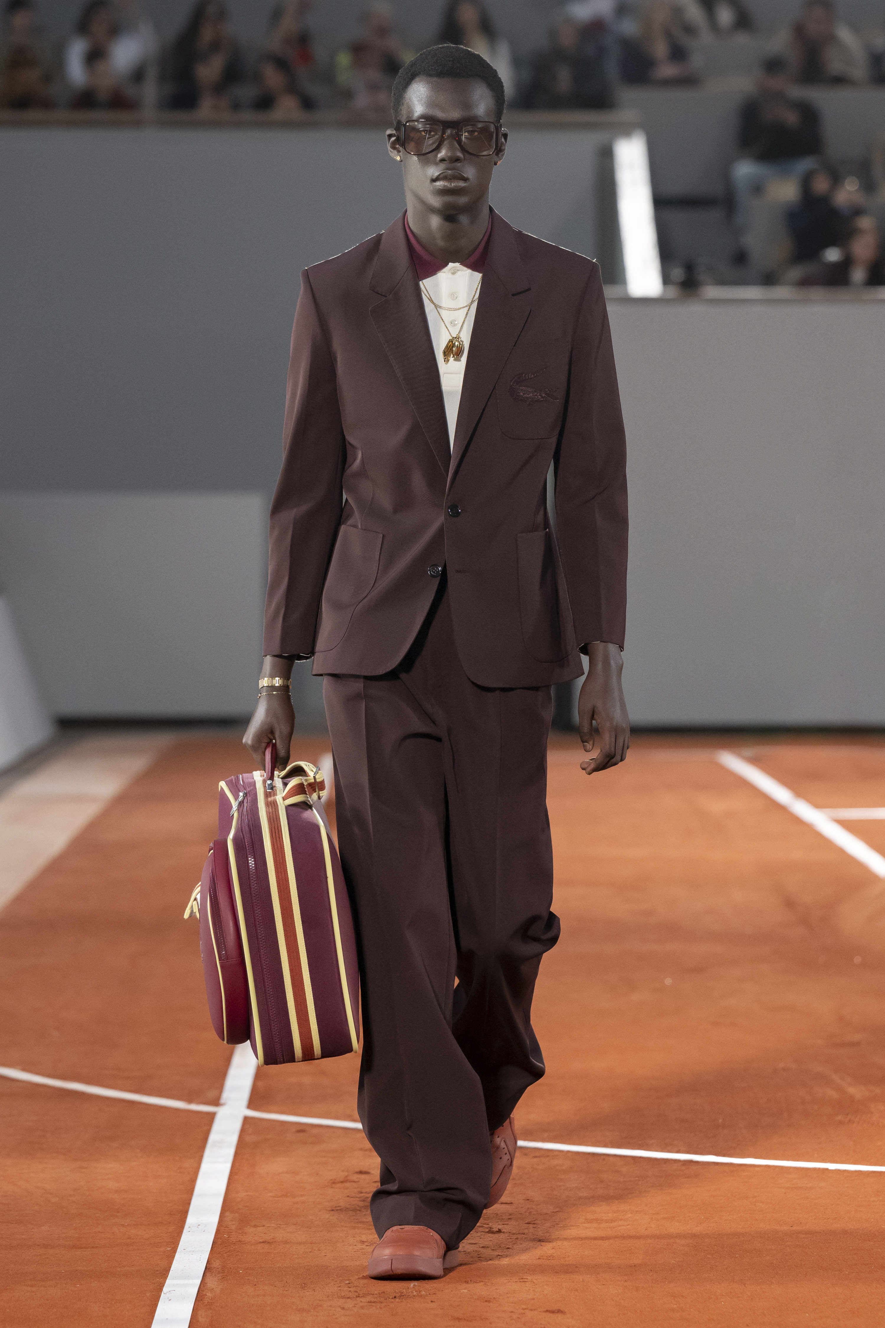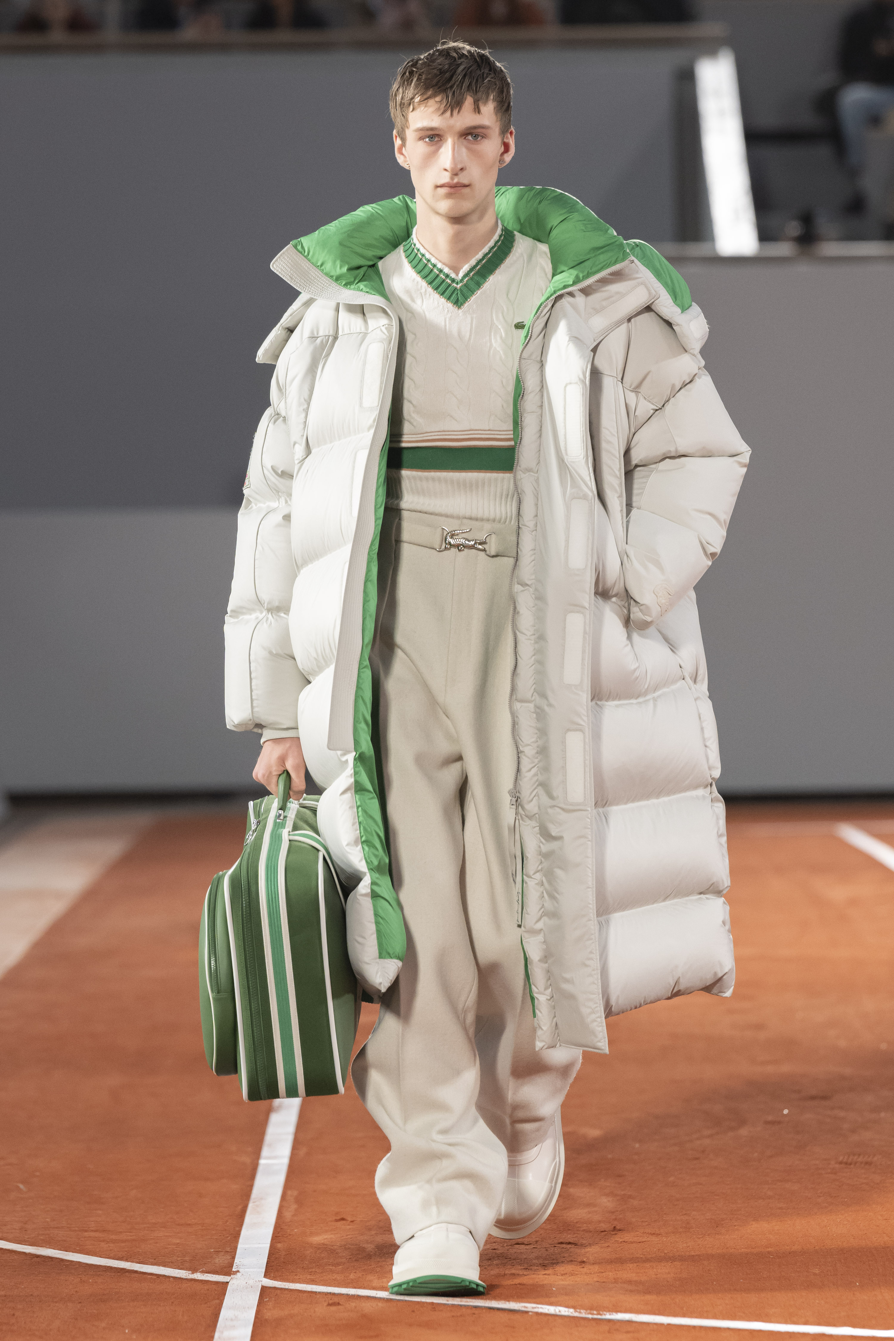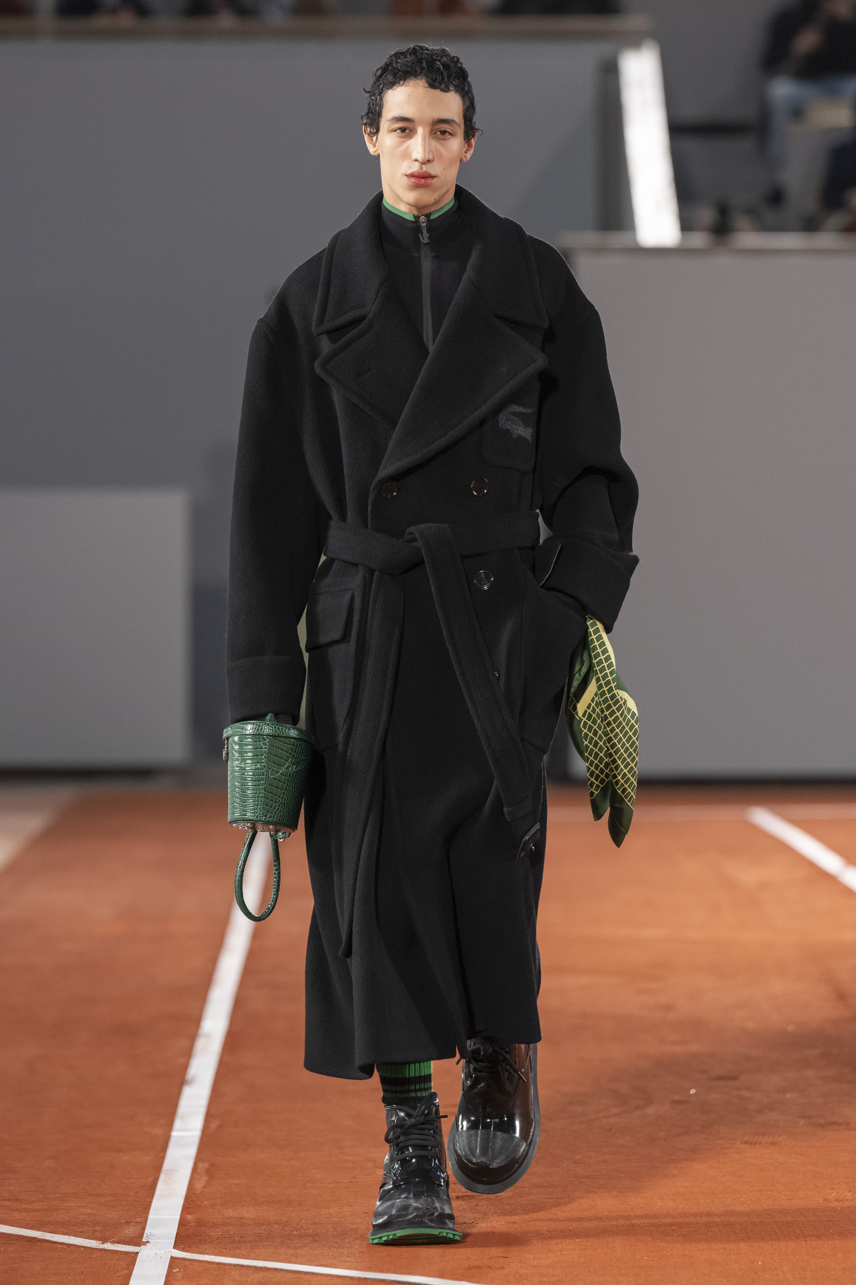Iconic essentials include a double-breasted cashmere wool coat hand-embroidered with a scaled-up yellow crocodile that recalls varsity jacket techniques. Like well-stamped vintage travel bags, croc-effect bucket bags recall the crocodile suitcase promised to René Lacoste by his coach Allan H. Muhr before the 1923 Davis Cup. In another reference to the House’s origin story, a photographic print of René Lacoste smashing a ball appears on a series of total looks.