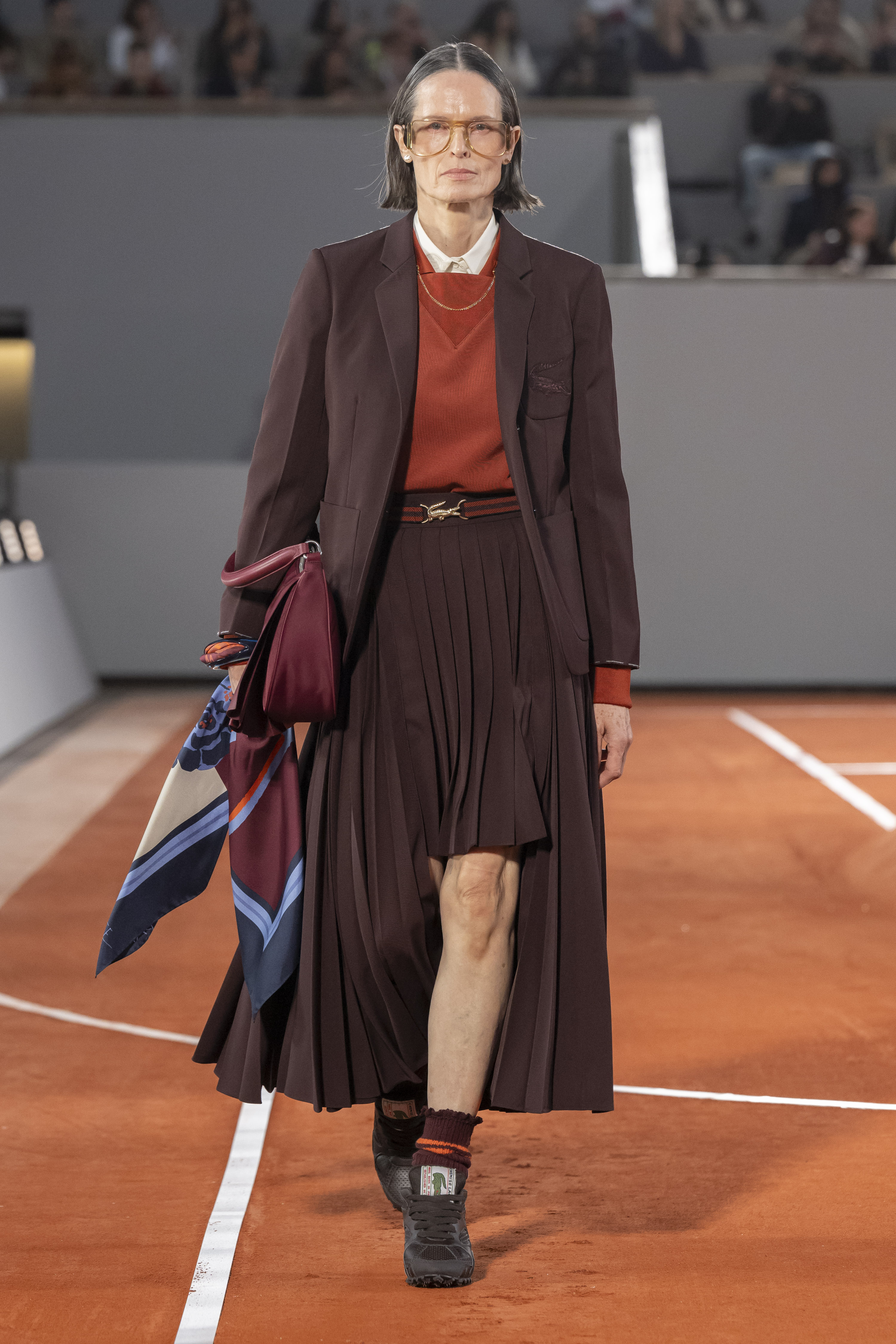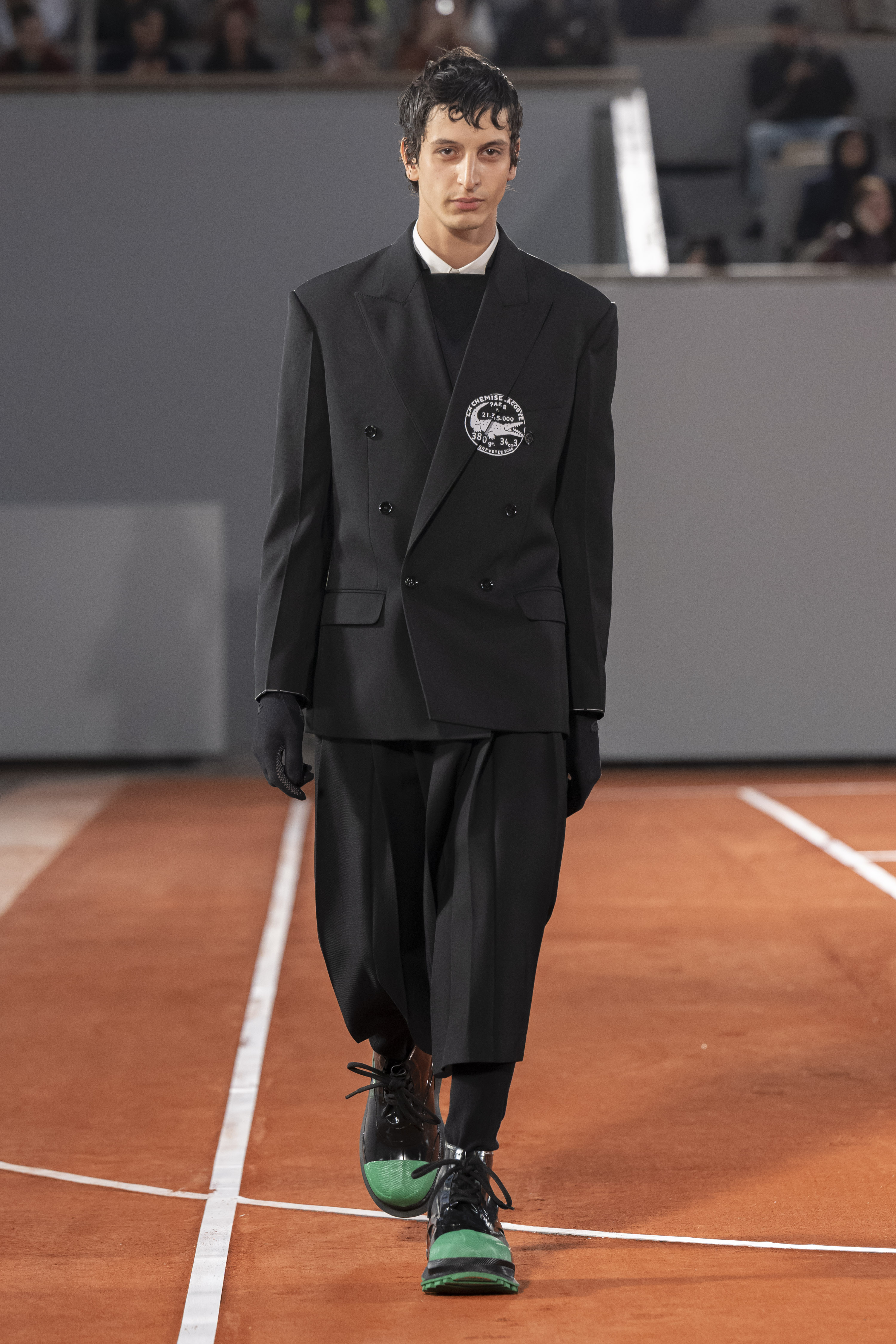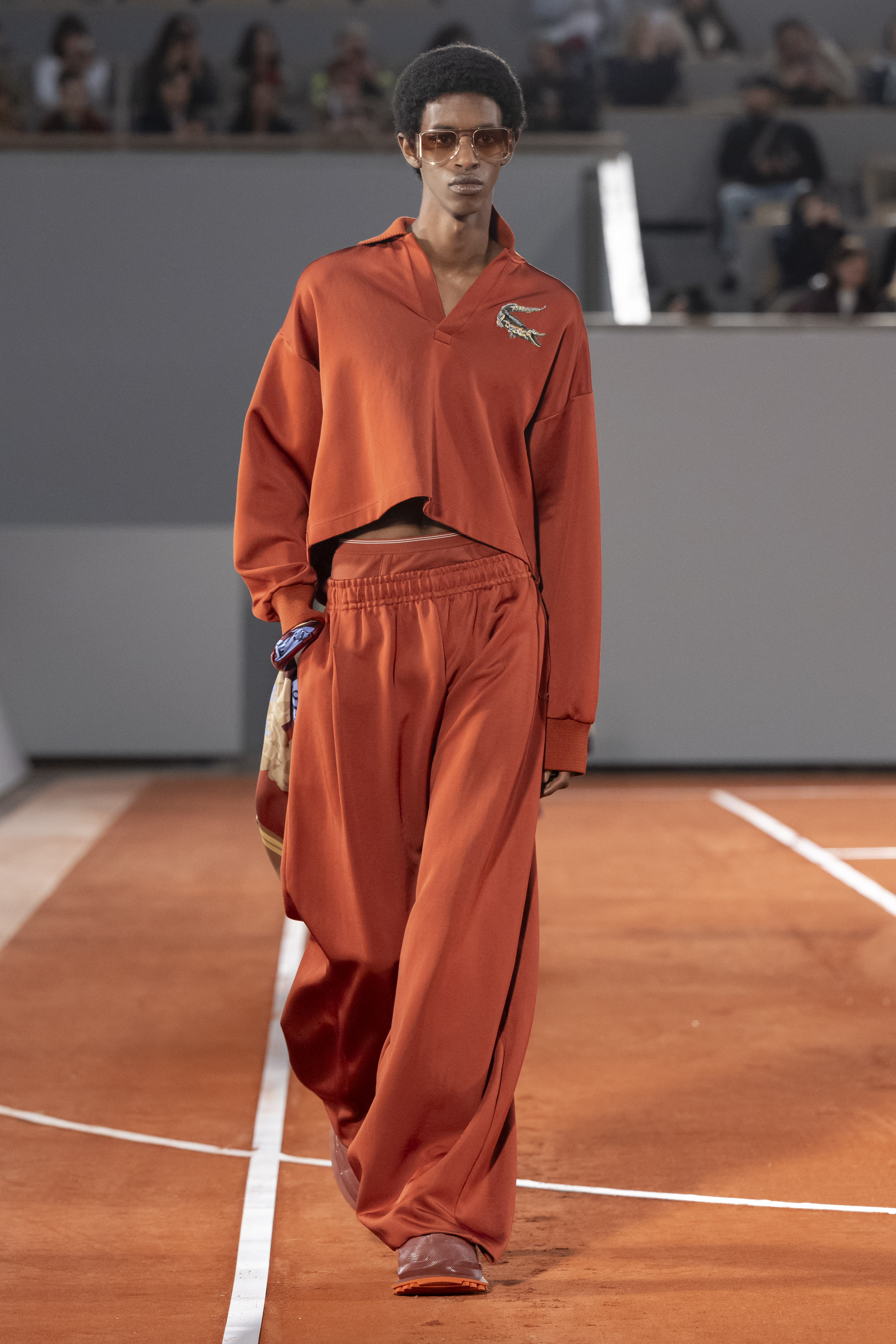 Iconic essentials include a double-breasted cashmere wool coat hand-embroidered with a scaled-up yellow crocodile that recalls varsity jacket techniques. Like well-stamped vintage travel bags, croc-effect bucket bags recall the crocodile suitcase promised to René Lacoste by his coach Allan H. Muhr before the 1923 Davis Cup. In another reference to the House’s origin story, a photographic print of René Lacoste smashing a ball appears on a series of total looks.