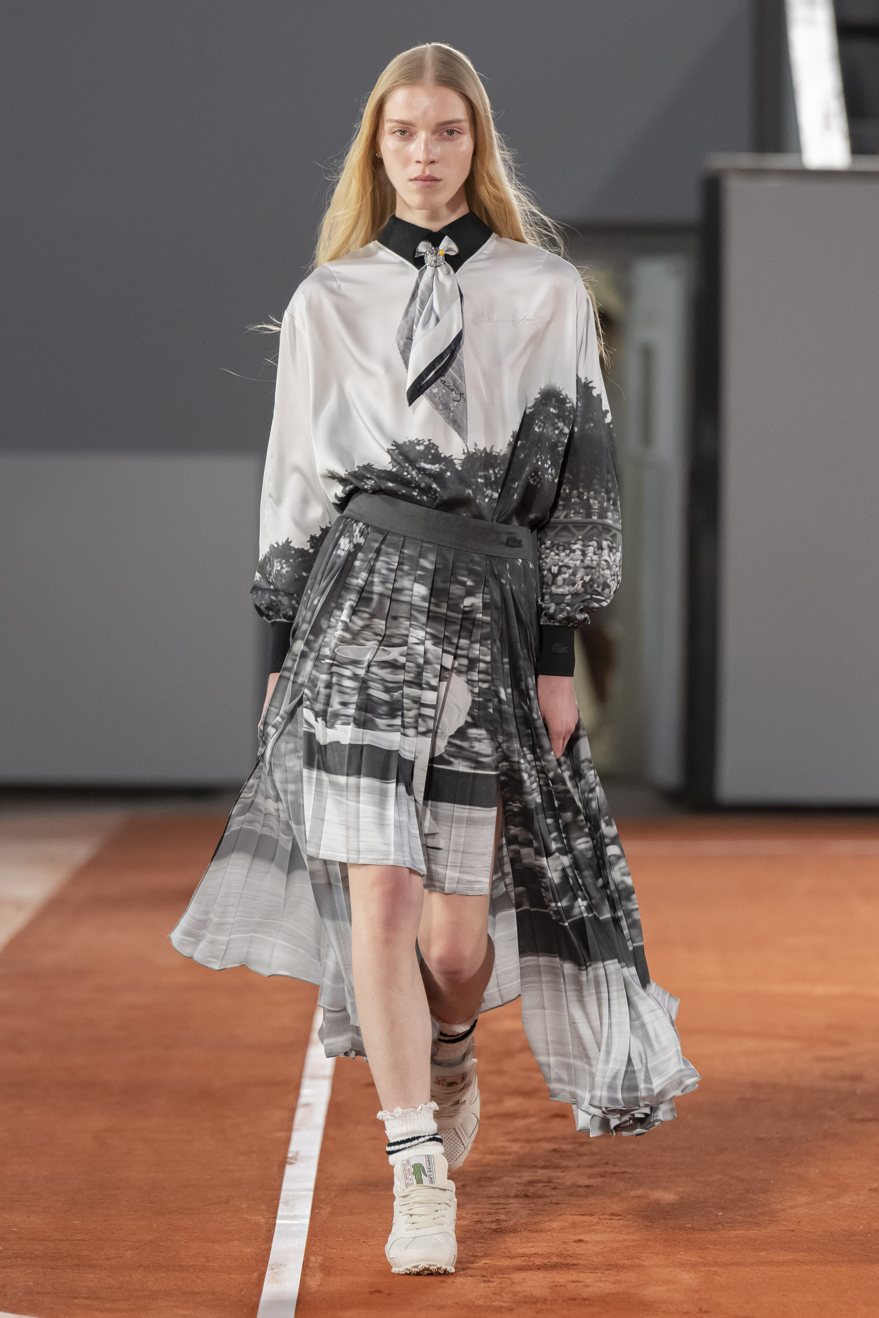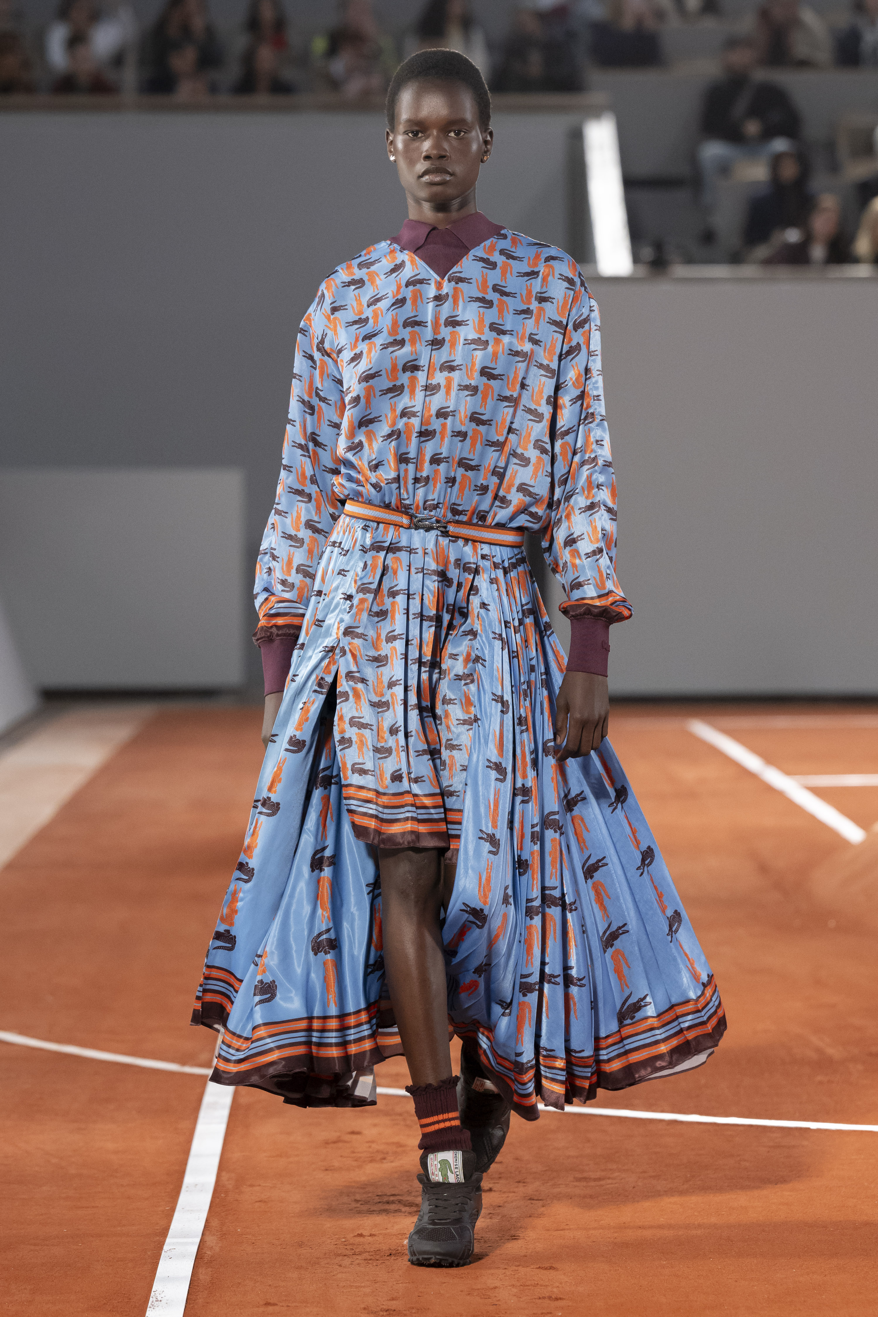 The show’s leitmotiv is based on the original illustration for the Lacoste crocodile, designed by René and the artist Robert George in 1927, now in modernized dimensions. Emphasized in colorful graphics on powerful, minimalist silhouettes and blankets, it becomes a disruptive design element throughout the lineup. Baby crocs play up femininity and glamour in all-over silver sequin embroidery on mesh lace dresses and tank tops, glide along silk pleating and reprise a tie motif on neo-bourgeois silk scarves.