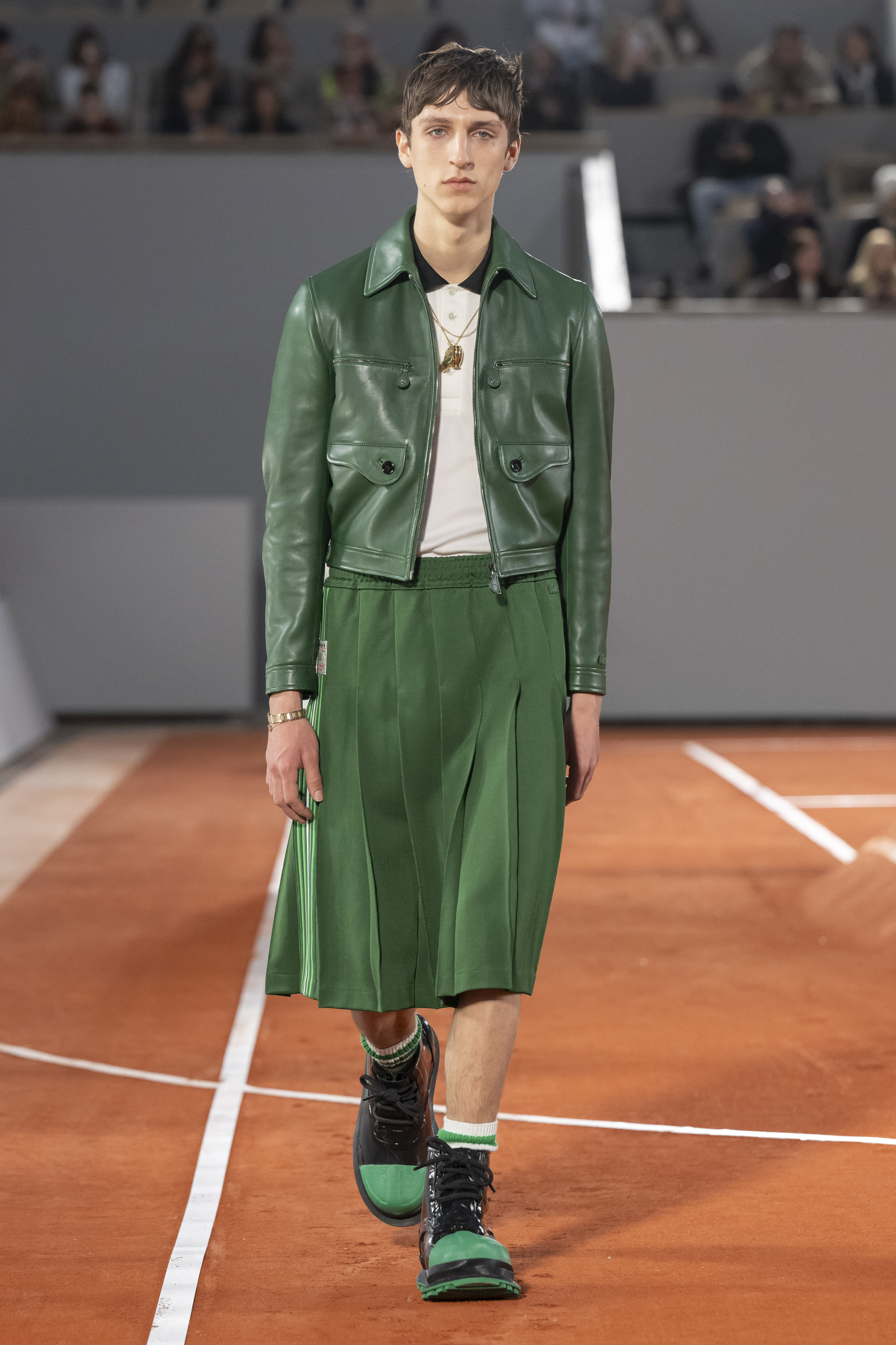René's victorious homecoming is recounted through new proportions in tailoring, with subtle contrasts of fit combined in a single silhouette. Continuing the sports metaphor, pleated skirts inspired by the ones worn by tennis champion Suzanne Lenglen appear in a classic twill for an impeccably tailored look, while pleating on leather turns a sports signifier into a design code. Utilitarian pieces like sport tops, parkas and puffers fuse fashion and function. New-gen cable-knits update old-school country club style for today. Coats cut like generous robes accentuate freedom of movement, slipping easily over sport tops and fitted jackets for a fluid, progressive look.