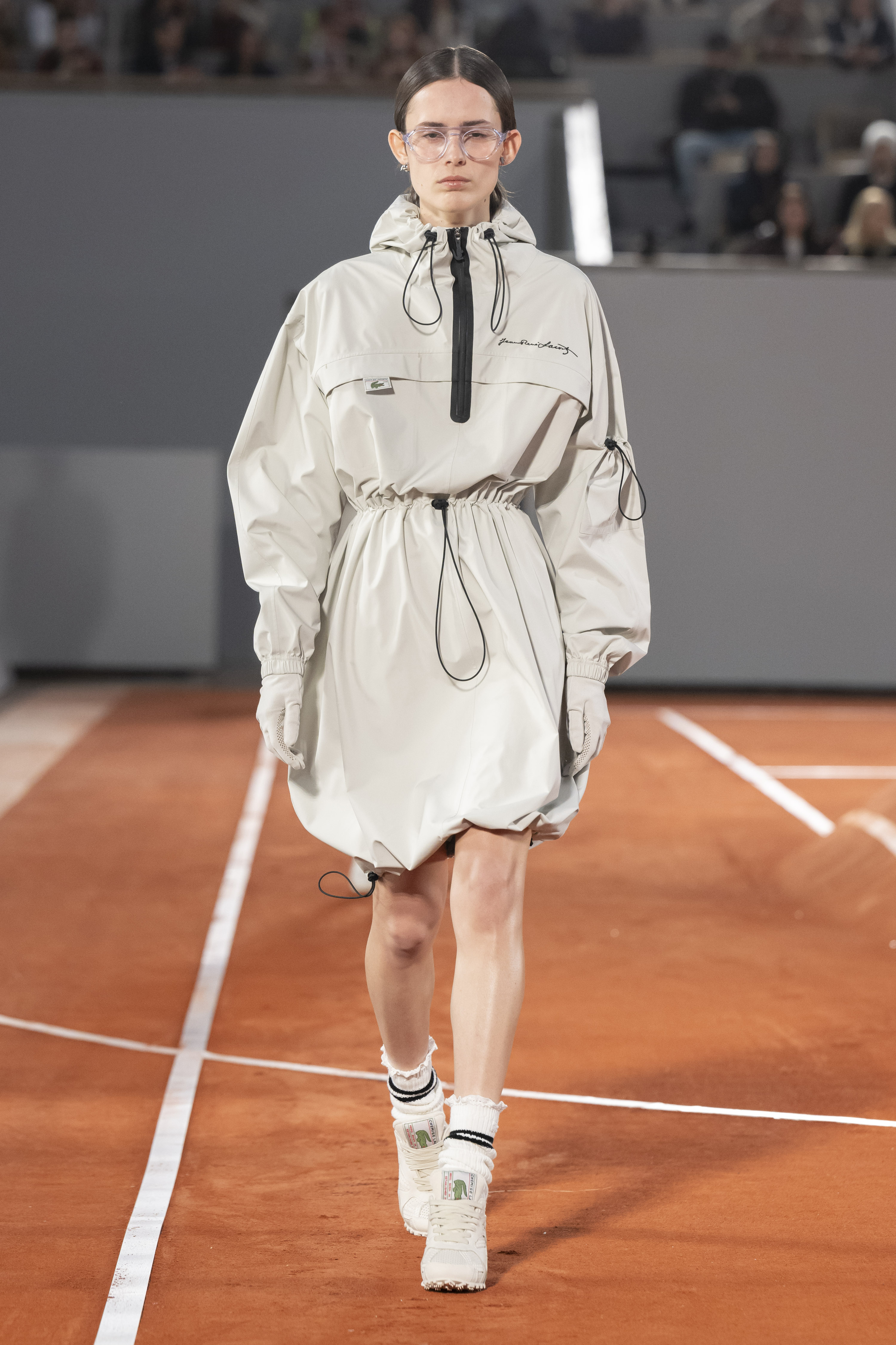 Grace and sophistication, performance and comfort, structure and ease converge as crocodile lace, silk, sheer layers and draping gently contrast with sporty technical materials. Colors, too, reflect the Lacoste saga, moving from sensual black to clay-court terracotta with contrasting accents of sky blue, grass and Lacoste green, and pure white, an emblem of victory on the court and off.