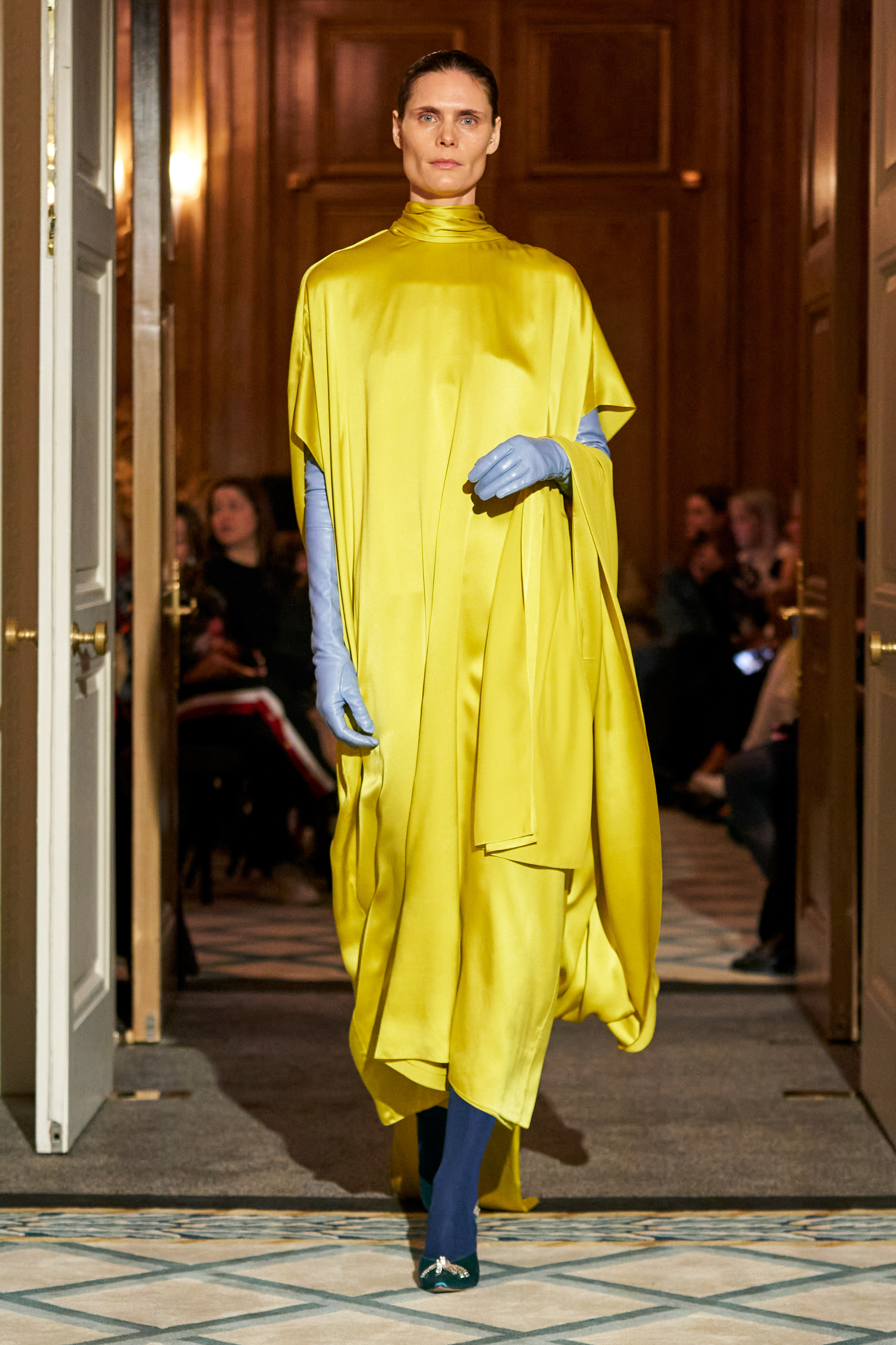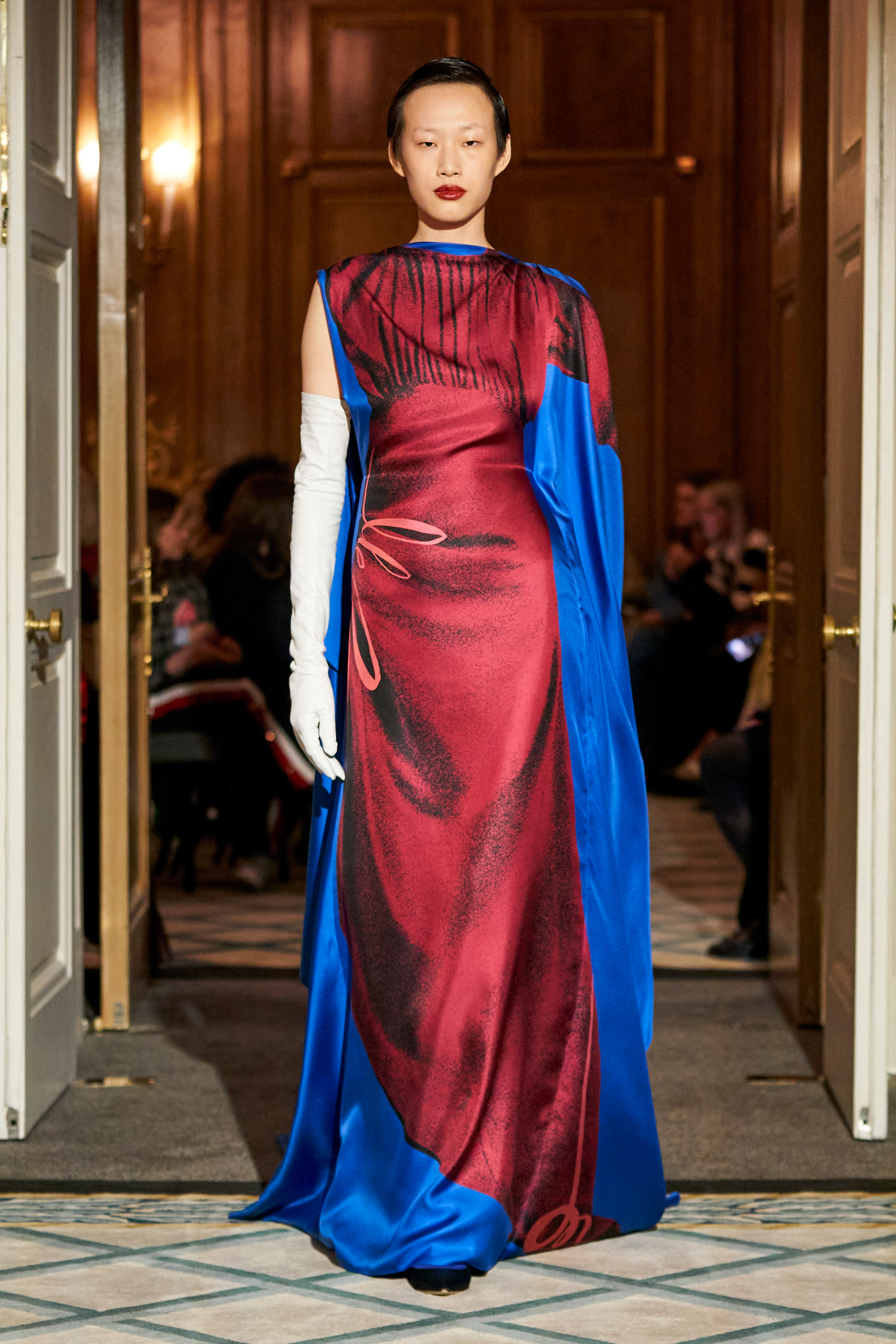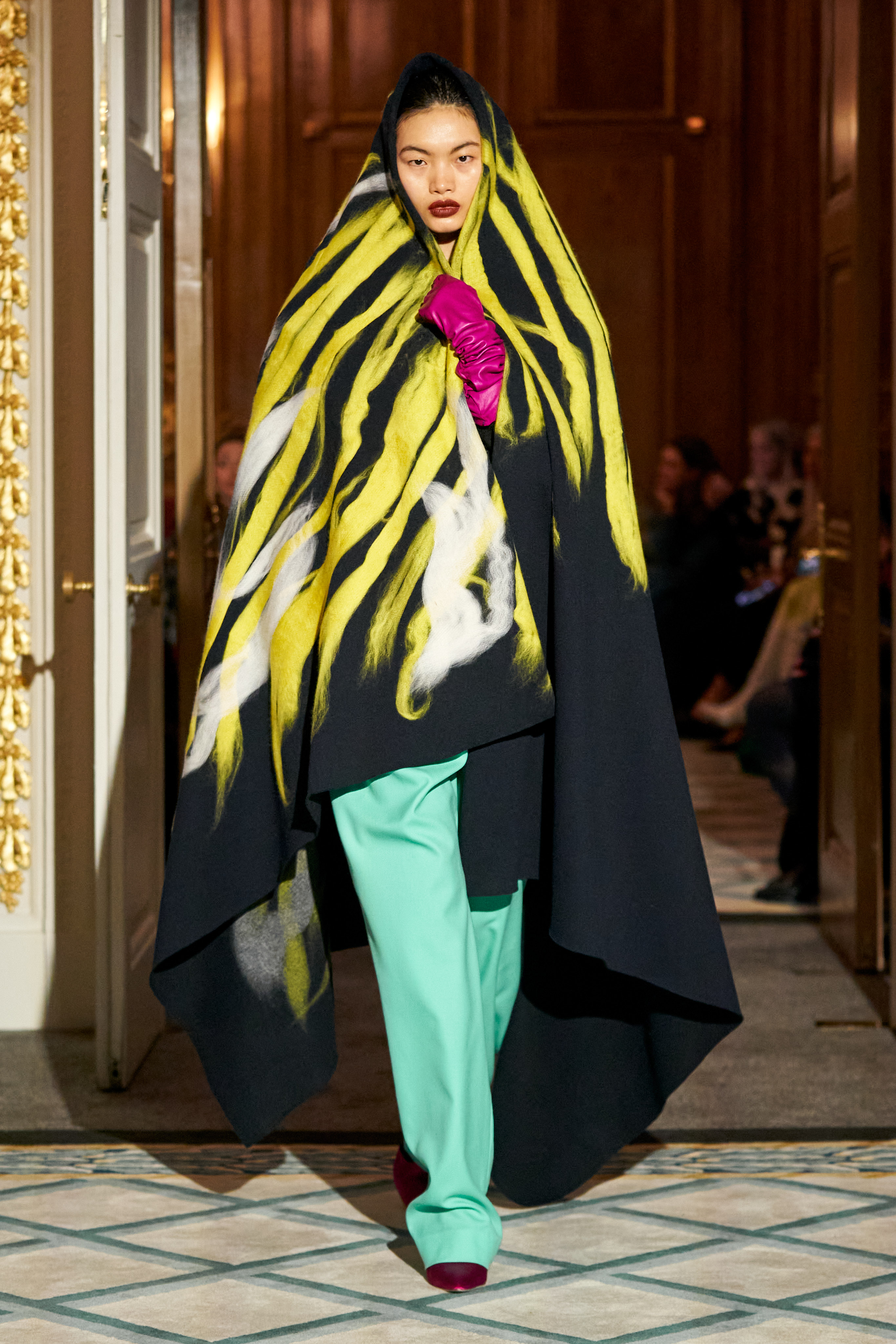 Championing the brand’s rich artistic oeuvre, abstract expressionism is interpreted as luxurious silks become canvases to explorative print techniques creating illusions of layered silhouettes, allowing multiple areas of color to create a distinct trompe-l’oeil effect. The technique is further extended to develop a fil-coupé fabric, woven onto a delicate silk organza base, from which gravity seems to be melting elements of the gown. Elsewhere, recycled crushed taffeta in foiled gold and silver are applied onto innovative architectural constructions allowing unexpected negative spaces. The thematic continuity of sheltering, unapologetic femininity, and a sense of refuge highlights the feminine body and its envelope — emphasized through delicate silks overlaid by floor-sweeping woolen capes.