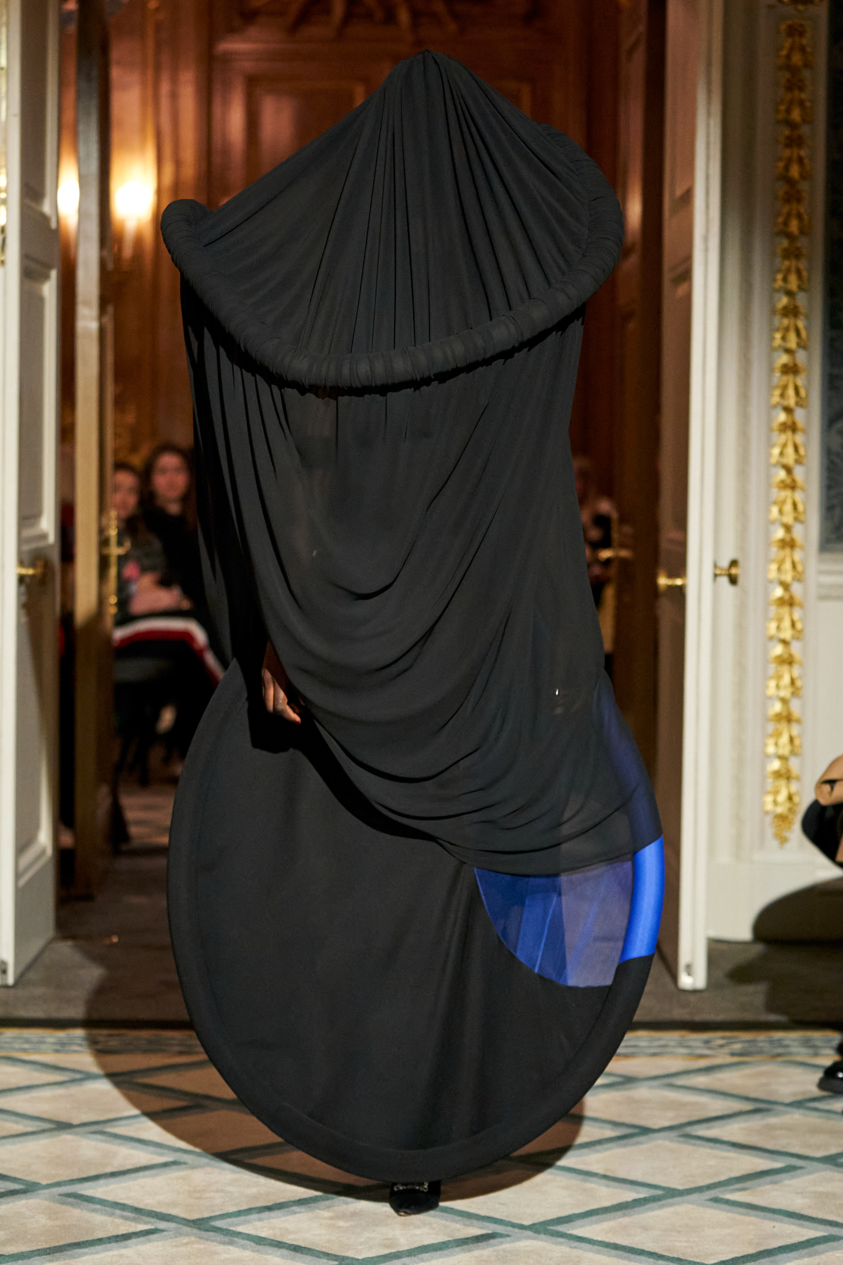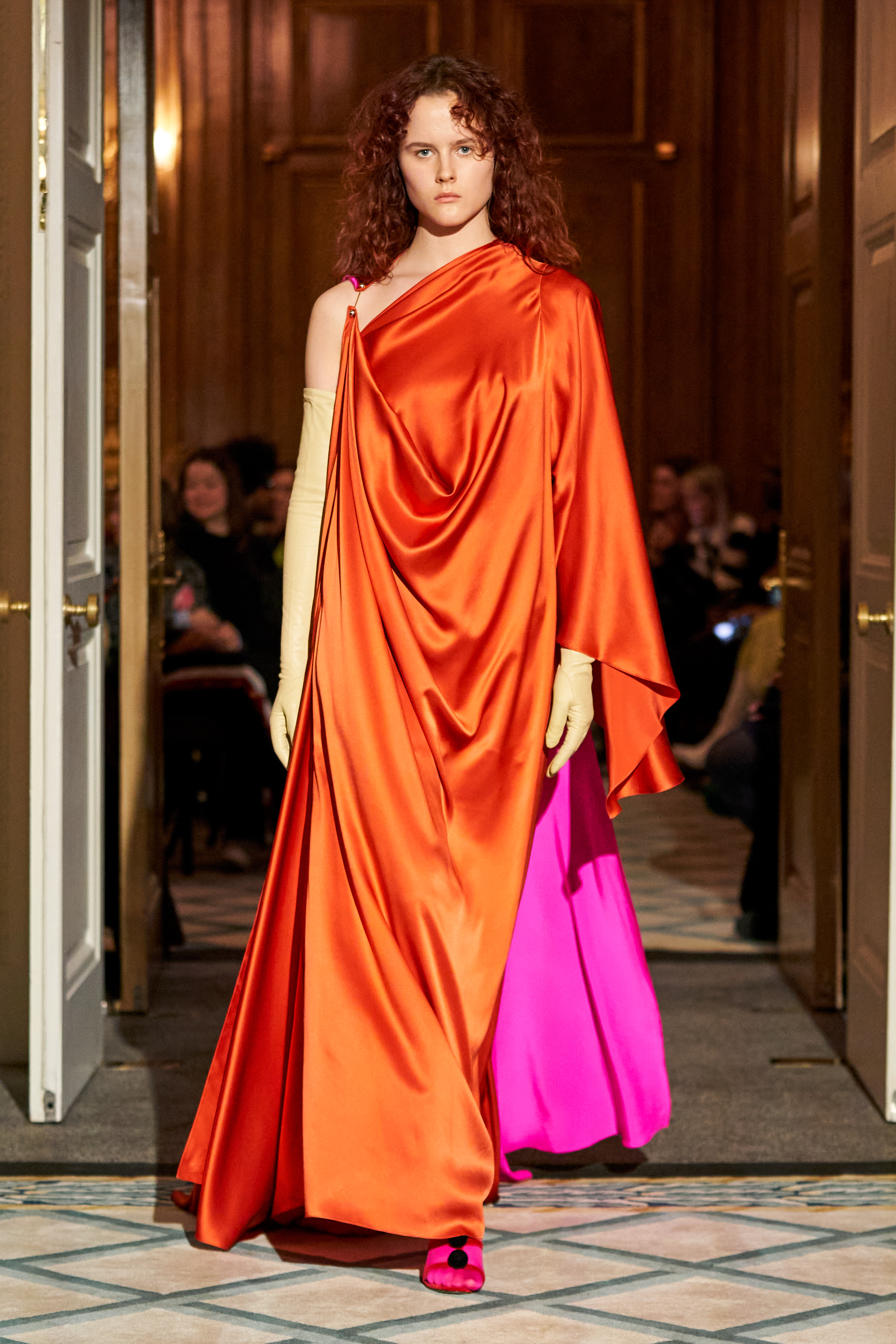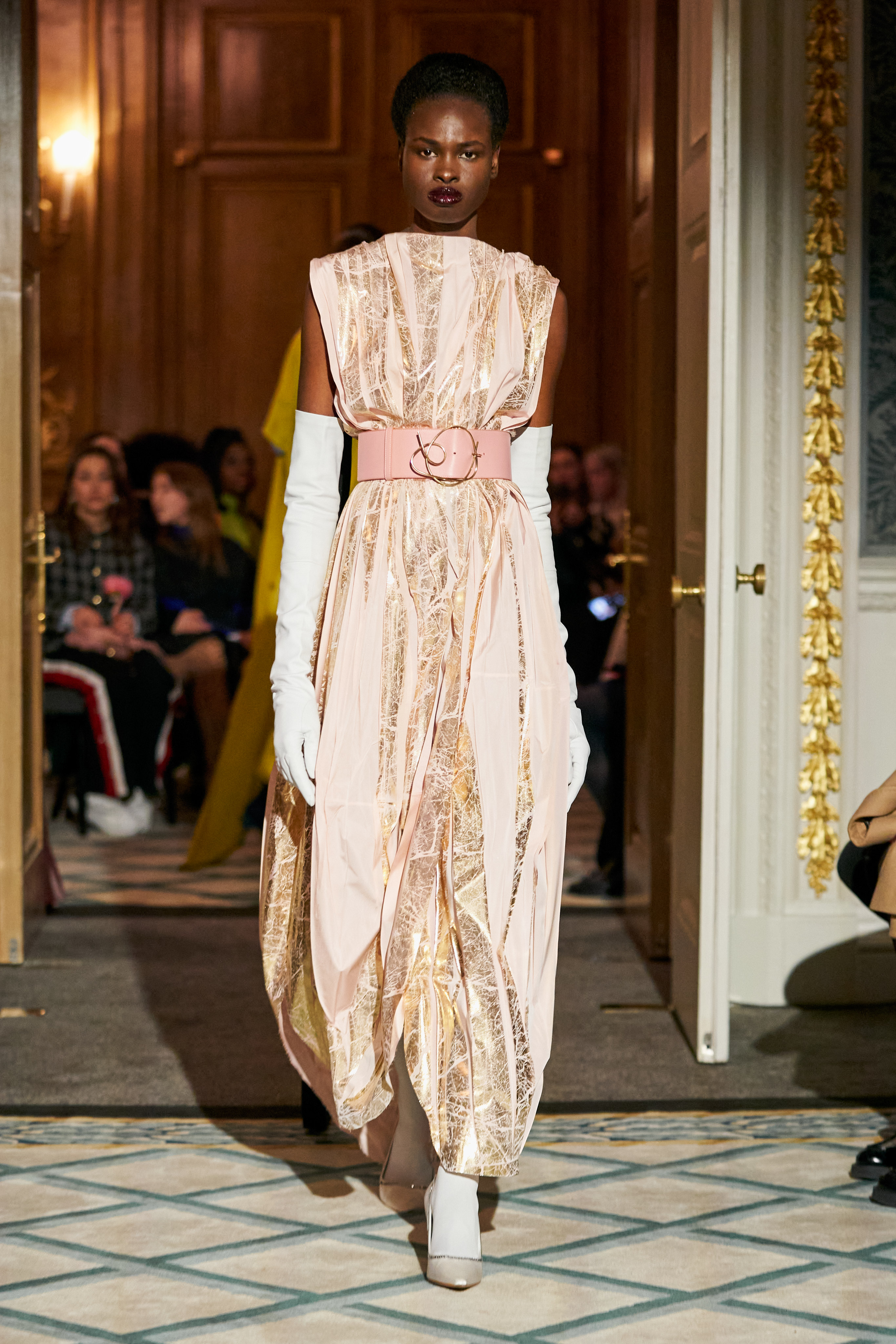 Championing the brand’s rich artistic oeuvre, abstract expressionism is interpreted as luxurious silks become canvases to explorative print techniques creating illusions of layered silhouettes, allowing multiple areas of color to create a distinct trompe-l’oeil effect. The technique is further extended to develop a fil-coupé fabric, woven onto a delicate silk organza base, from which gravity seems to be melting elements of the gown. Elsewhere, recycled crushed taffeta in foiled gold and silver are applied onto innovative architectural constructions allowing unexpected negative spaces. The thematic continuity of sheltering, unapologetic femininity, and a sense of refuge highlights the feminine body and its envelope — emphasized through delicate silks overlaid by floor-sweeping woolen capes.