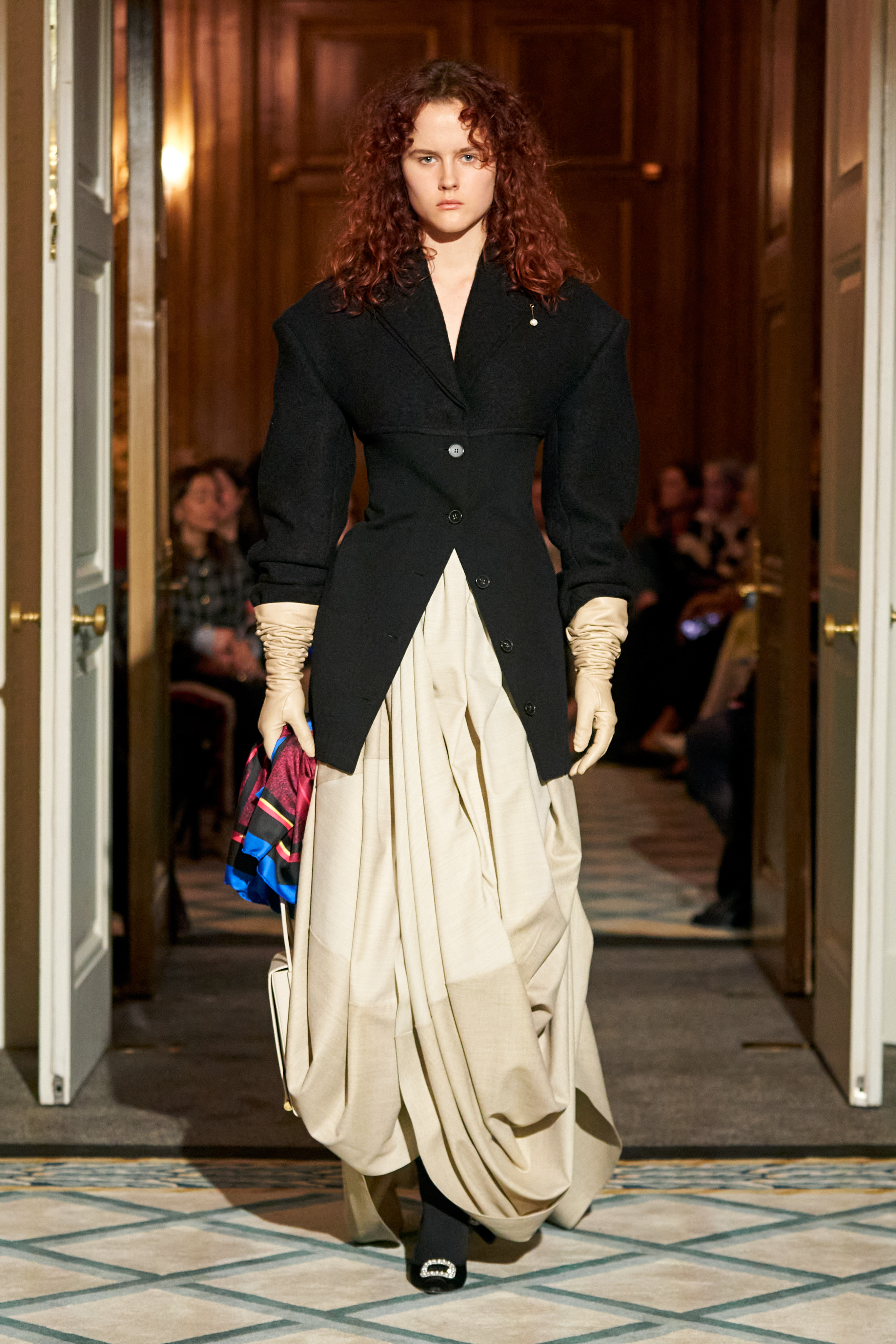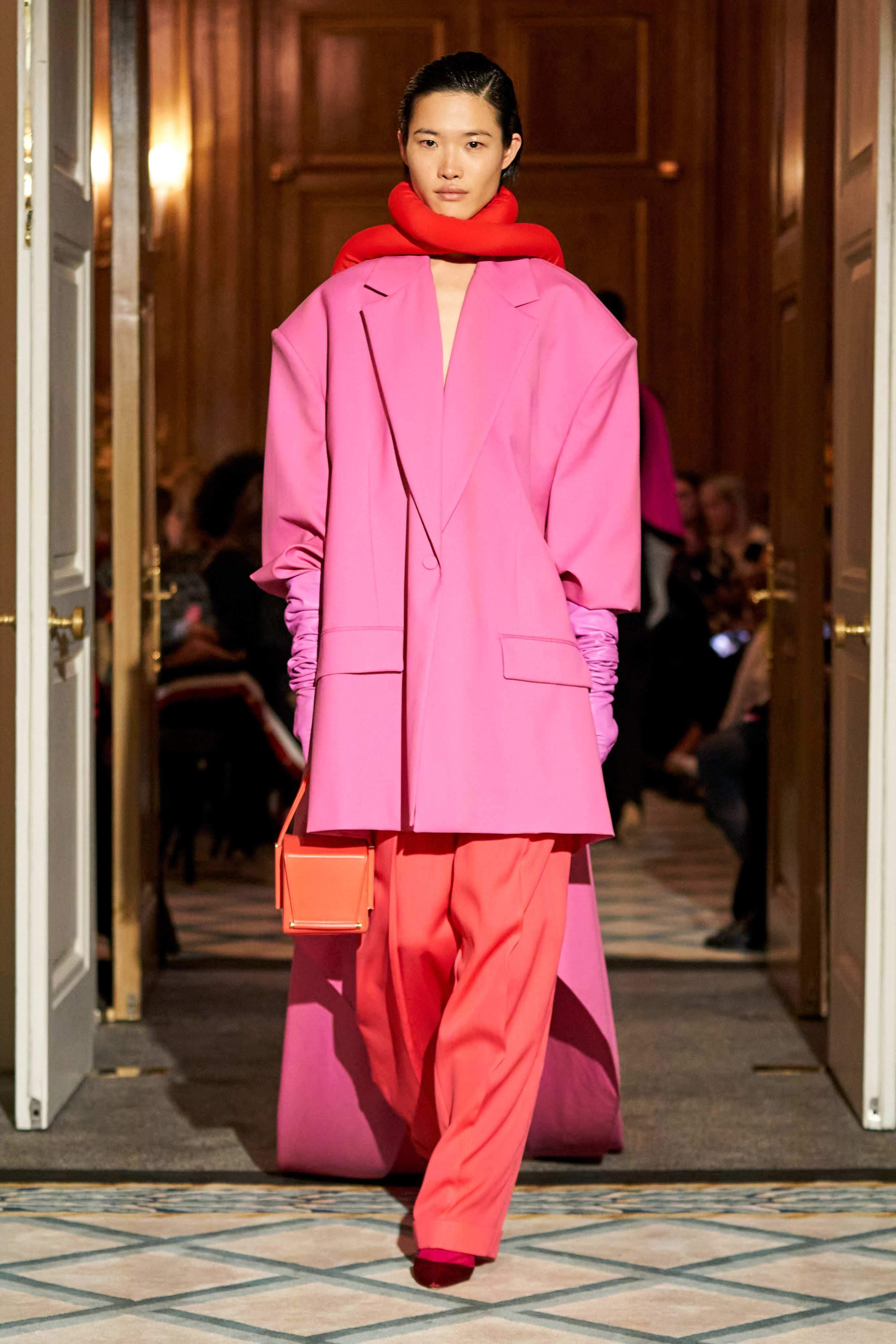 Tailoring and outerwear remains powerful while new structures are introduced through increasingly defined waistlines. Exaggerated proportions and extended panels of fabric wrapped around the bodice form new-found silhouettes, neither feminine nor masculine. Original hand-made patterns in bright crimson and yellow are applied by needle punching — using the artisanal technique Agugliatura to form organic, abstract lines, elevating fine wool coats and over-layers. Surface and swaths become one inseparable fabric.