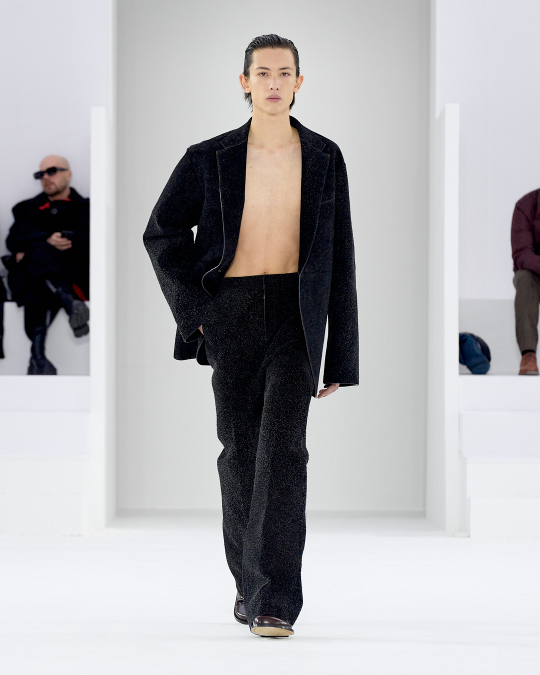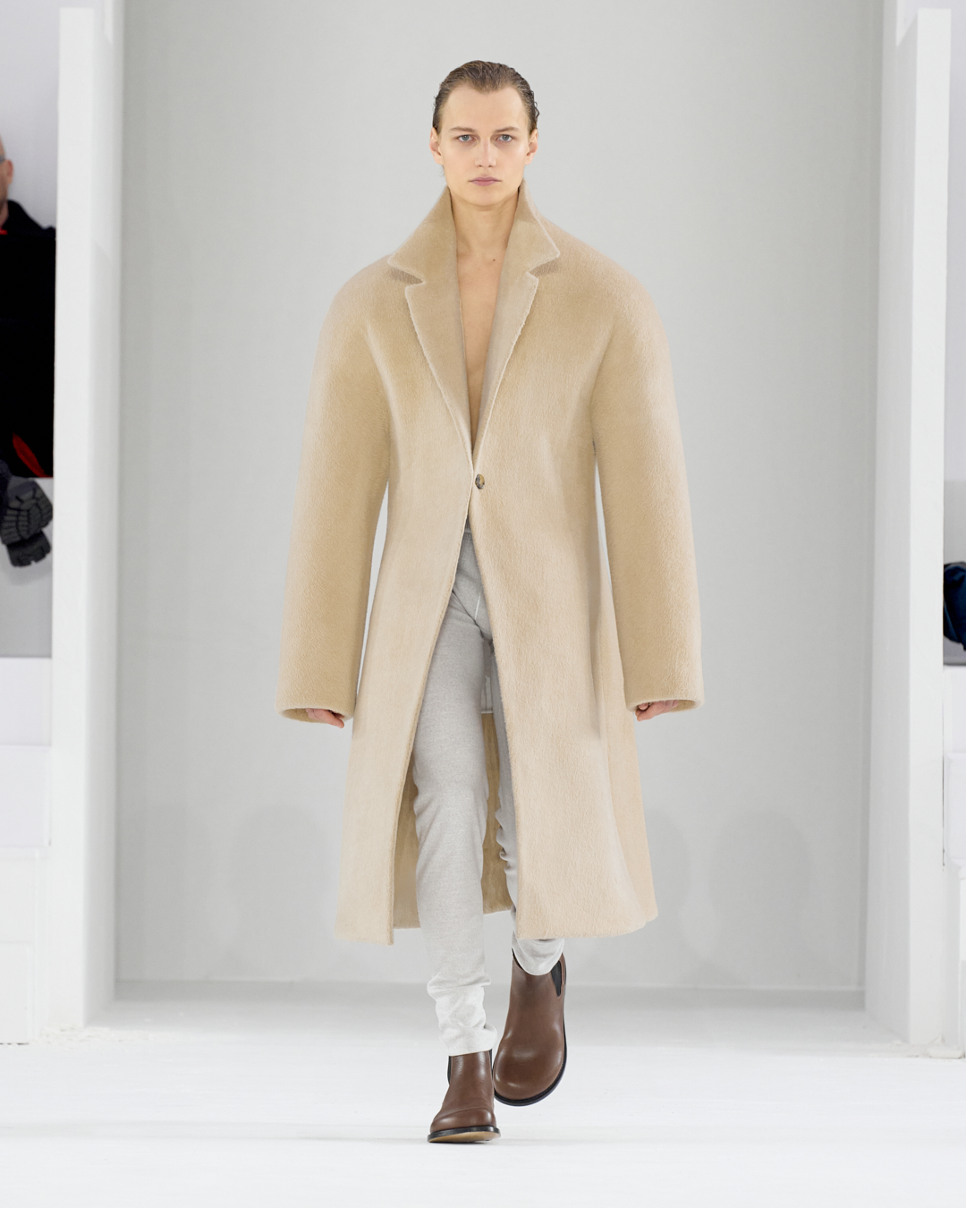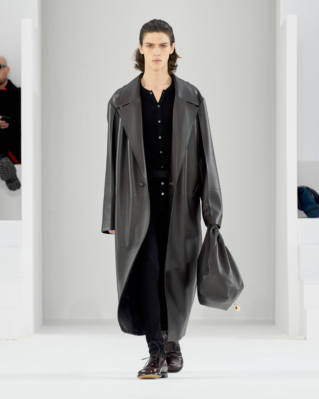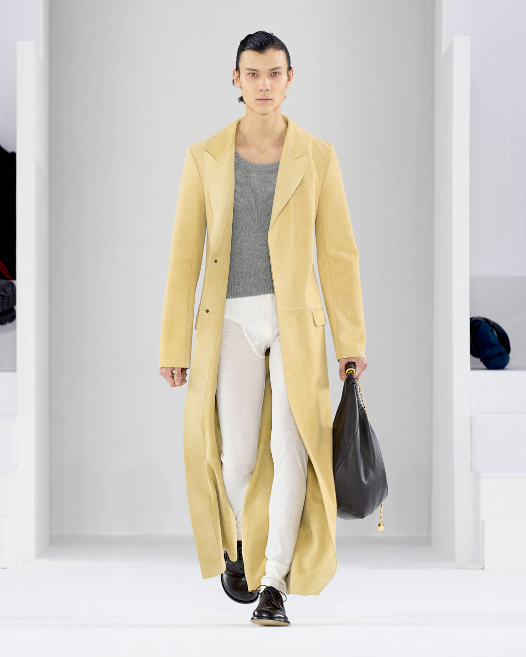 Shapes are molded, bended, frozen, tailored. A line is drawn, a fold is caught. A statement on pieces—the coat, the trench coat, the shaved shearling coat, the cardigan, the crewneck top, the slim suit—and undergarments. Oversized bags, round-toed boots and lace-ups. The contour, and what fills it. The Puzzle Tote bag introduces a supple new expression of the iconic Puzzle shape.