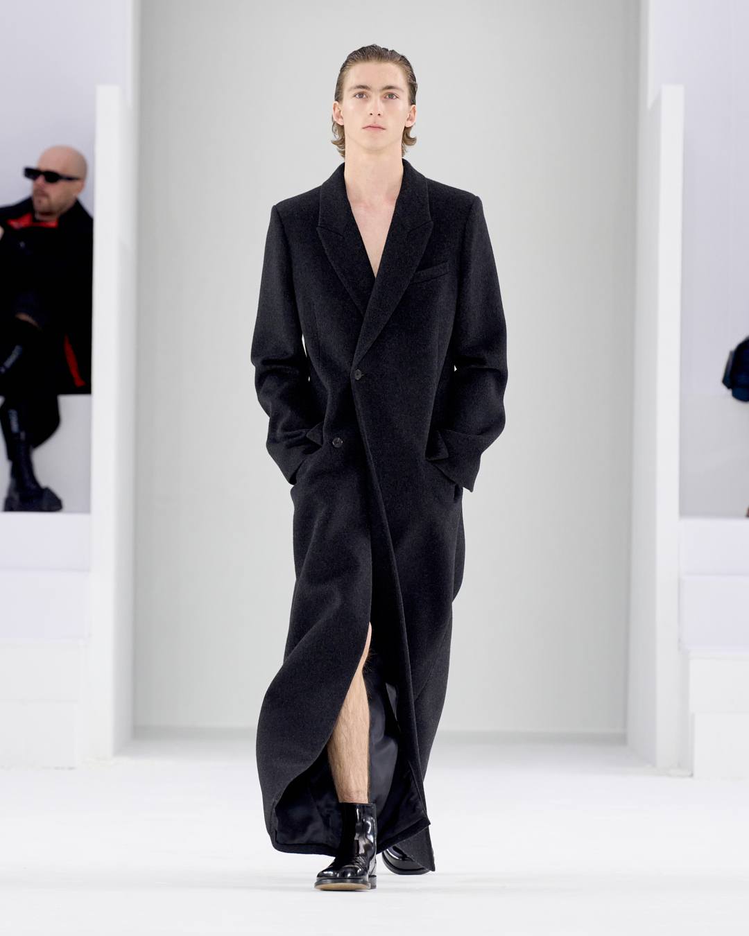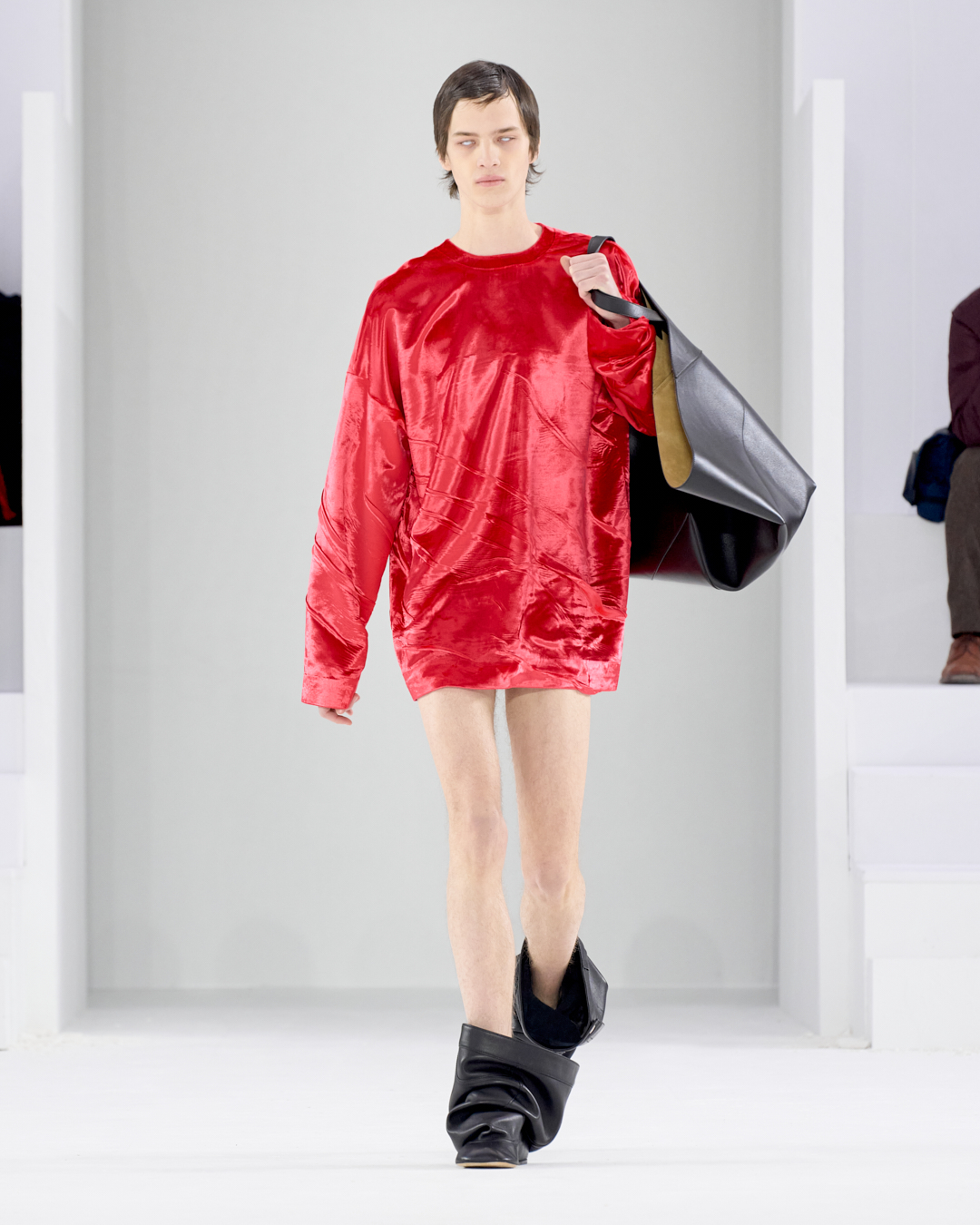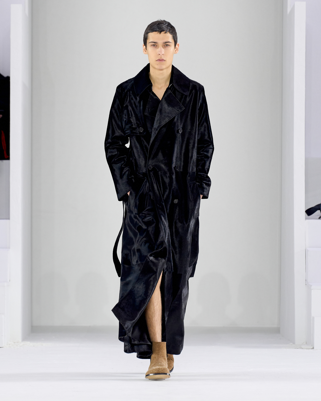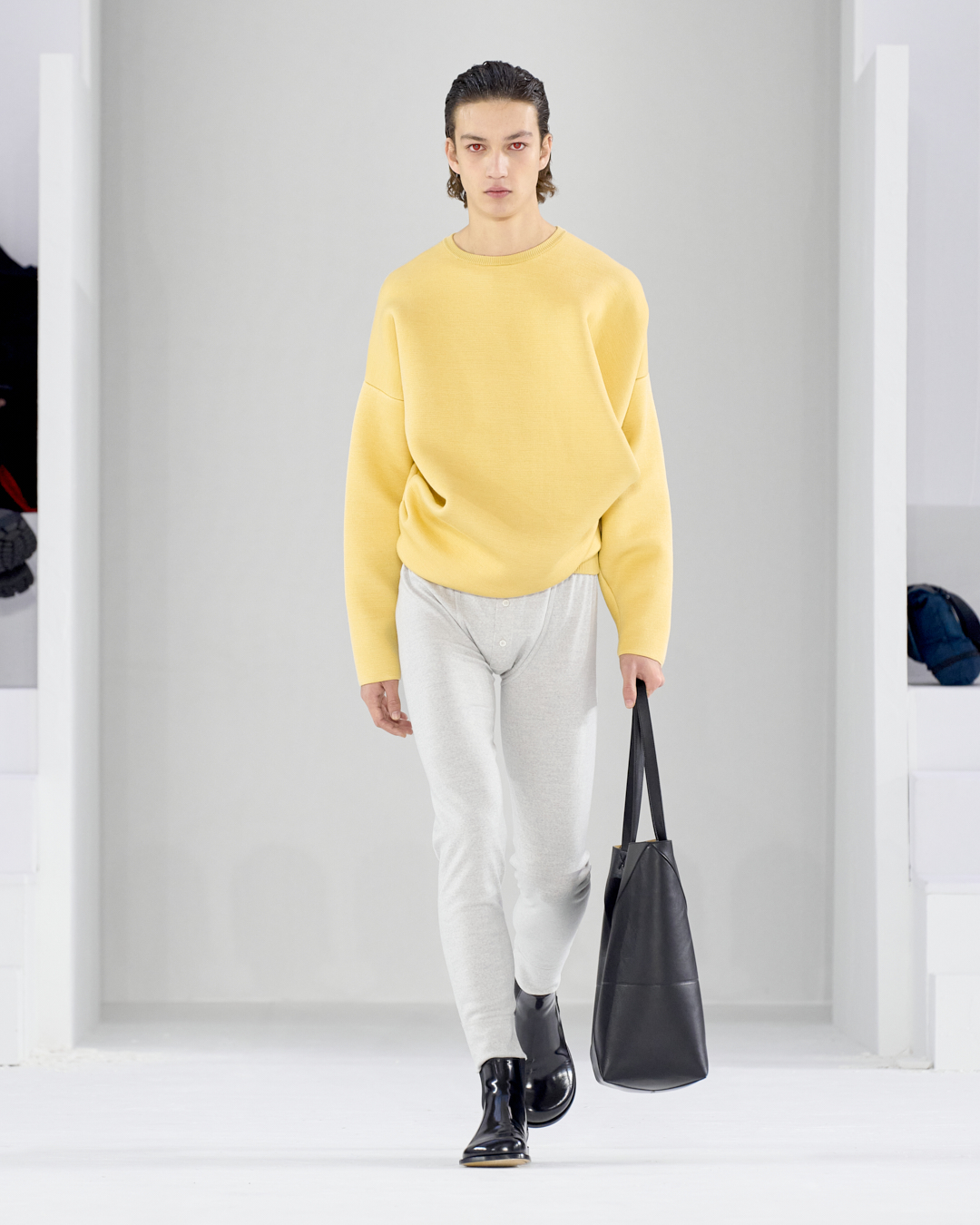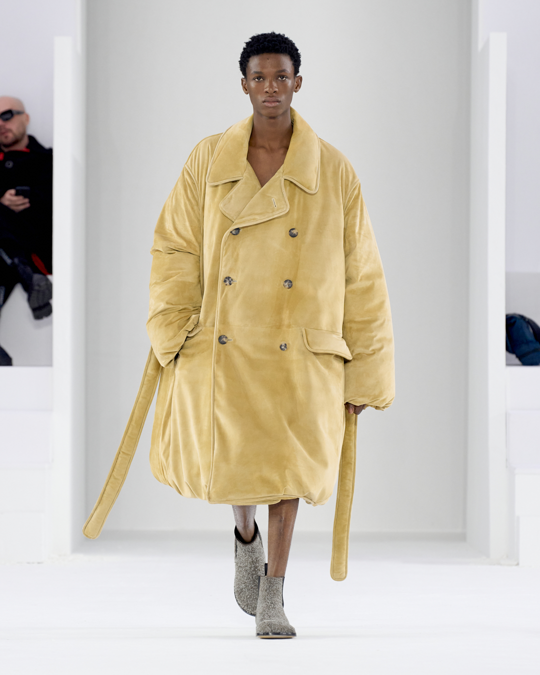 Shapes are molded, bended, frozen, tailored. A line is drawn, a fold is caught. A statement on pieces—the coat, the trench coat, the shaved shearling coat, the cardigan, the crewneck top, the slim suit—and undergarments. Oversized bags, round-toed boots and lace-ups. The contour, and what fills it. The Puzzle Tote bag introduces a supple new expression of the iconic Puzzle shape.