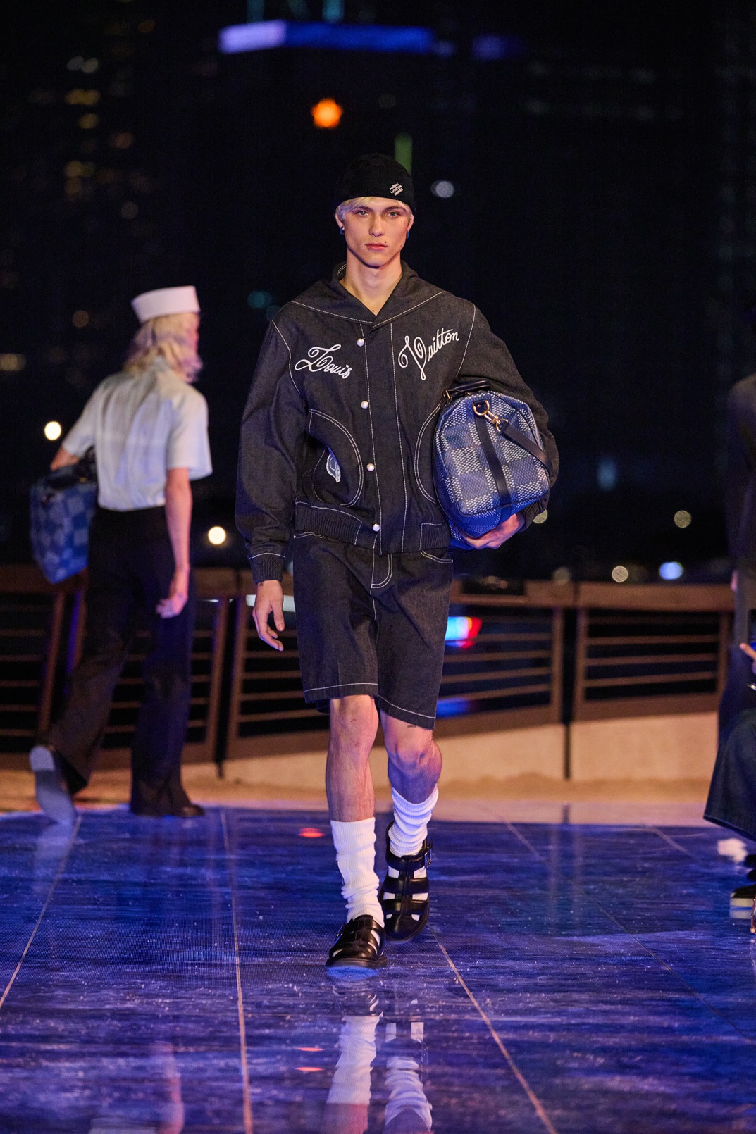 Patterns familiar to sailors are reimagined with unexpected elements. A new infinity LV logo latticed like net appears on a knitted cardigan, the jacquard of a suit and shorts, and the nylon sleeves of a mixed-material leather jacket. Elsewhere, indigo and washed-black denim shorts and shirts are bleached in the same latticing interpreted in workwear. Neptune – the Roman god of the seas and freshwater – appears in a pattern inspired by floral shirts typical of Hawaii, as well as a denim bomber jacket embellished with pearls and crystals, a nod to the lakes and fishermen of Virginia.