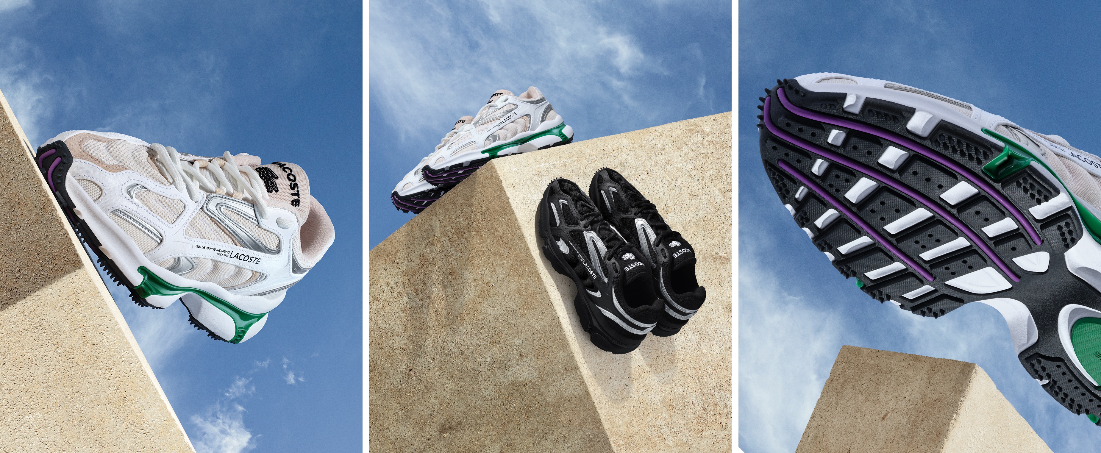 The L003 2K24 is the most elevated and intricate and meticulous incarnation of the L003 yet. The material quality is the very highest – and the shoe is lightweight and technologically advanced, ideal for movement and freedom. It comes with a soft and comfortable EVA midsole, and TPU reinforcement. There is also a multi-panelled upper, with mesh and suede and an eye-catching synthetic leather overlay, which comes with striking Lacoste branding printed on the side panel. The sneaker’s running codes are visible clearly in the sole – built for free-moving and designed to liberate every flex. It comes with special anti-slip spikes, specially developed for unrestrained action and perfectly in keeping with the “grounded” message of the campaign. Colour-ways include a timeless white-green, which nods to the palette of tennis and Lacoste’s heritage, and a classic all-black. Various multi-colour styles add energy and variation, including eye-catching green-black, yellow-black, orange-green and a refined red, white, and blue. Some colorways come with energetic flashes of metallic that nod to the idea of a shoe in constant speed and motion.