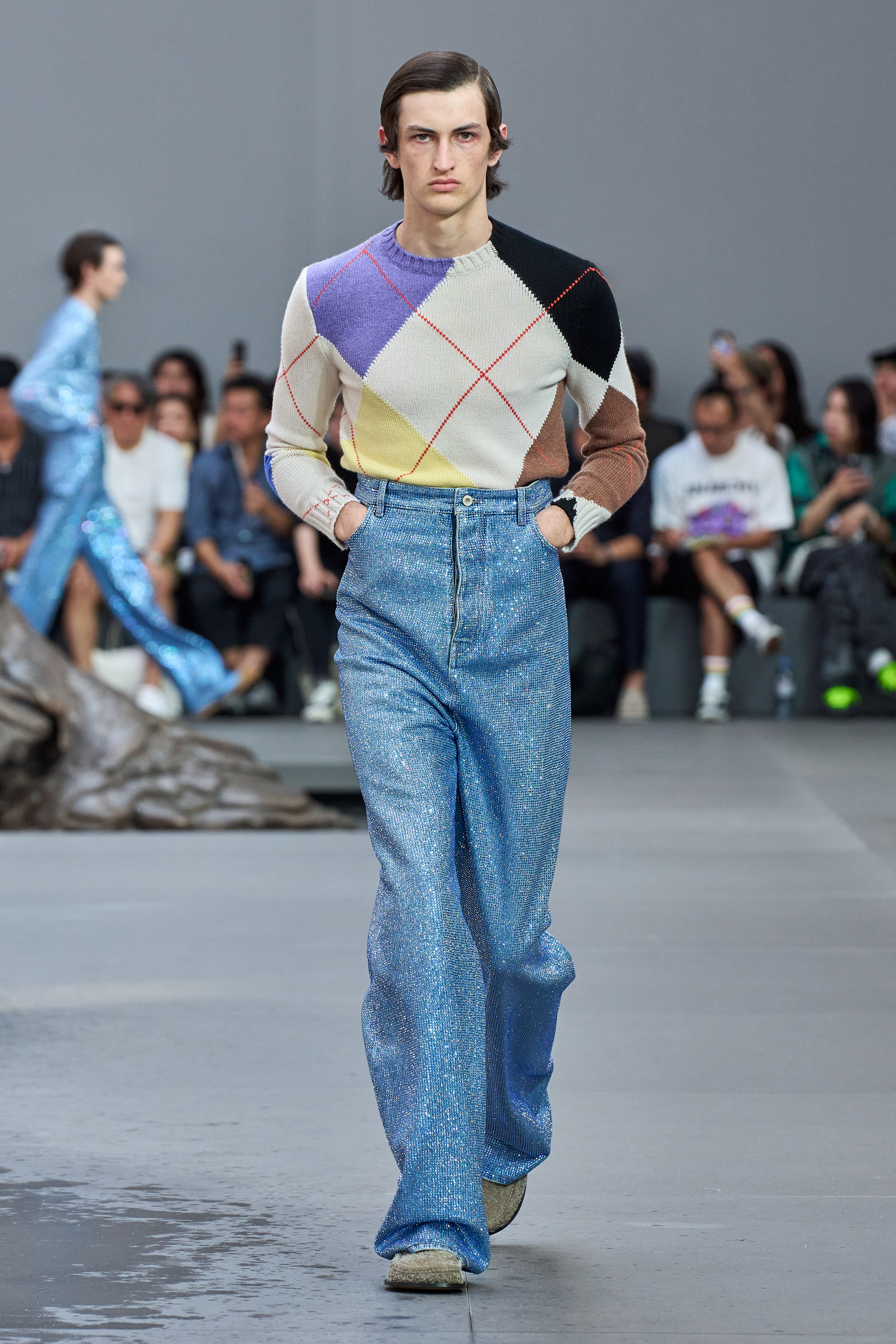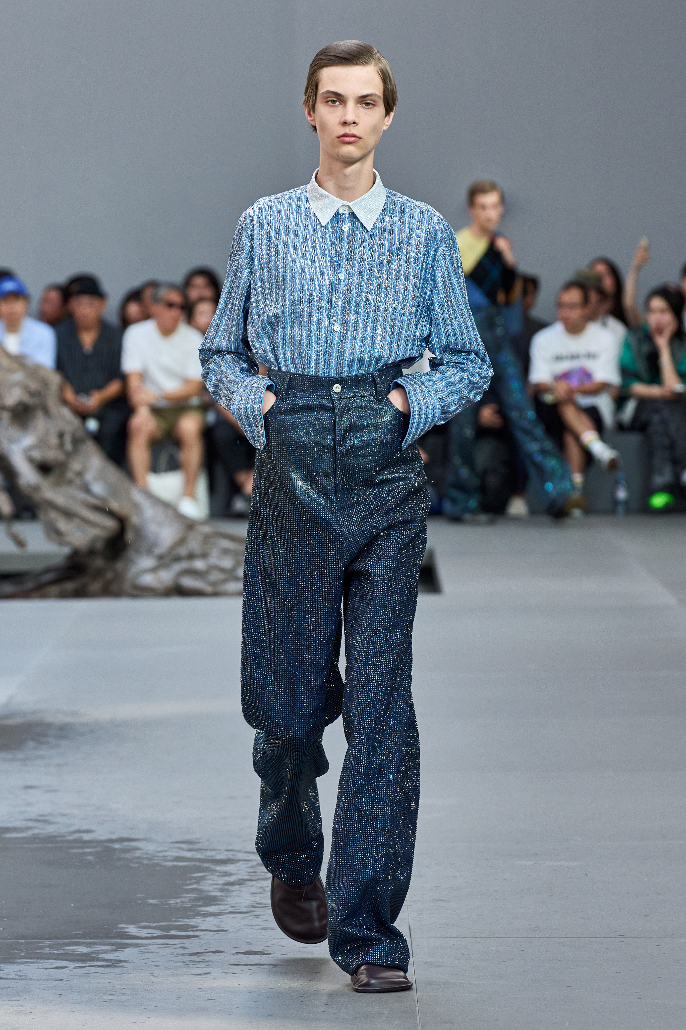 Elongation, gesture and an exploration of fabrication turn the straightforward into something not so straightforward, the subtle into the bold. Blazers, coats, banker shirts, knitted polos, twin-sets, argyle knits, jeans and chinos are what the collection consists of. Such apparent plainness deceives the eye, but it is twisted and turned. Crystals swarm over entire surfaces, like filters, or meticulously drawn stripes and pinstripes. Gestural cuts turn the body into a construction. Shoes grow into trousers, giving the impression of cloth coming out of the ground.
