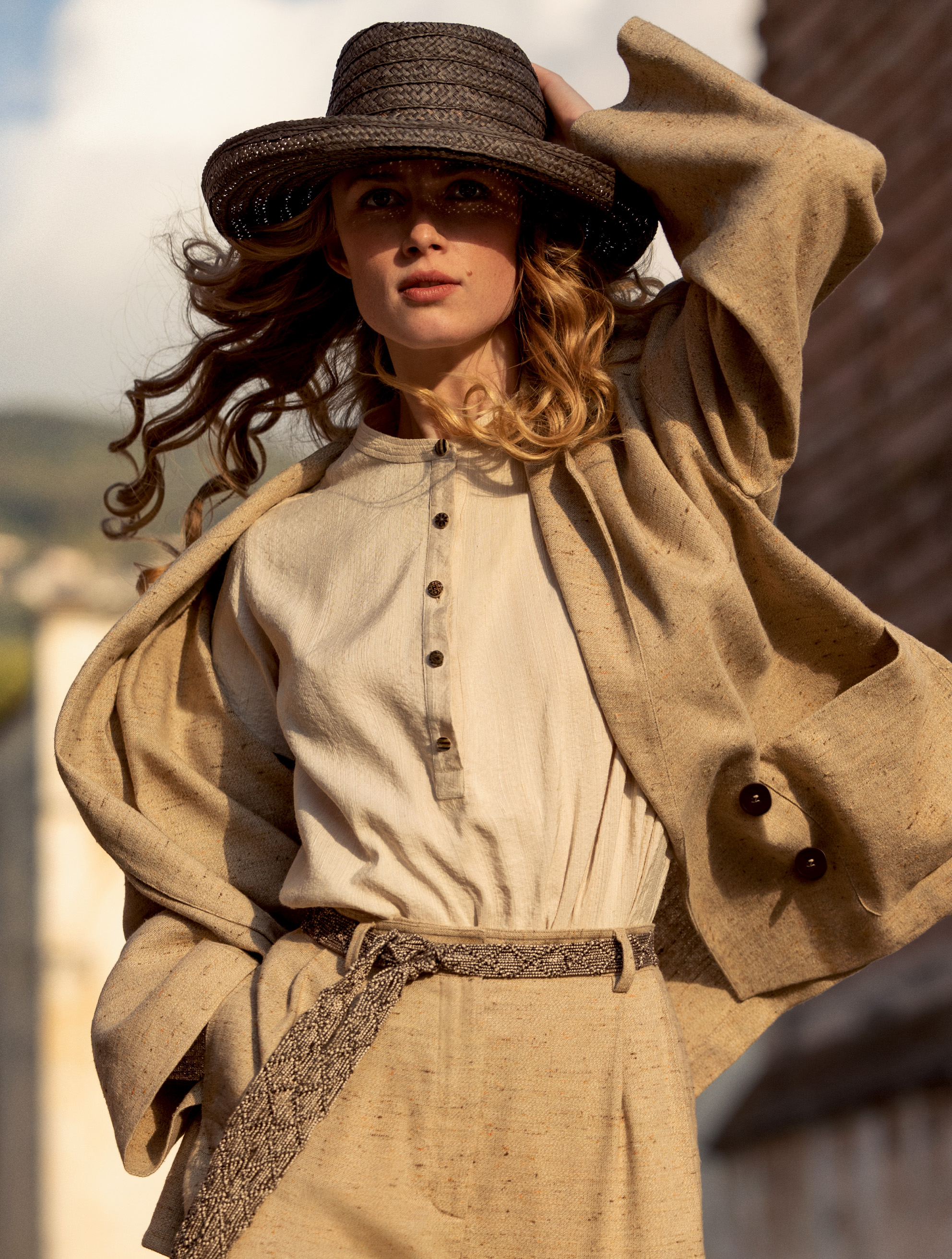The pictures highlight the flow of the shapes, the density of the textures, the ease of the colors in the collection, which is an Italian journey onto itself: a balance of the active and outdoorsy, of the languid and the mildly formal. Faultless tailored suits and airy dresses mingle with bouclé coats, knitted jumpers, and Loro Piana icons, in a mix of cottons, cashmeres, silks and linens in an earthy palette of natural hues.