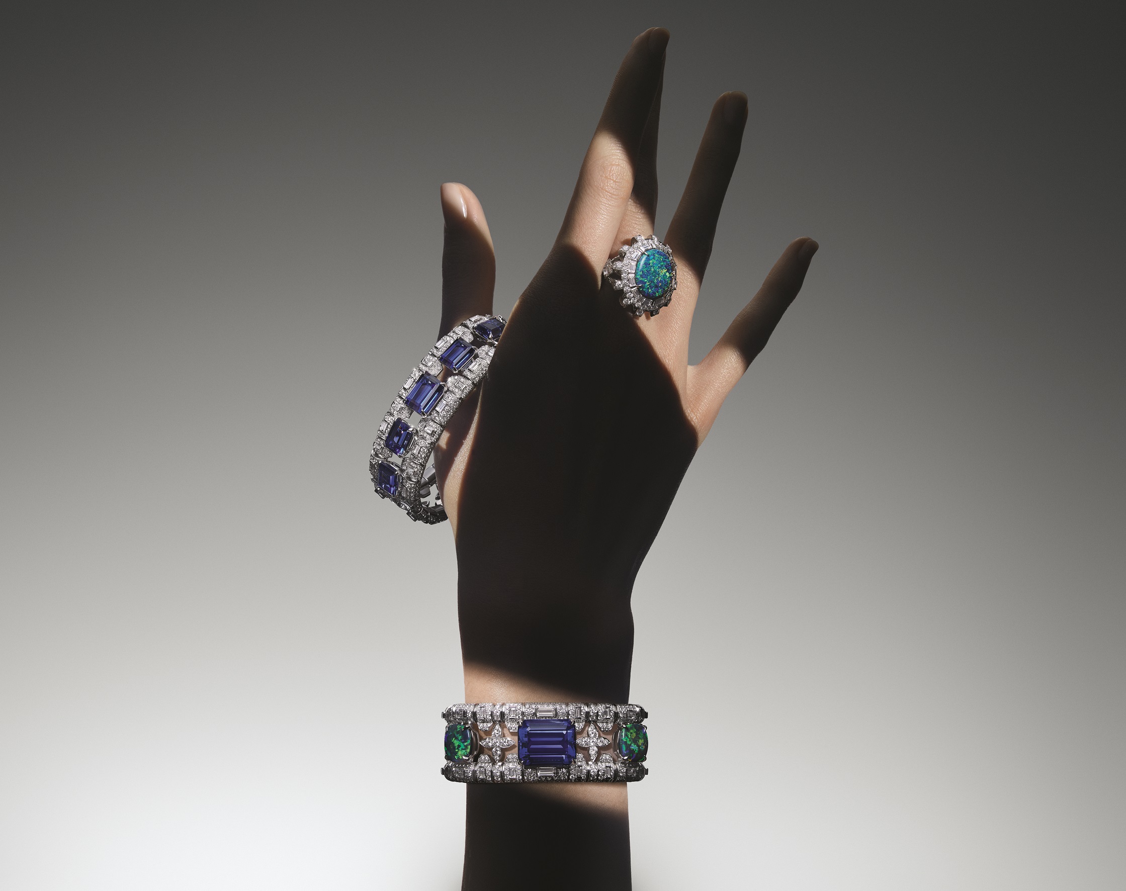 The statement-making bib-style jewel is the most complex necklace ever made in Louis Vuitton’s history. Featuring a symphony of stones of unparalleled luminosity and colour – not to mention a journey through the continents – the jewel is set with a 43.58-carat opal from Australia, a pear-cut 20.93-carat Paraiba tourmaline from Mozambique and a total of 91.74-carats of emerald-cut tanzanites from Tanzania. The tanzanites adorn the white gold and platinum necklace’s top collar, designed in a tubular motif that’s echoed in other Deep Time themes. This is spectacularly dangled with a sparkling mesh of fringes crafted from diamond beads, which are woven from alternating squares, rectangles and heights fashioned from more than 260 custom cut diamonds. Fluid and completely articulated, yet architectural and multi-dimensional, the necklace has been engineered to wear in four different ways, including detaching the Paraiba tourmaline to wear on its own. Also in the suite are solitaire opal rings and rakish opal brooches, as well as impressive earrings set with emeralds.