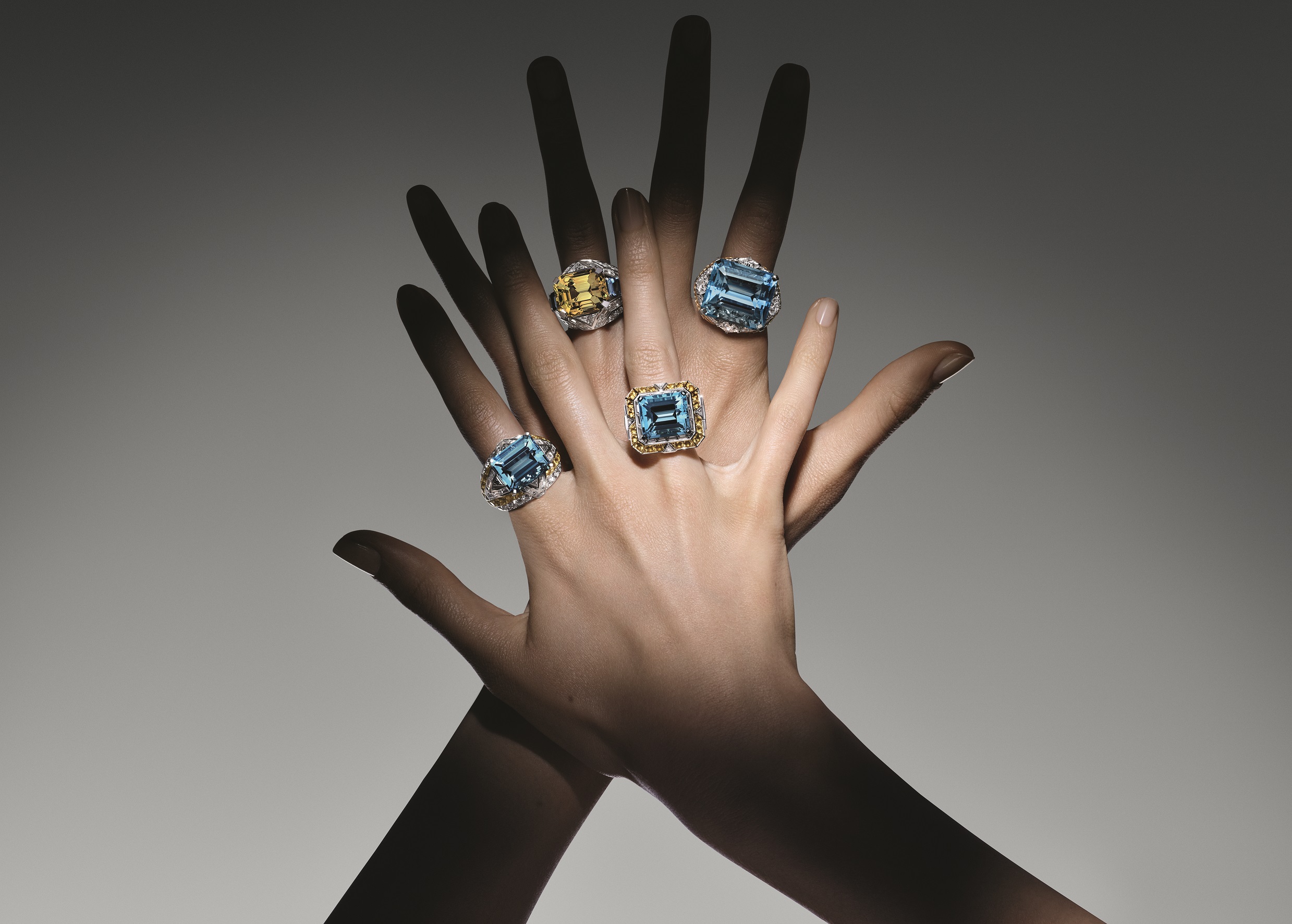 Drift is an ode to the sun and sea, as the earth settles into a new geological age that’s energised by the all-powerful sun, ushering in a new dawn of life. This lifeforce is locked in two main stones – lustrous and intense aquamarine and yellow sapphire – that make their way into a masterfully executed necklace that’s oozes the codes of the Maison. An openworked, interlaced white gold necklace reflects Amfitheatrof’s signature of jewelry as armour, where a zig-zagging, double tier construction of diamonds is the canvas to an astonishing layout of aquamarine and yellow sapphires totalling more than 194 carats, as 18 LV Monogram Star cut diamonds are interspersed between pitched V shapes. The graphic lines pulse with geometric rhythm, and the necklace showcases the High Jewelry atelier’s technical artistry and dynamism. A matching cuff and earrings once more play with Amfitheatrof signature mix of yellow and white gold. “We need water and sun – this is when life can begin,” explains Amfitheatrof. “Drift represents the beauty and balance of the planet as we know it today.”