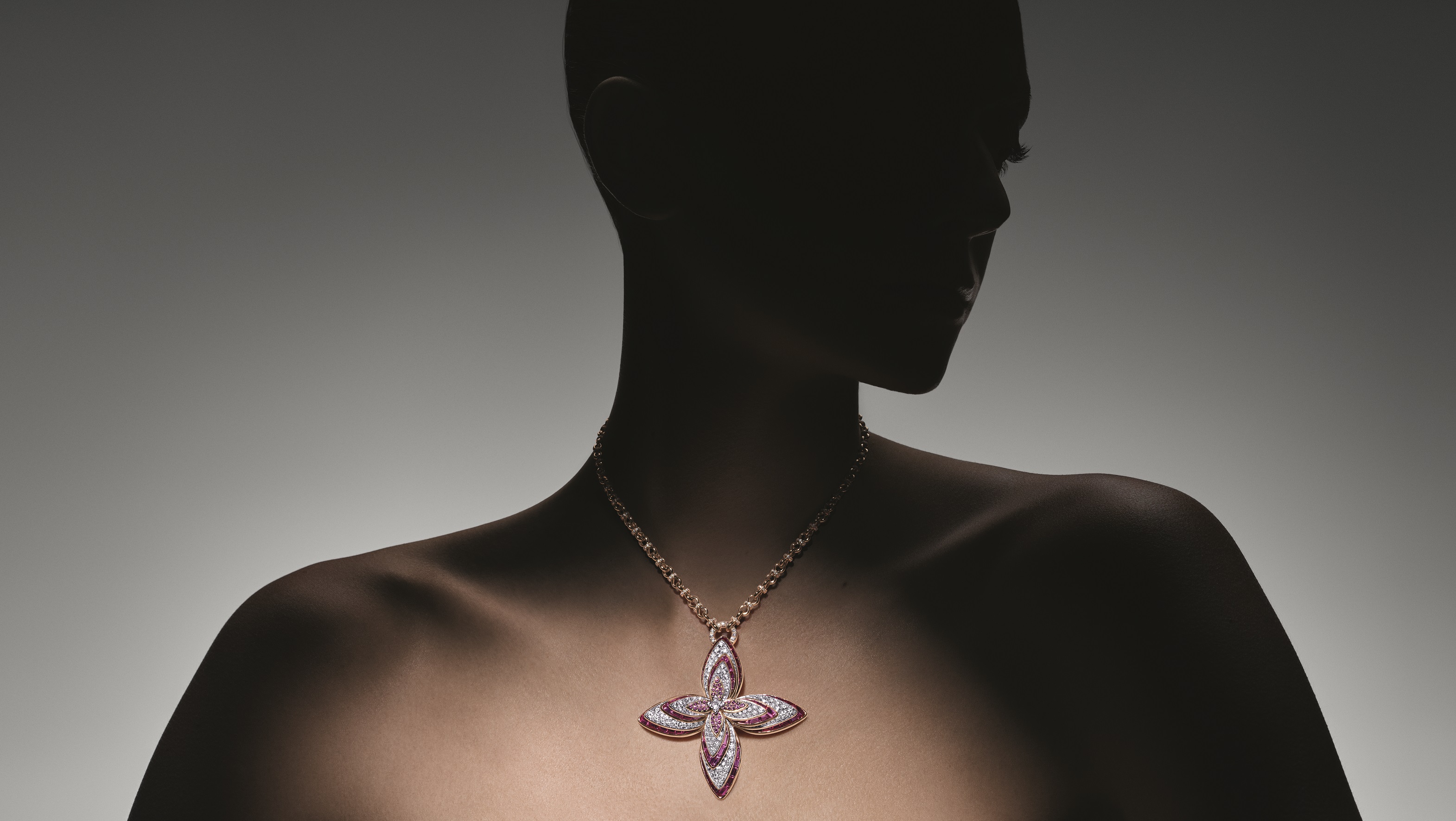 Seeds’ power and energy brings us to Flowers, the final leg in this epic tale. The theme is represented by an LV Monogram Flower that sparkles to life in a remarkable floral medallion necklace. Alternating, custom-cut raspberry-hued rubies and pink sapphires are intricately set into layered pink and yellow gold petals, which radiate from a single LV Monogram Star cut diamond. Suspended from a gold chain of interlocking diamond pave rings and links, the flower also adorns earrings and a ring.