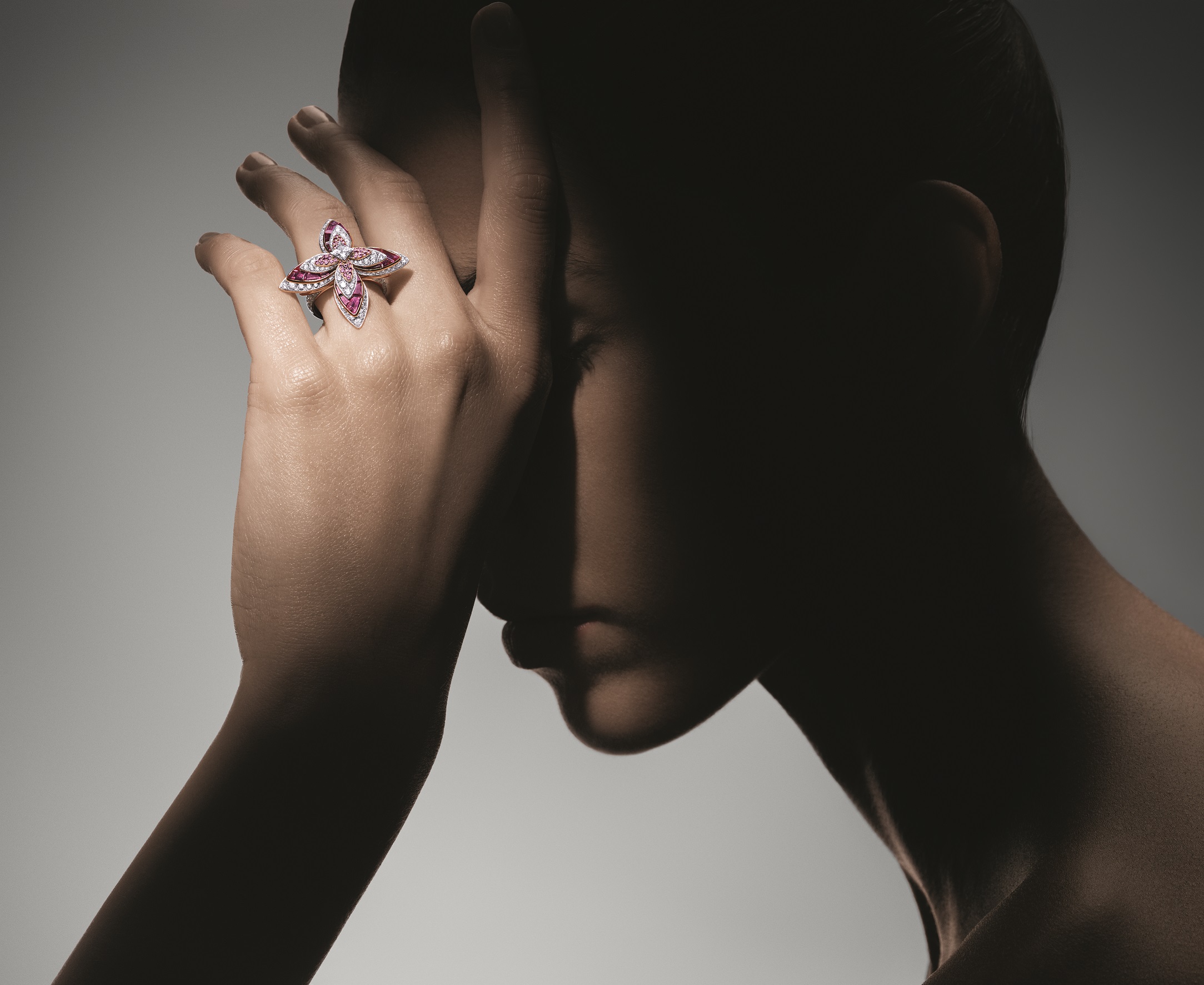 Flight takes to the skies and celebrates birds, one of our planet’s oldest species, illustrated through a beautiful pairing of diamonds and ruby. At 15 pieces, Flight is Deep Time’s largest suite and evokes the floating lightness of feathers, capturing that moment when a bird takes flight. A versatile and transformable cocktail ring – set with a 7.67-carat pigeon’s blood Mozambique ruby – is one of Deep Time’s most important stones; the ring can be worn as either a pure solitaire, flanked by two LV Monogram Flower cut diamonds, or worn with an accompanying bejewelled party jacket that dresses up the solitaire in diamond wings. There are also several earrings and brooches, as well as two necklaces featuring strings of rubies, which again took years to colour match to perfection. Finally, a necklace crafted from individually carved feathers take on the shape of wings, exuding volume and sensuality. The wings curl into the shape of V, a remarkable 4.17-carat ruby nestled within.