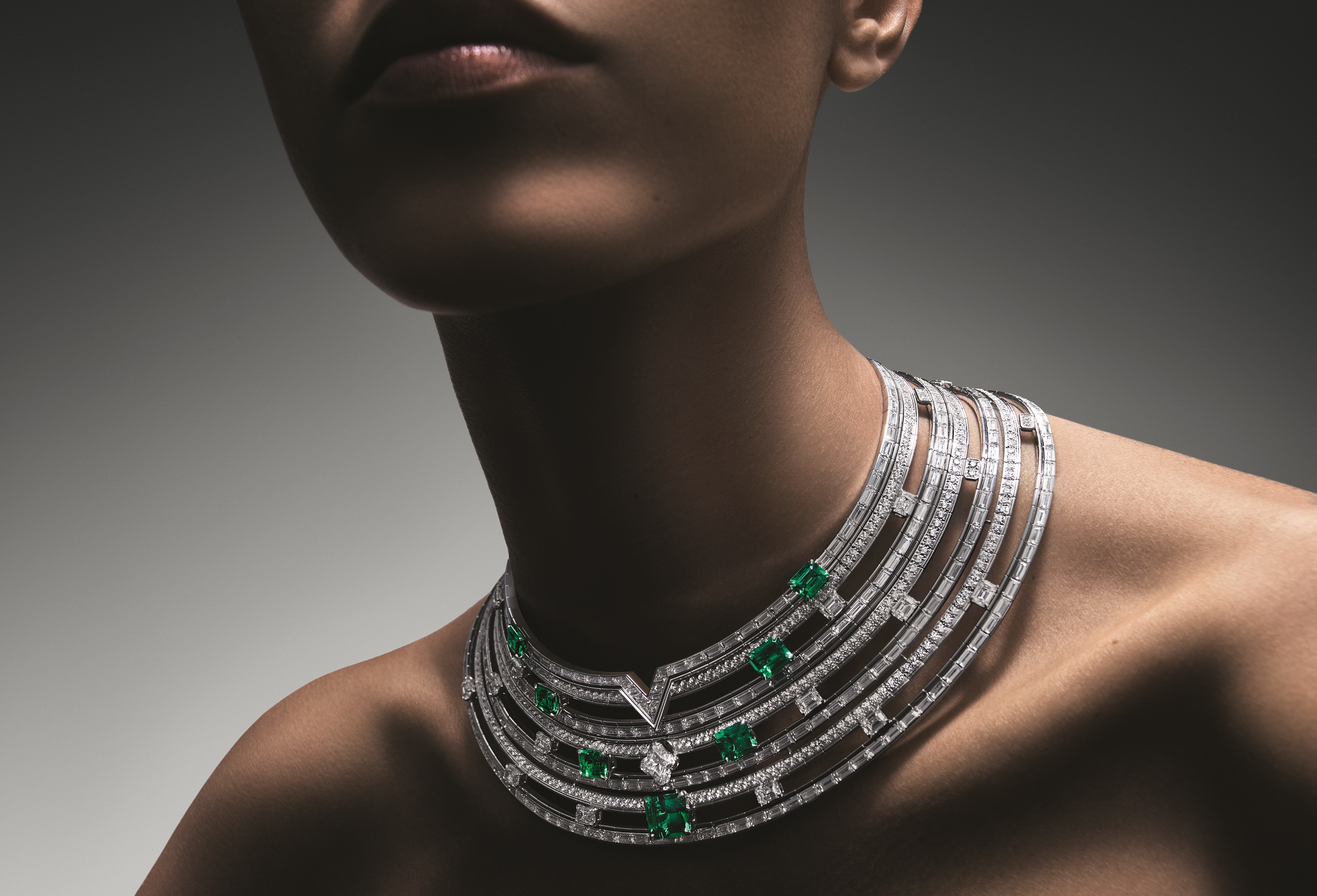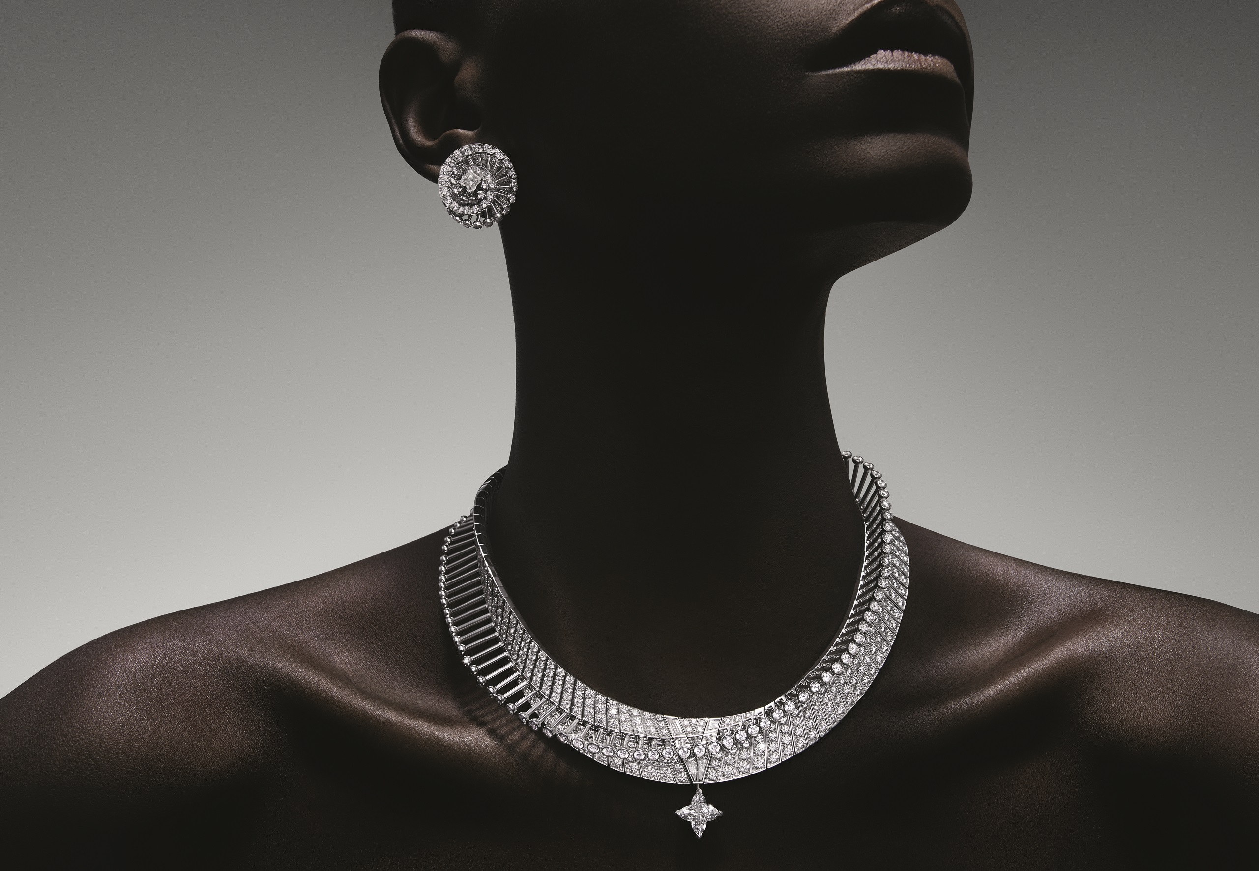 With a spiralling, sensual wave of diamonds that curve into a subtle V shape, the jewels exude both grace and strength. A necklace and matching cuff are notably set with a row of individual bejewelled nails, not unlike the keys of a piano, each one set en tremblant with its own diamond, bringing shimmer and movement to this intricately made and ultracontemporary design. The necklace also features a detachable 4.11-carat LV Monogram Star cut diamond that can be worn on a matching chain.