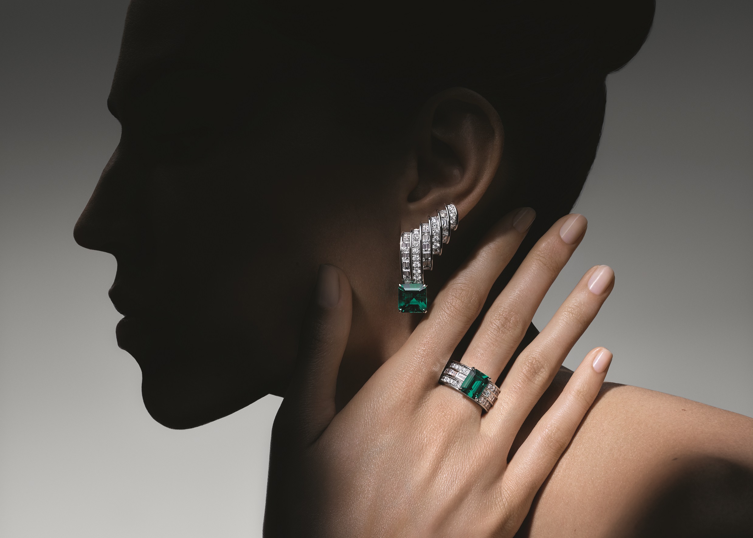 The epic tale begins with the supercontinent Gondwana, one of two landmasses that today covers the continents of South America, Africa, India, Australia and Antarctica. This expansive interconnectedness finds expression in a super rare layout of exclusively no oil Colombian emeralds. A spectacular seven-row platinum necklace echoes the earth’s circular movement, punctuated by the Maison’s signature V motif, which takes shape via seven exceptional emeralds that dovetail into a V formation, culminating in an exquisite 4.51-carat emerald with a rare blue hue and impeccable saturation. Elegant and architectural, the necklace features 259 custom cut diamonds and is complemented by an ultra-modern pair of earrings that outline the shape of the ear and set with two emerald-cut emeralds for a total of 9.29-carats. Meanwhile a ring featuring an outstanding emerald-cut emerald of 8.08-carat is classically set to highlight the stone’s rarity.