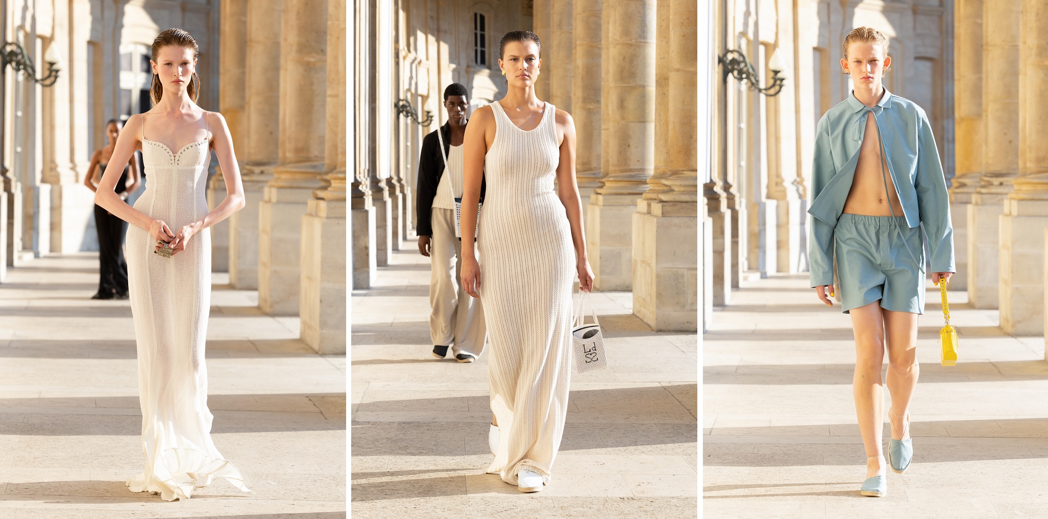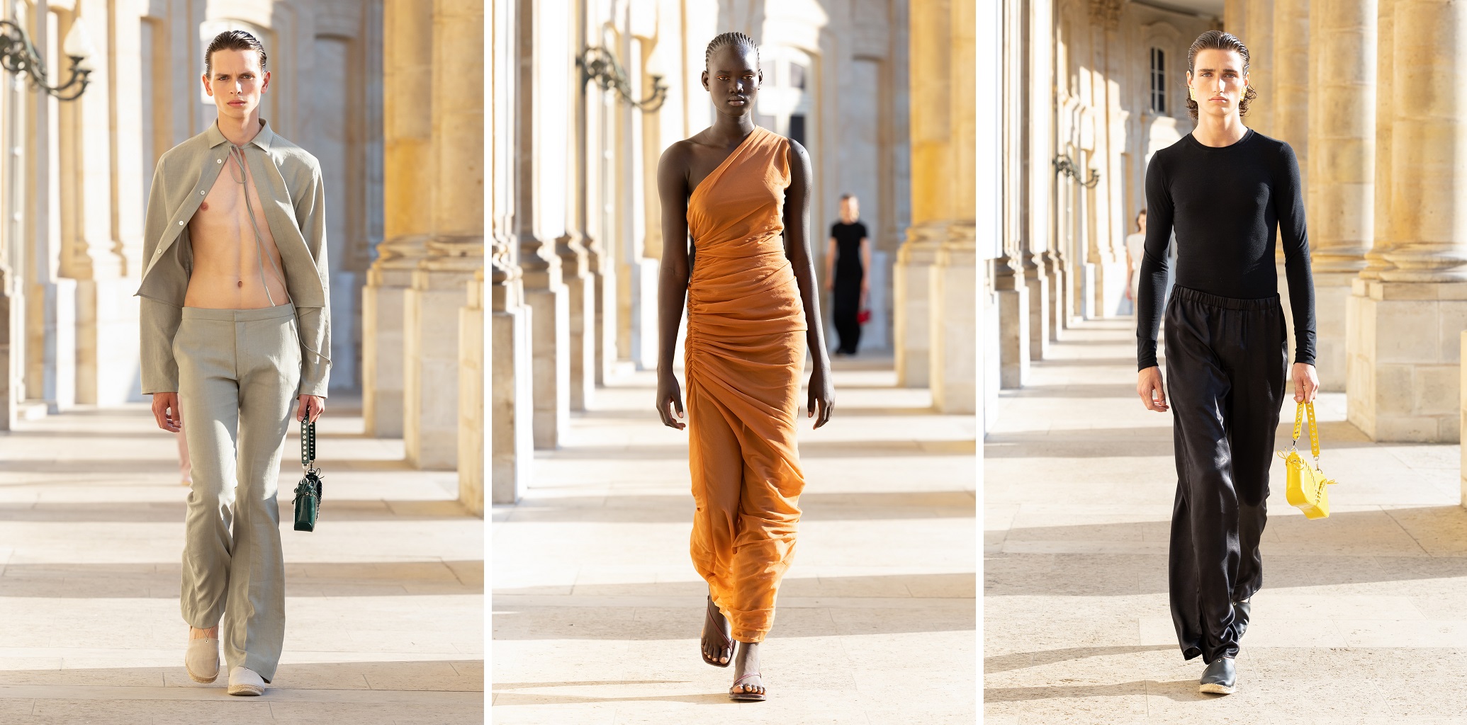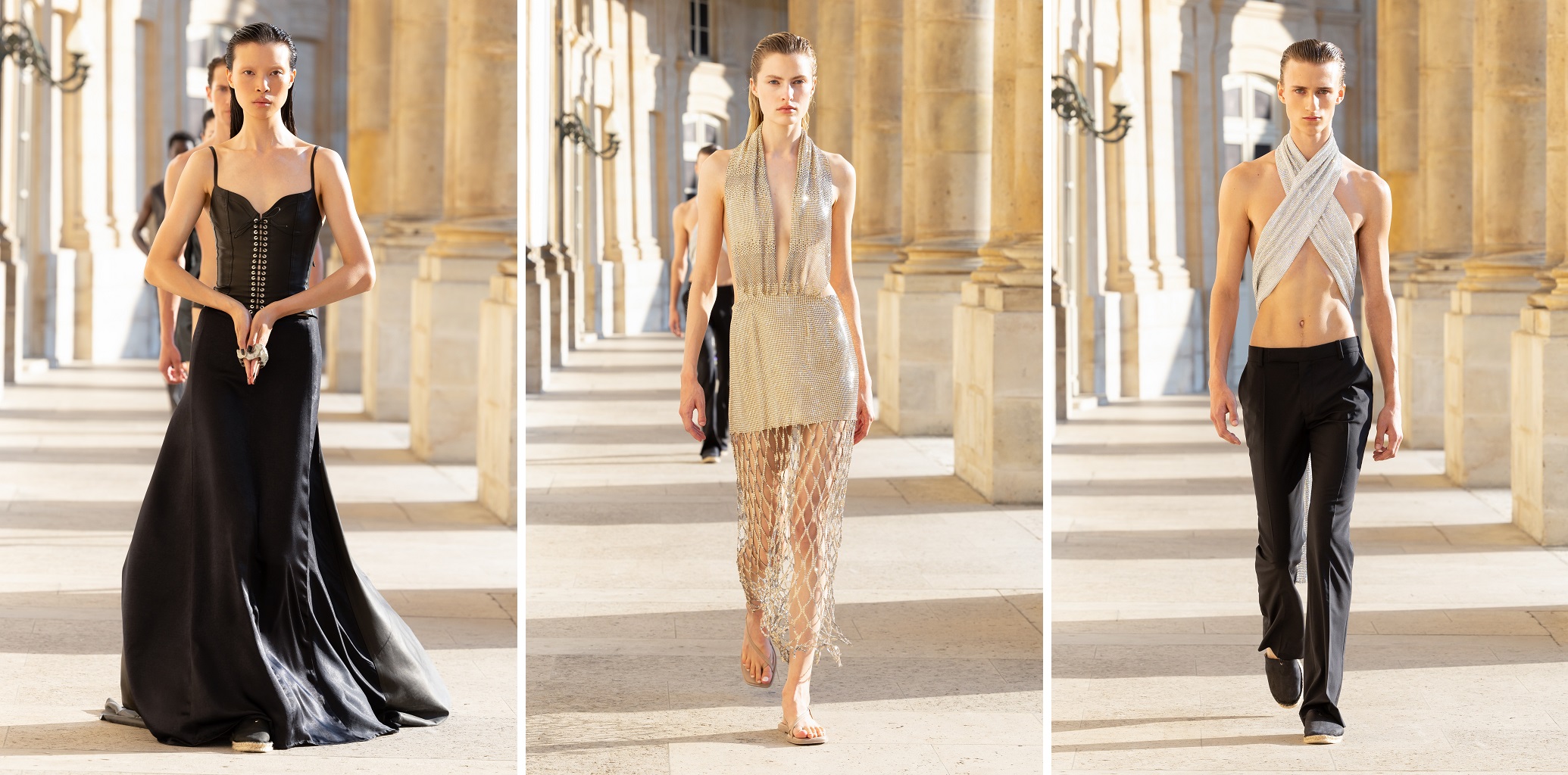 The staples of Ludovic de Saint Sernin’s material lexicon are adamantly celebrated, with the fundamental role of leather in the brand’s universe resulting in minimal square-cut moto racer jackets, harnessed bralettes and lace-up briefs in supple lambskin. Cropped denim jackets, gilets and relaxed jeans figure in a palette spanning dusty rose, olive, cerulean and taupe, while front-slashed, net-hemmed gowns, halterneck sash tops, and monogrammed totes are crafted in glimmering crystal mesh, generously sponsored by Swarovski, by Ludovic’s own hand.