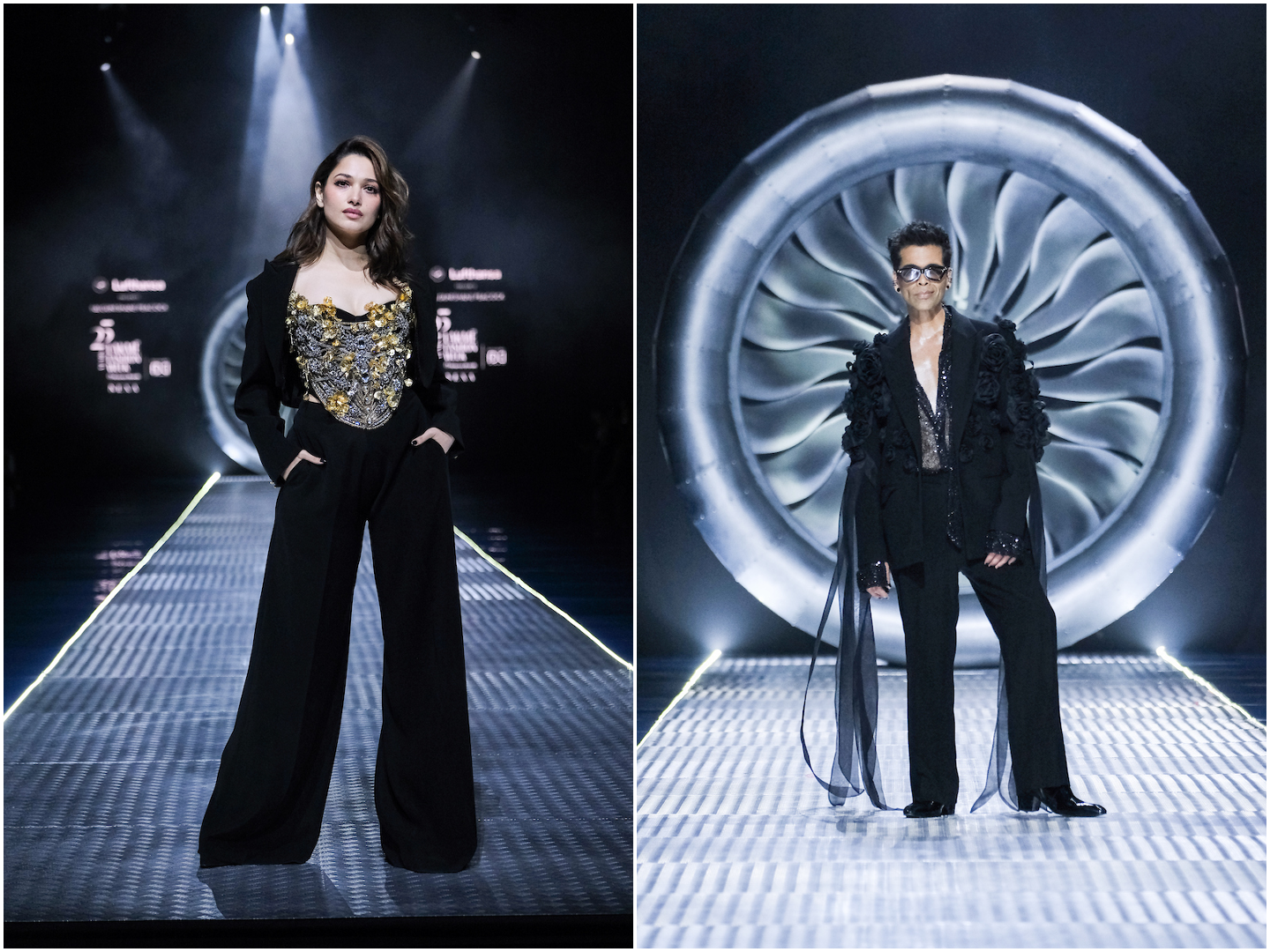 Tamannaah Bhatia opened the show in a fierce black bejewelled ensemble, channeling the untamed energy of the designer's iconic panther logo, while Karan Johar made a showstopping landing in a sheer black shirt and rosette-embellished jacket.