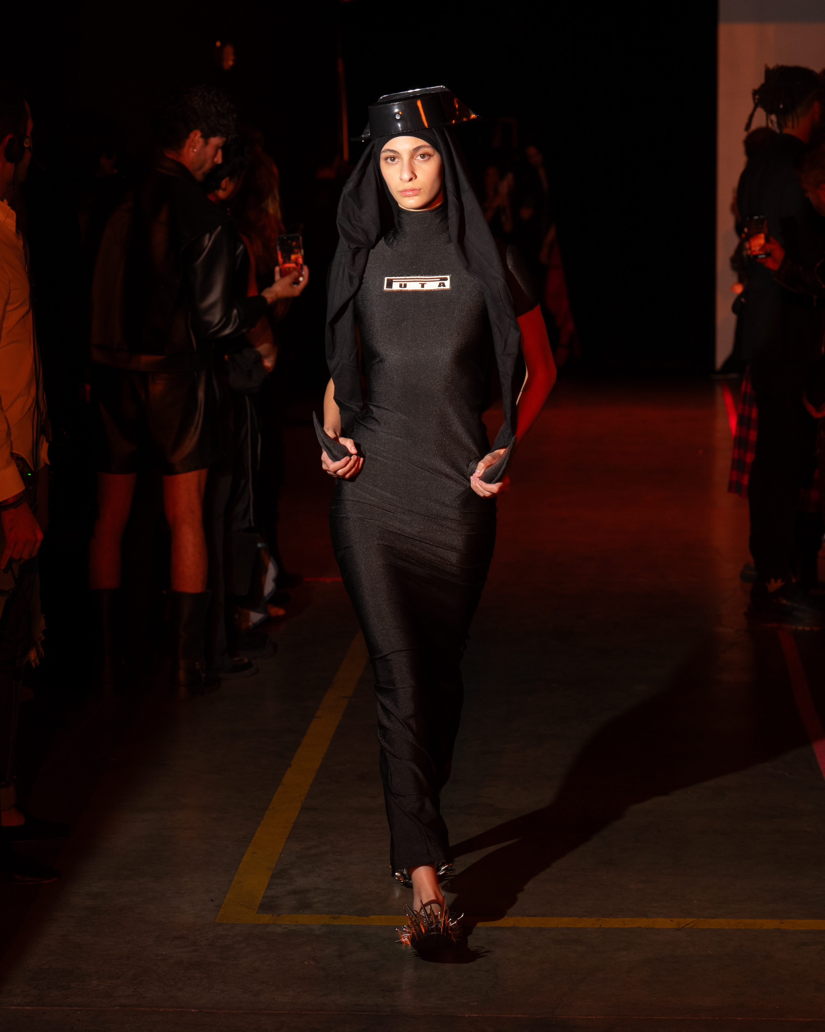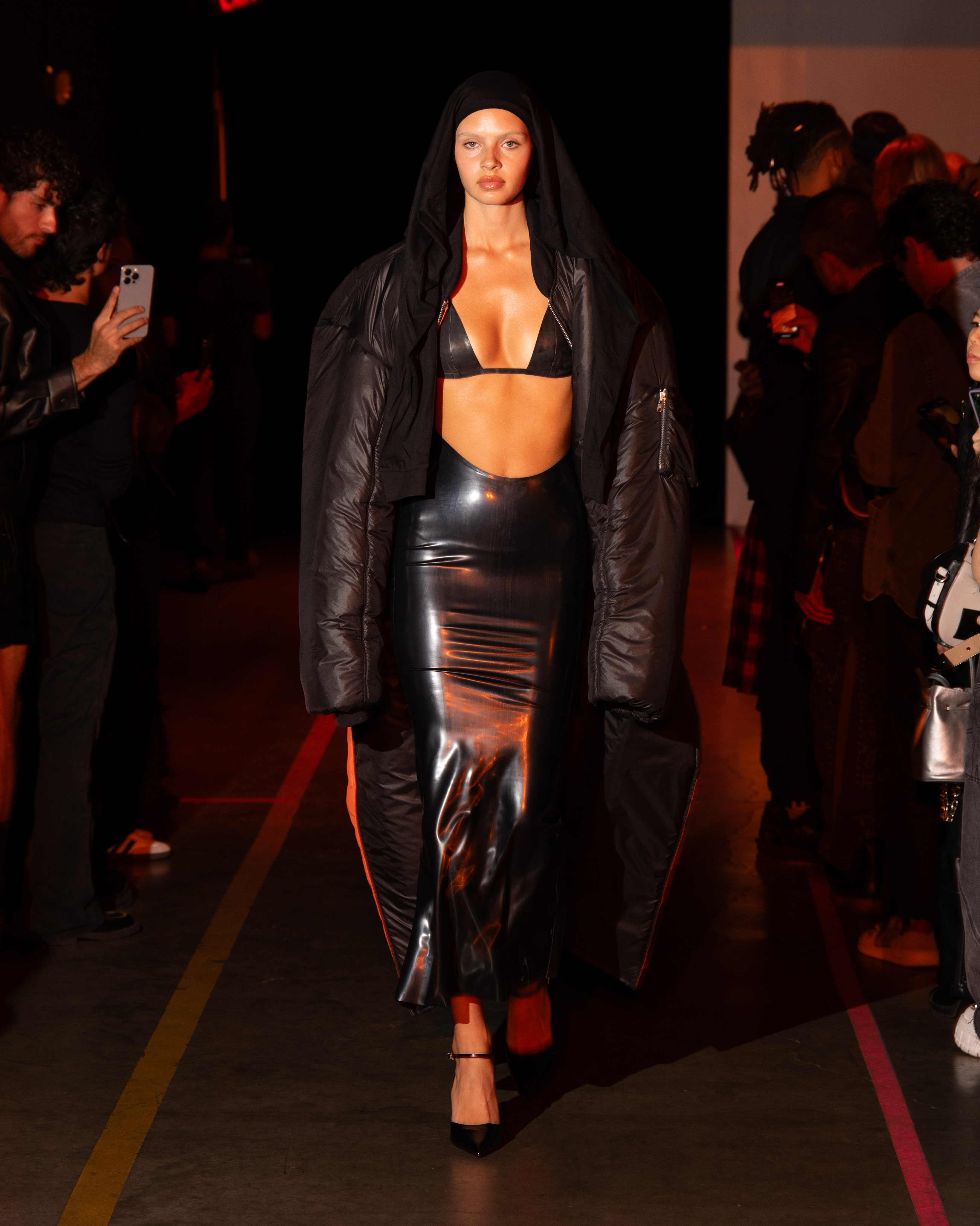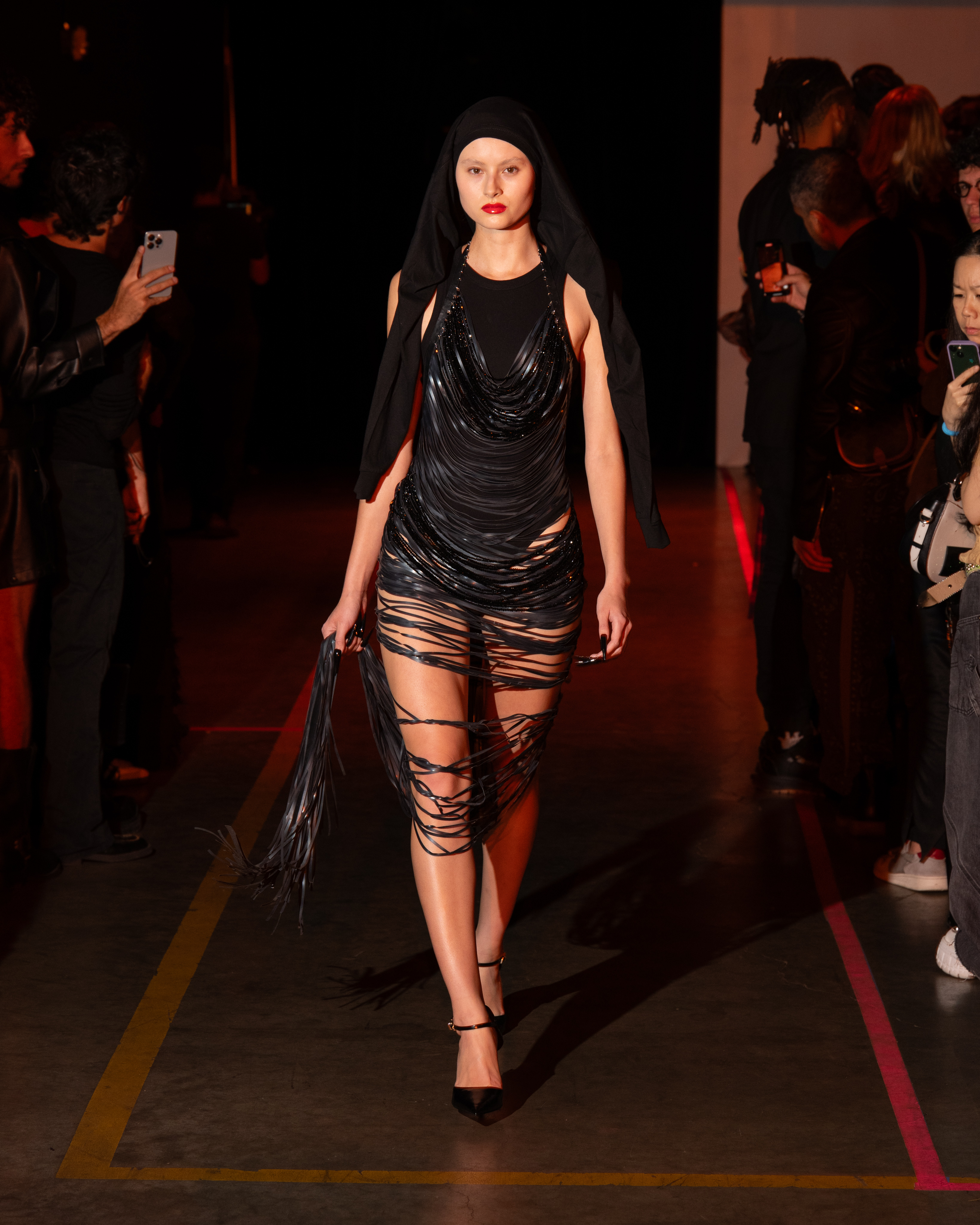 The collection features latex, leather, corsetry, jersey and workwear. Accessories, including teeth flats, shoe covers, rubber spikes, necklaces, earrings, were created in collaboration with Aslan World.