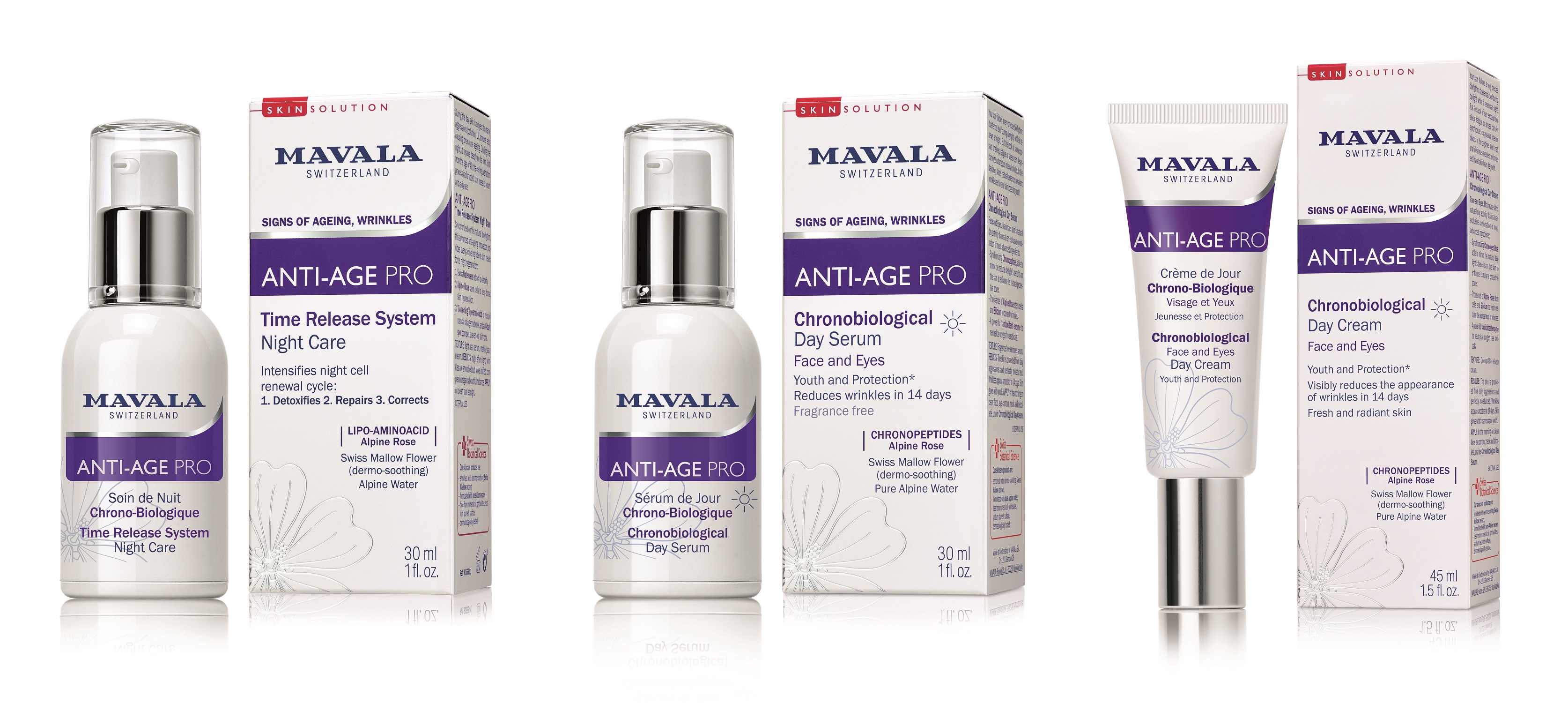 ANTI-AGE PRO: For signs of aging, and a desire to reactivate the skin’s youth mechanism, this range uses the Alpine anti-aging rose to restore one’s youthful appearance while reducing the signs of aging. The ANTI-AGE PRO range consists of a Day Serum & Cream and Night care ointment for the face and eyes that can also be used on lip and neckline. The Day Serum & Cream are Dermato-and Ophthalmologically tested working against wrinkles that visibly reduced in 14 days. For a professional tip, blend one drop of the serum with foundation to reveal a light and more luminous complexion.