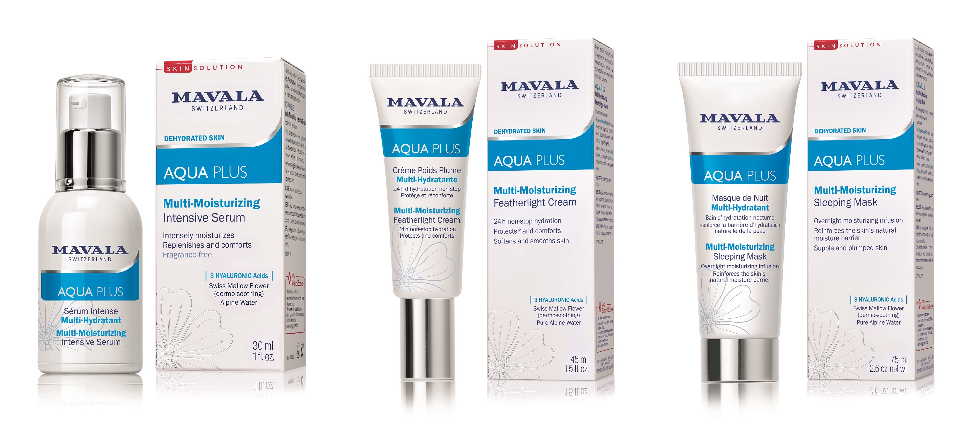 AQUA PLUS: For skin lacking moisture, and a weakened cutaneous barrier, the Aqua Plus range rehydrates the skin with hyaluronic acids at three molecular weights while replenishing your skin with Alpine moisture. For dehydrated skin this four-piece range includes an Intensive Serum, Featherlight Cream, Snow Mask and Sleeping Mask. Fabulous additions to a night-time skincare routine, the highly concentrated in dermo-soothing Mallow flower and Hyaluronic Acids at three molecular weights, deeply penetrates the epidermis, helping to restore its water preserves and reinforcing the protecting cutaneous barrier. Expect fully replenished, rehydrated and supple skin after waking up.