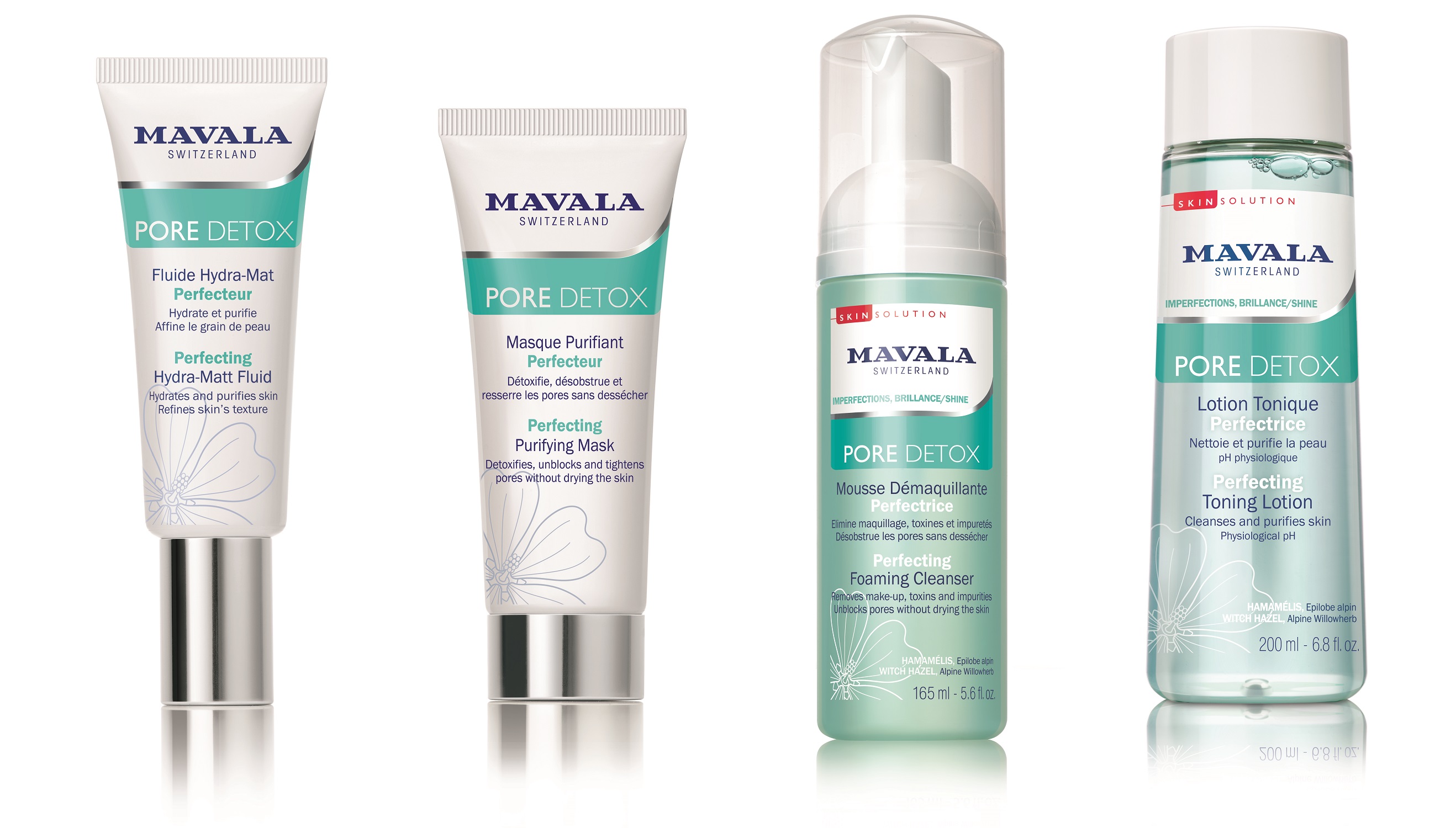 PORE DETOX: To counter-balance external aggressions and hormonal variations which can cause excess sebum in the skin, this collection blends Alpine willowherb, Witch Hazel water and perlite to purify, clean, mattify and freshen the skin. The gentle micellar formula in the four-piece range, targets imperfections, shine and dilated pores. The Purifying Mask, Foaming Cleanser, Toning Lotion and Hydra-Matt Fluid allows users to effectively unblock pores and remove makeup, urban toxins and impurities for smoother and more refined skin, regaining its beautiful radiance.