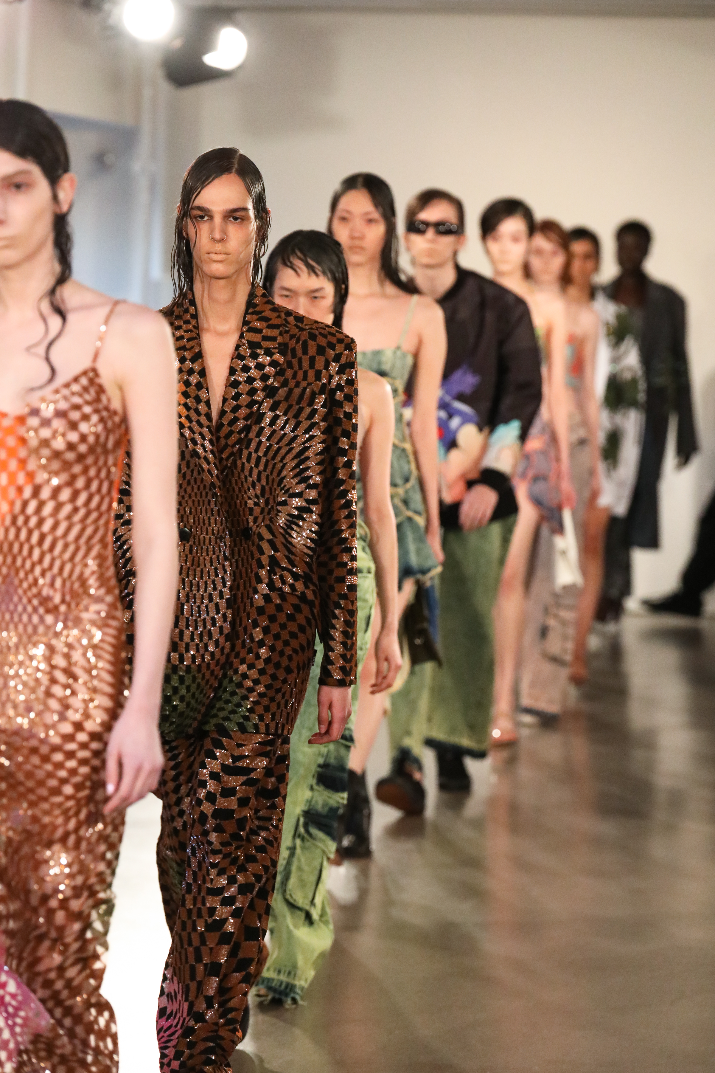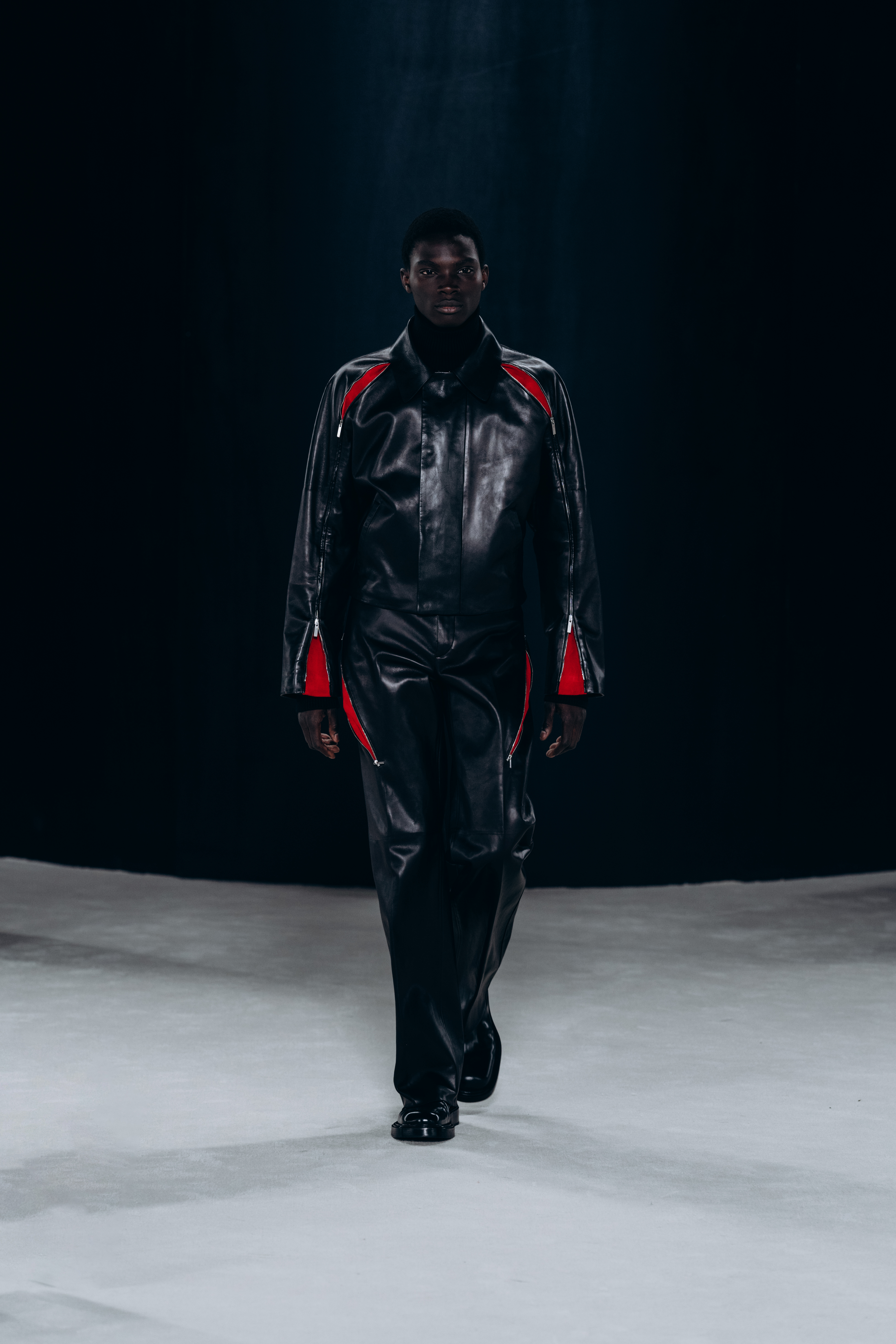 A vocabulary of slashes disturbs a classic sensibility: sharply-sliced suiting, or leathers which unzip to reveal flashes of colour, speak both to Davis’ exacting aesthetic and the disruptive spirit of fifties greasers. The codes of bikers’ wardrobe appear interspersed throughout, in flocked velvet or coated metallic denims, white viscose tanks and brogues swollen at the toe.