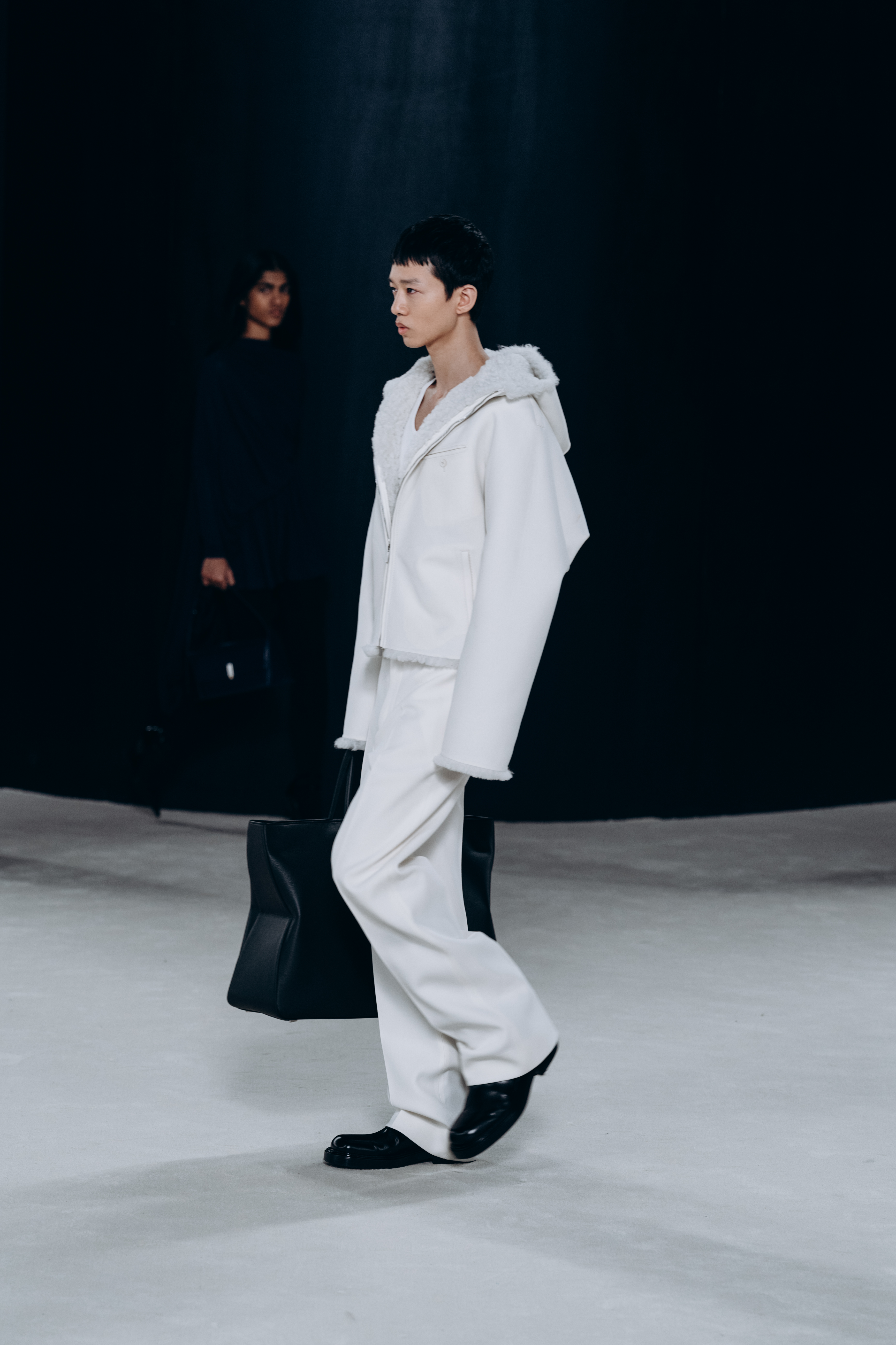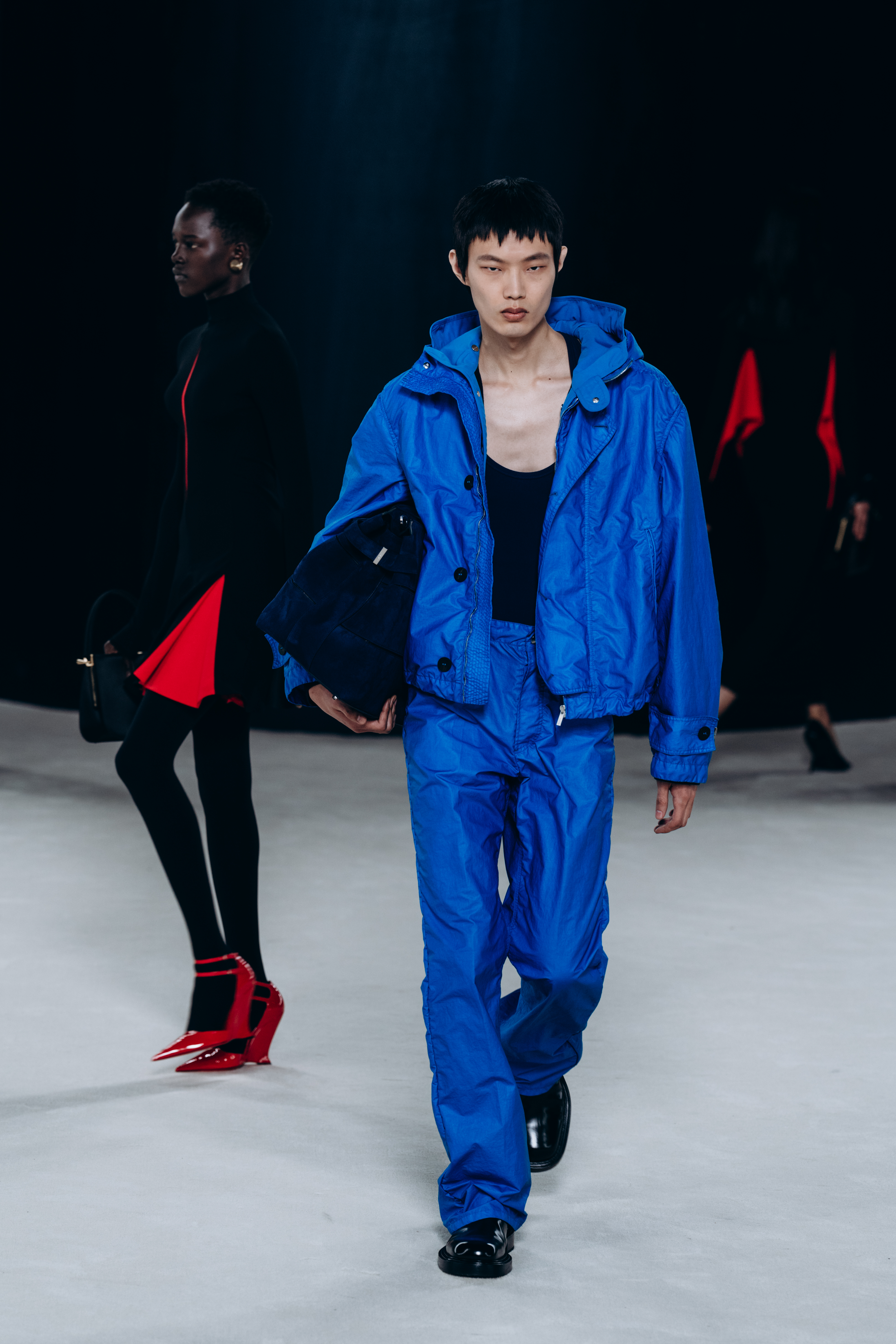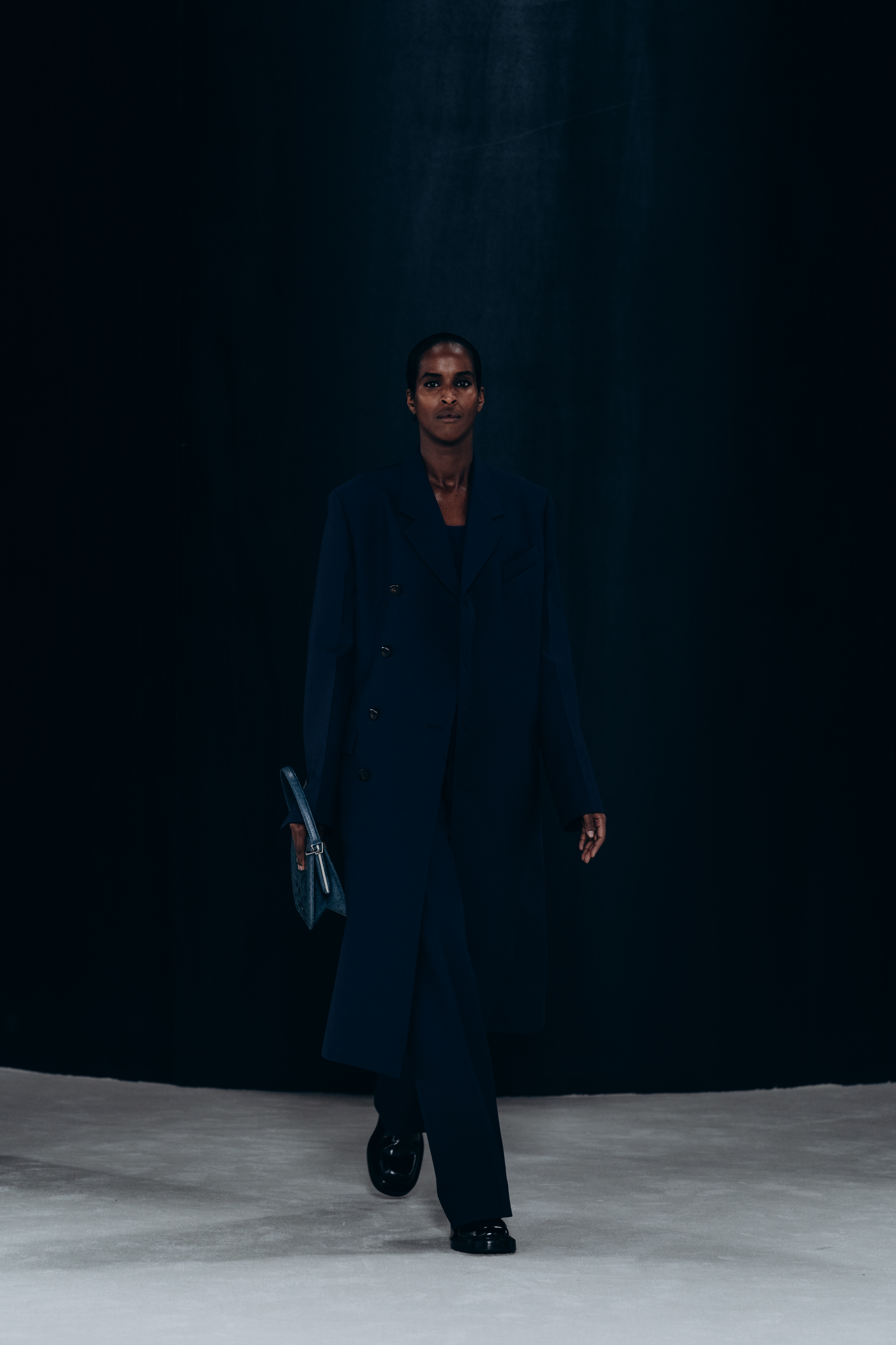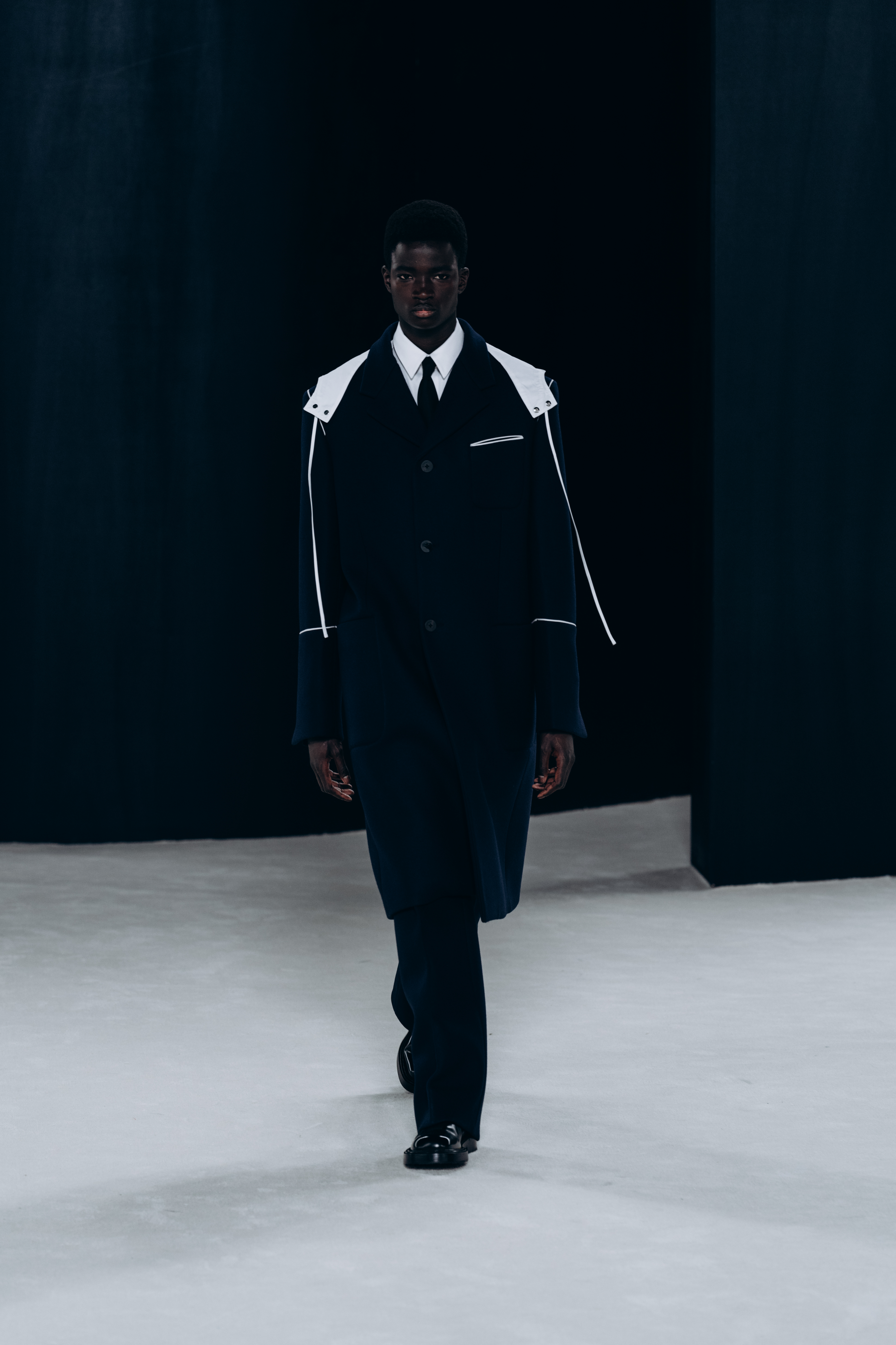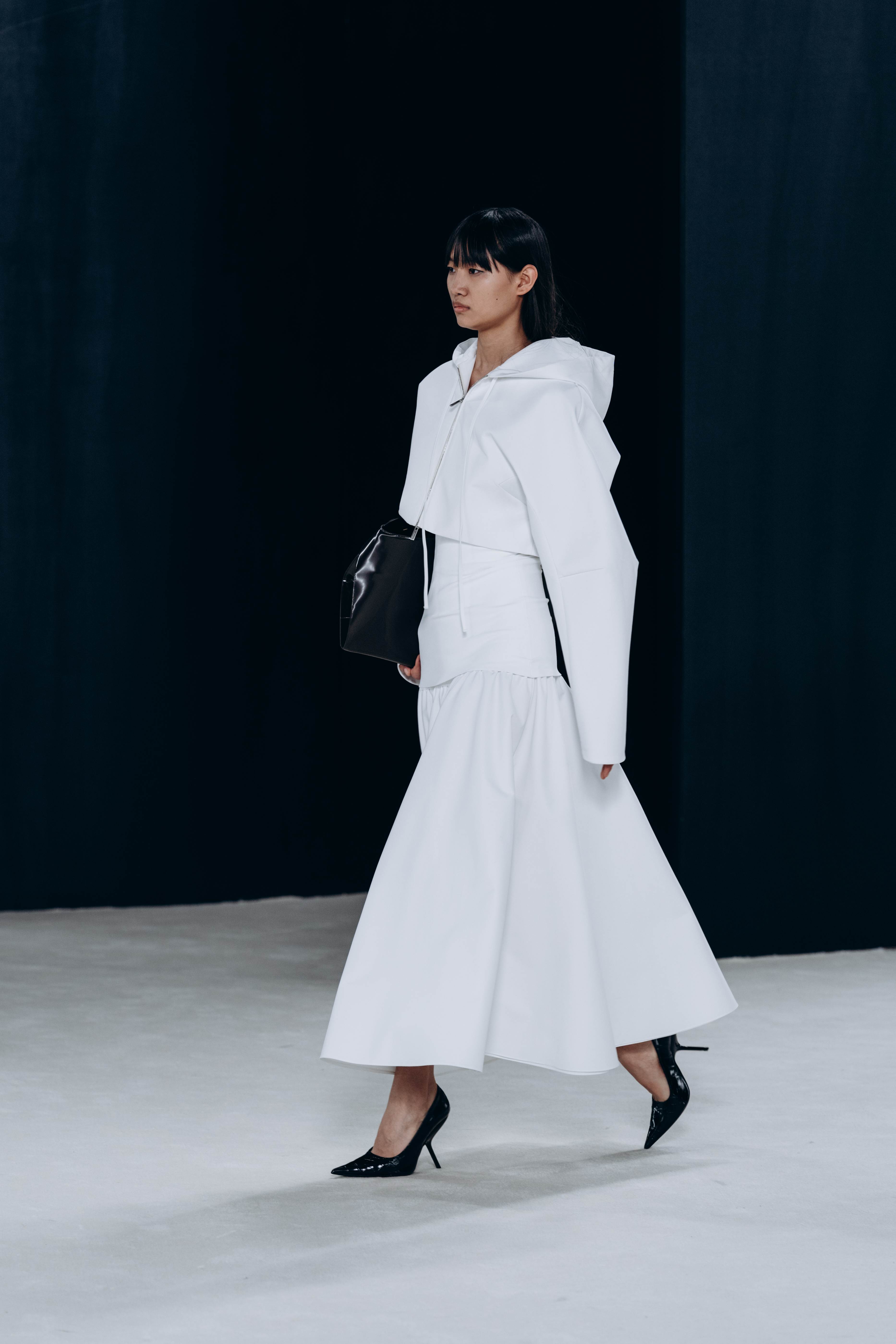 Explored with the linear precision which defines Davis’ expression, mid-century silhouettes find a graphic purity: a ball skirt now seen in optic white nylon; a cocoon cut adopted from fifties couture applied to a cropped technical bomber and shirting. Double faced tailoring offers a sharp, cinematic clarity or, shrunken and nipped at the waist, updates tradition through the ease of its stretch wool gabardine. Bakelite jewellery is reconceived in transparent resin, and the wide skirts of swing coats, or off-shoulder cuts, evolve the historic codes of feminine glamour for a new era.