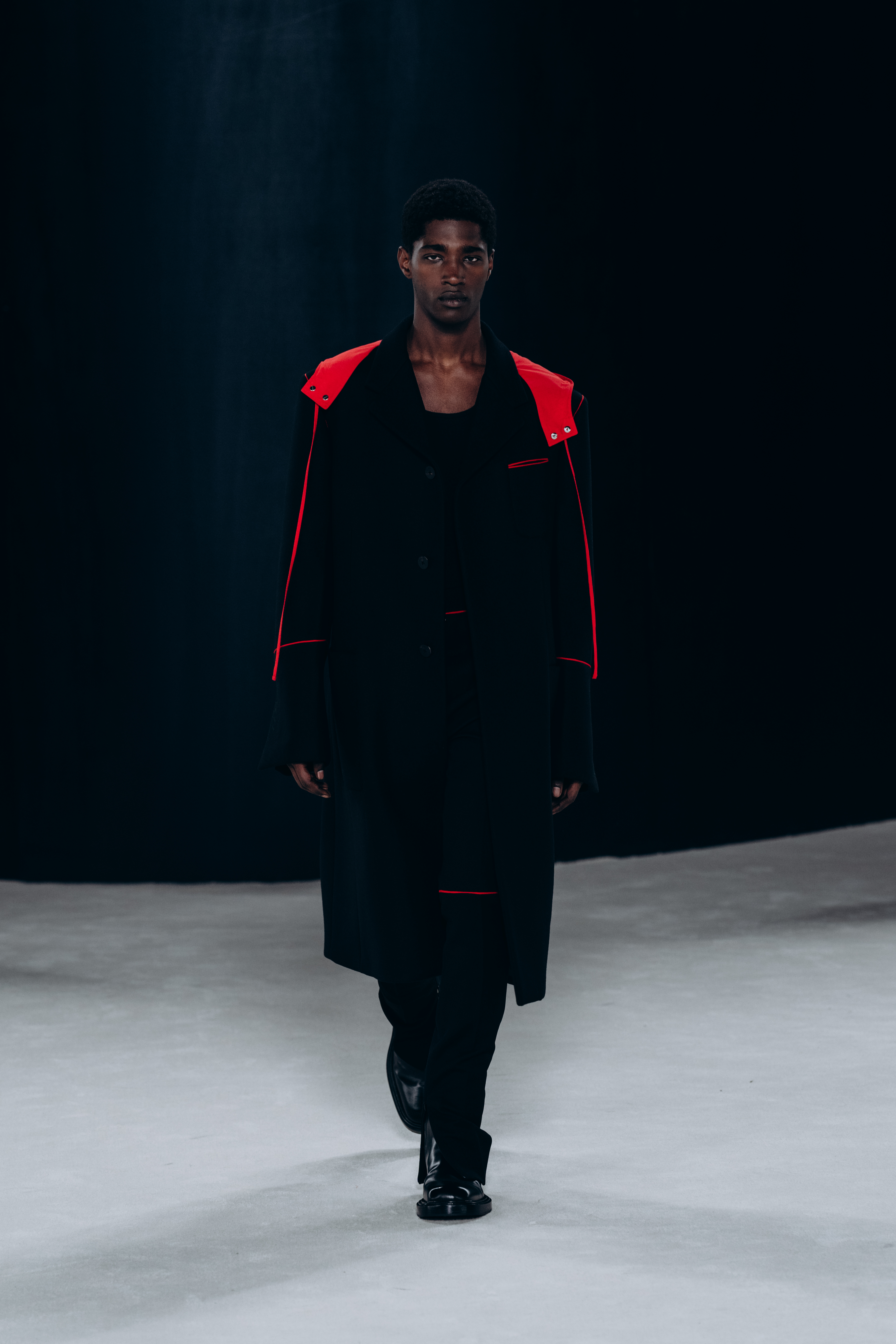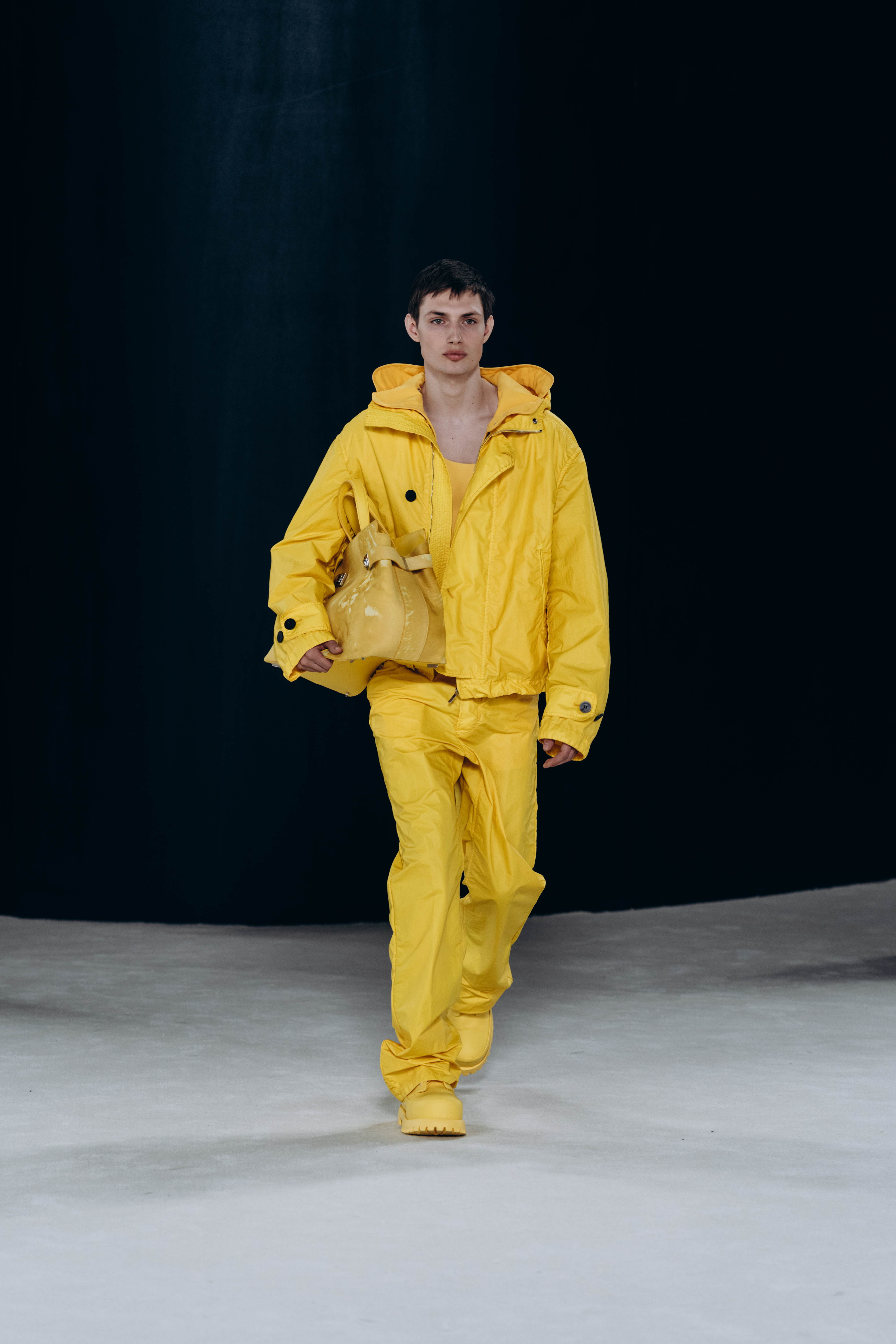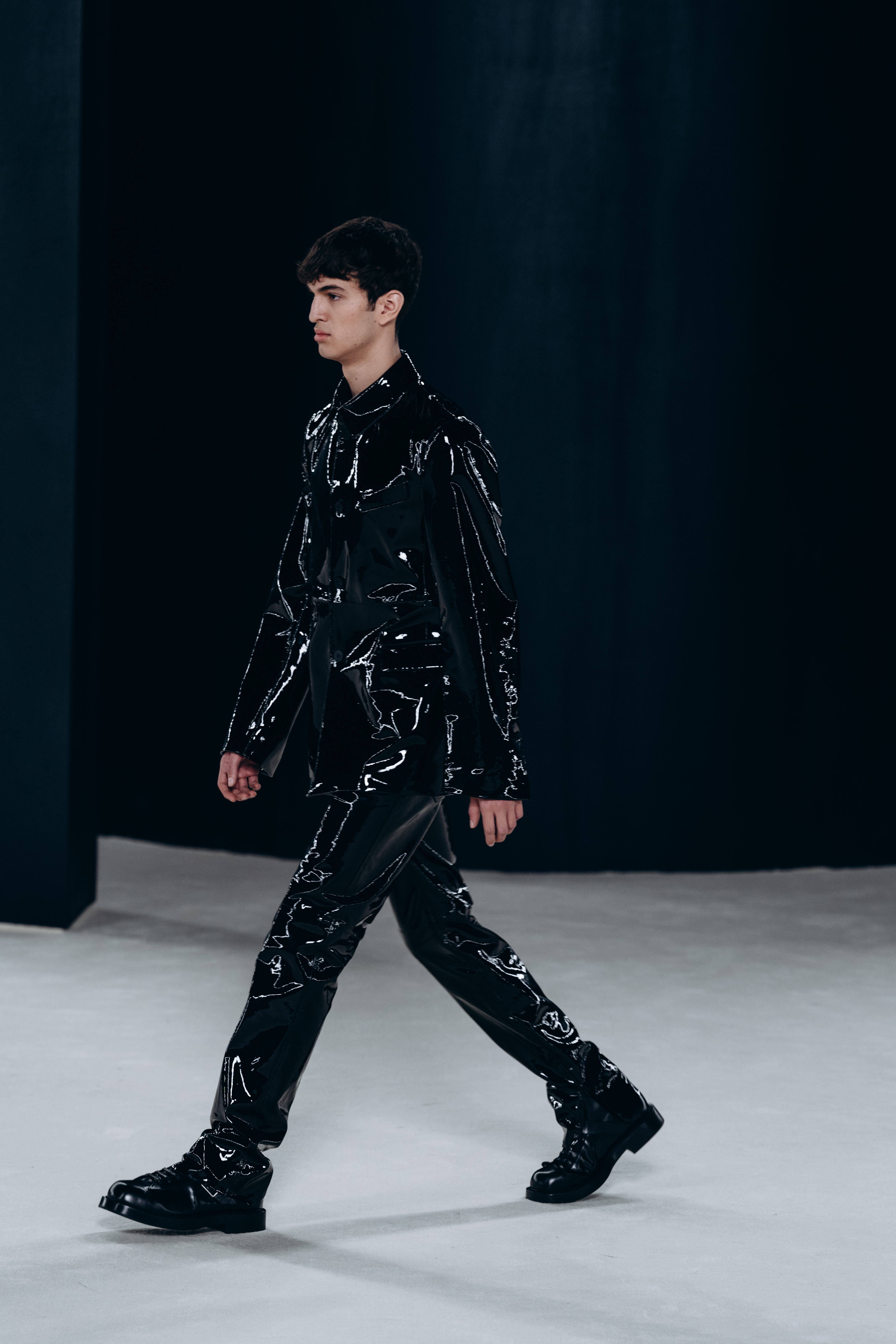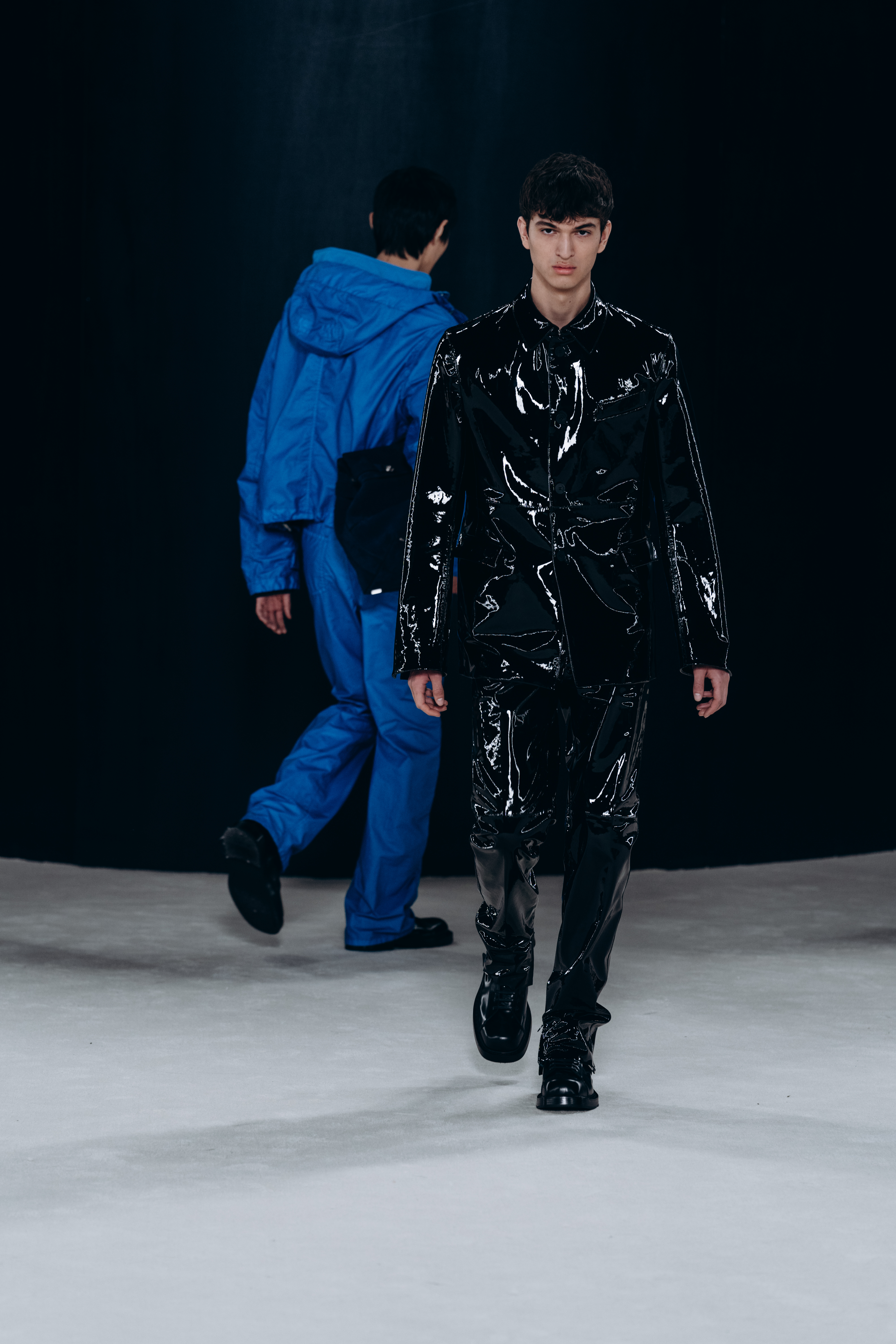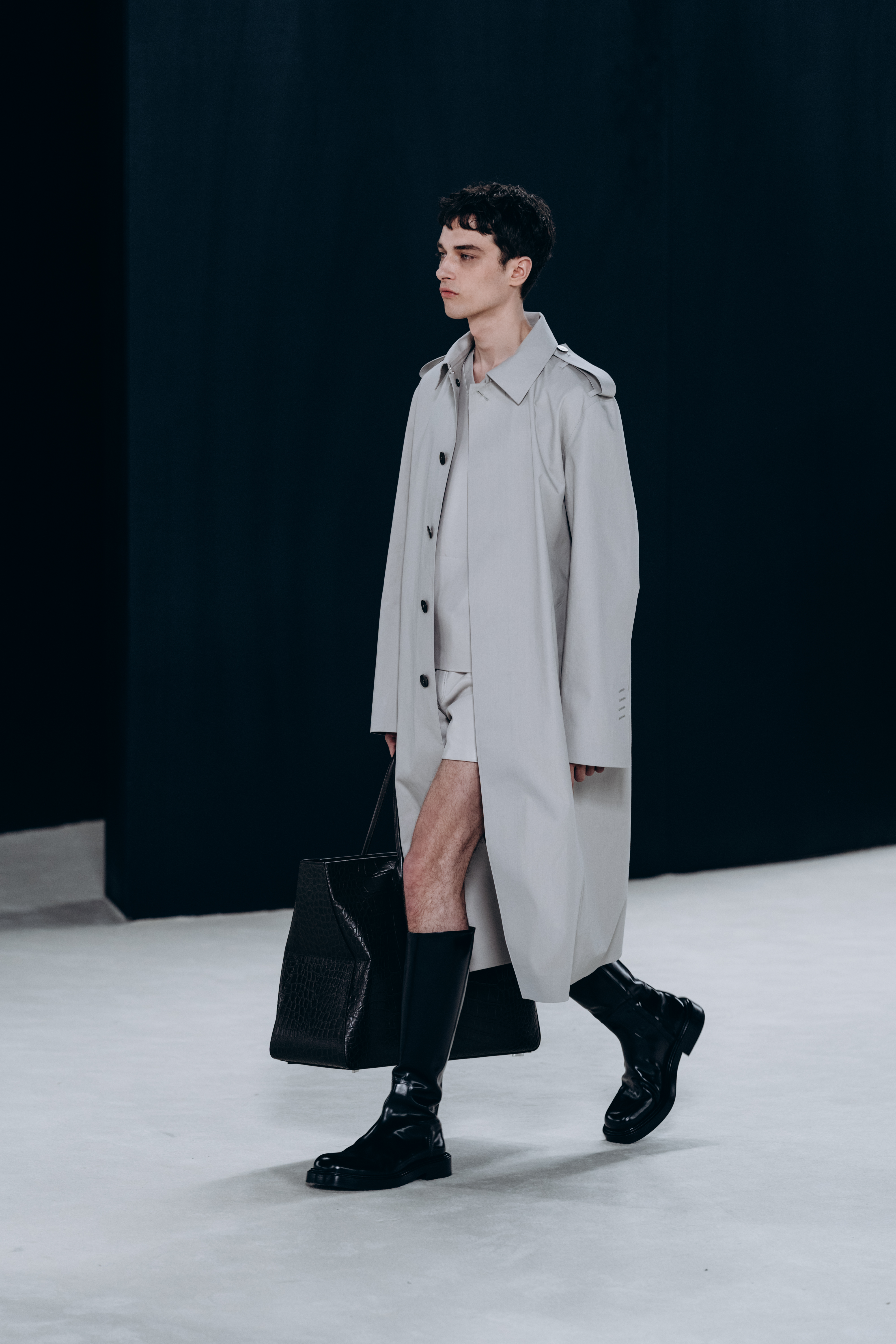 Explored with the linear precision which defines Davis’ expression, mid-century silhouettes find a graphic purity: a ball skirt now seen in optic white nylon; a cocoon cut adopted from fifties couture applied to a cropped technical bomber and shirting. Double faced tailoring offers a sharp, cinematic clarity or, shrunken and nipped at the waist, updates tradition through the ease of its stretch wool gabardine. Bakelite jewellery is reconceived in transparent resin, and the wide skirts of swing coats, or off-shoulder cuts, evolve the historic codes of feminine glamour for a new era.