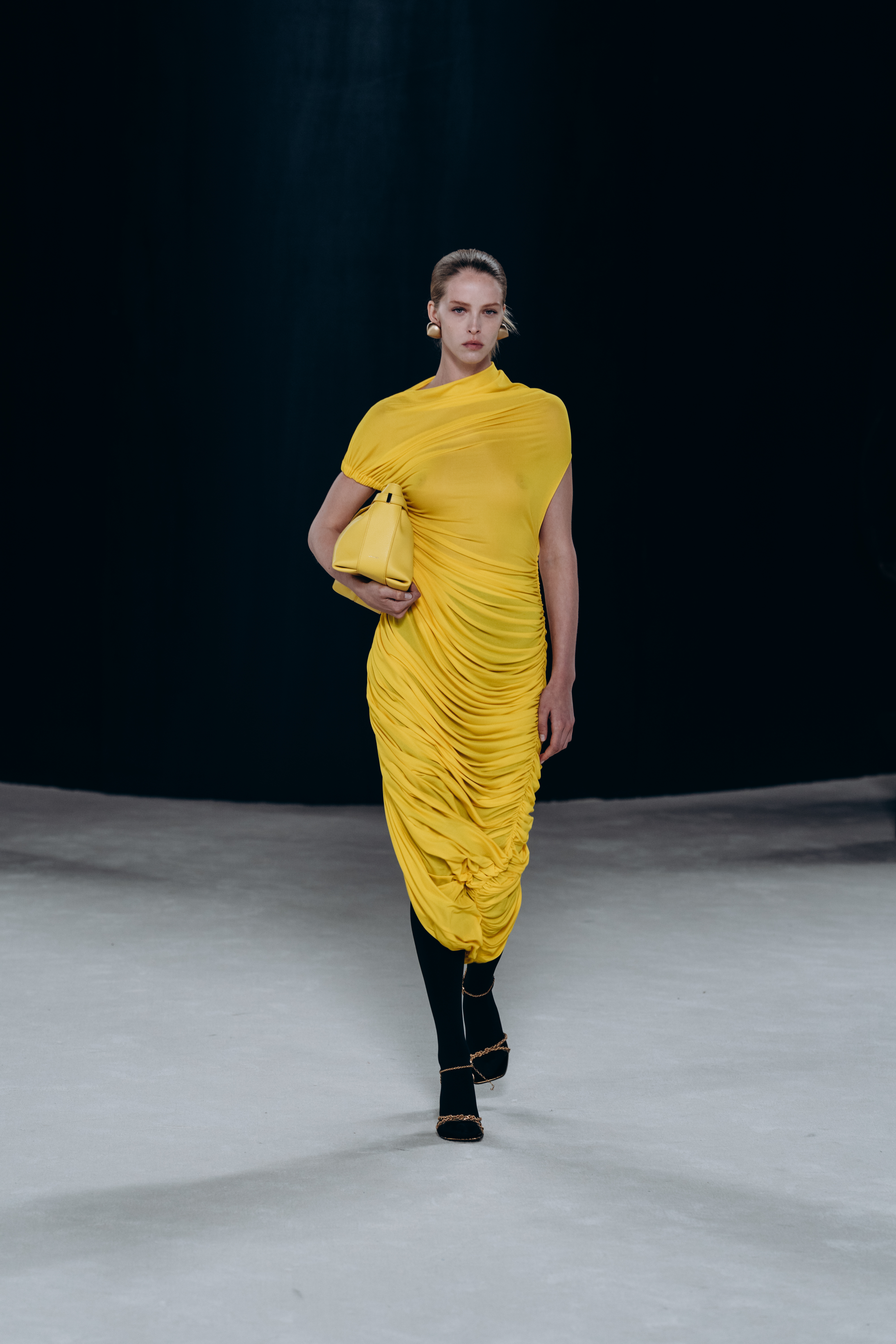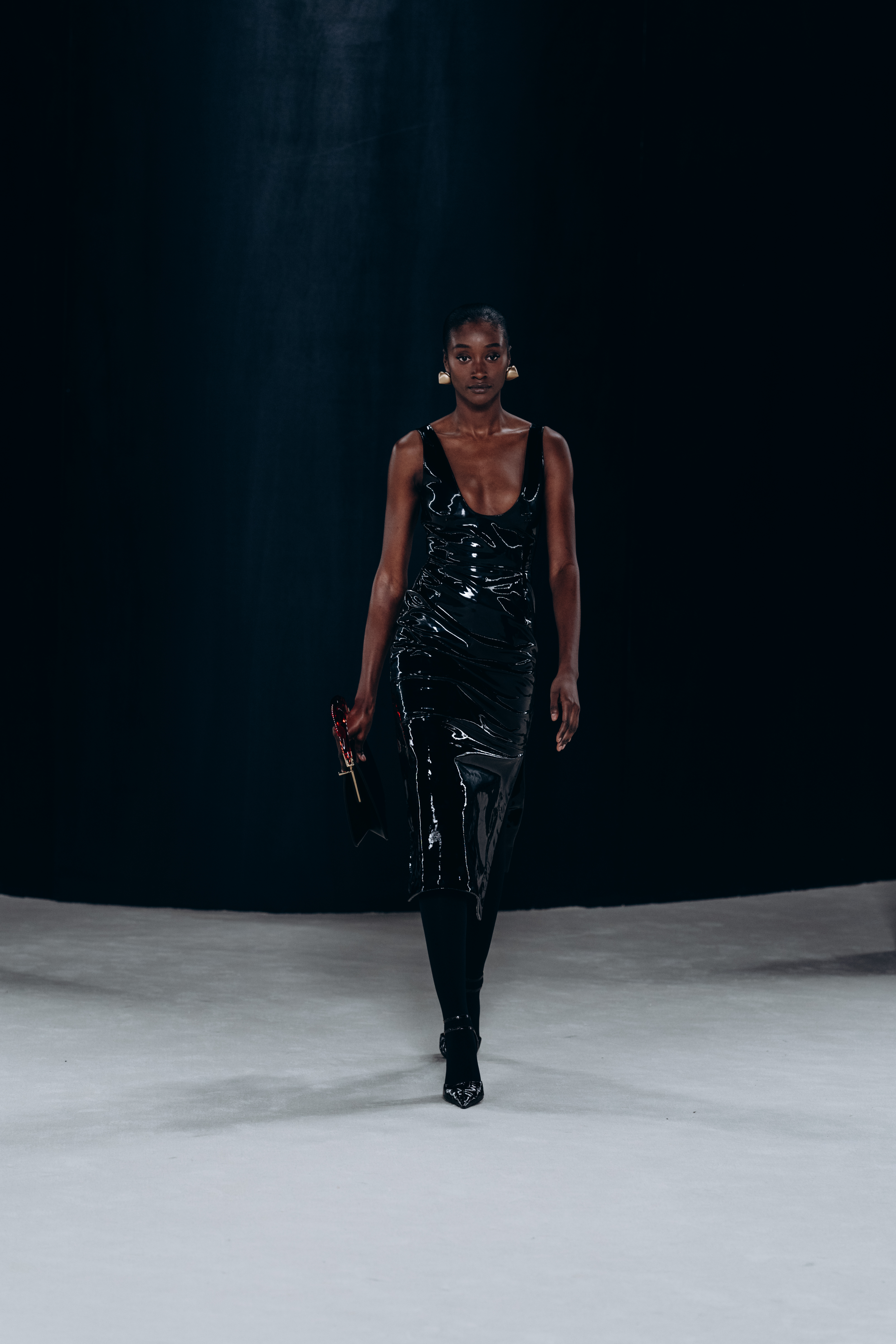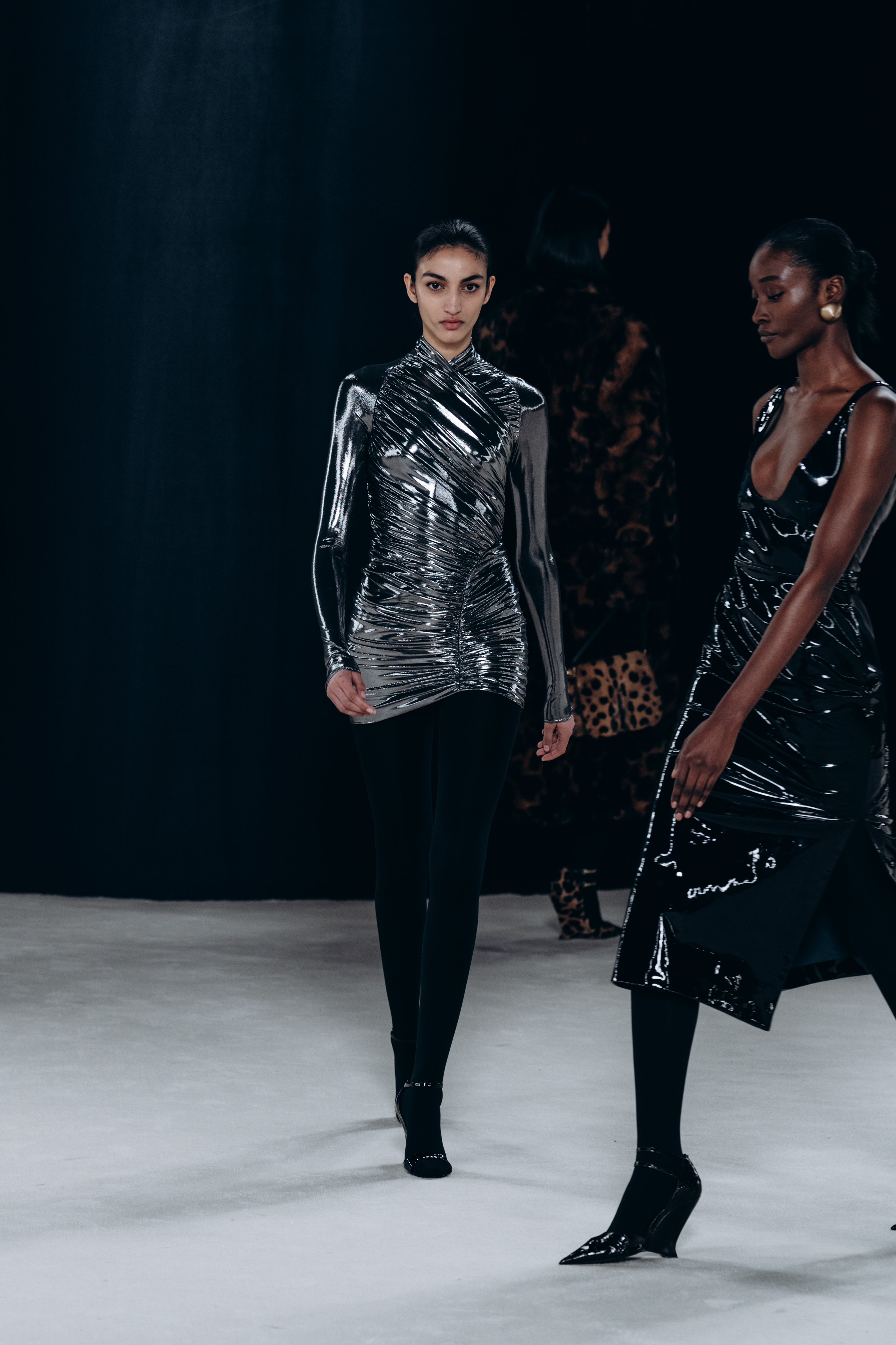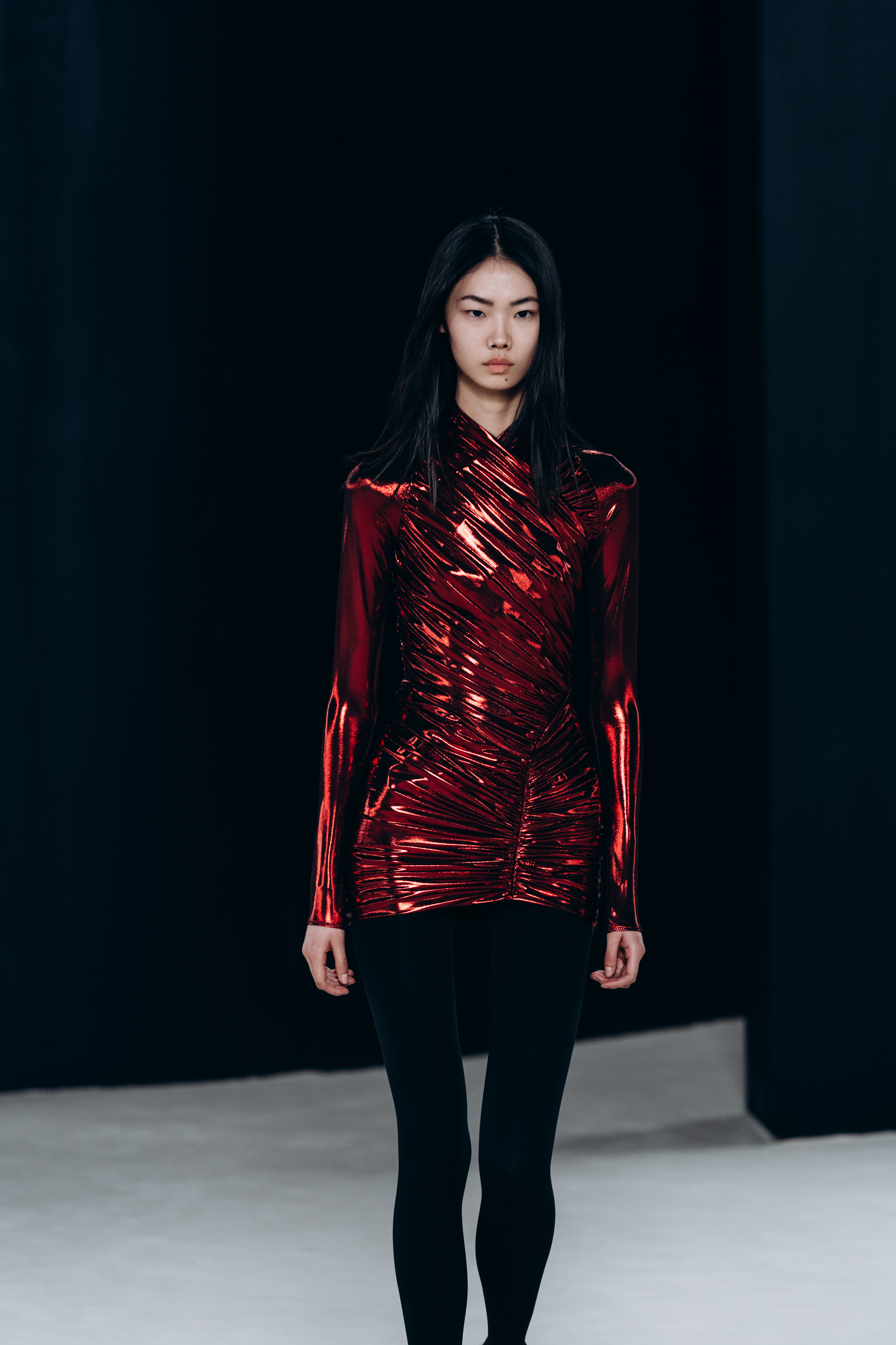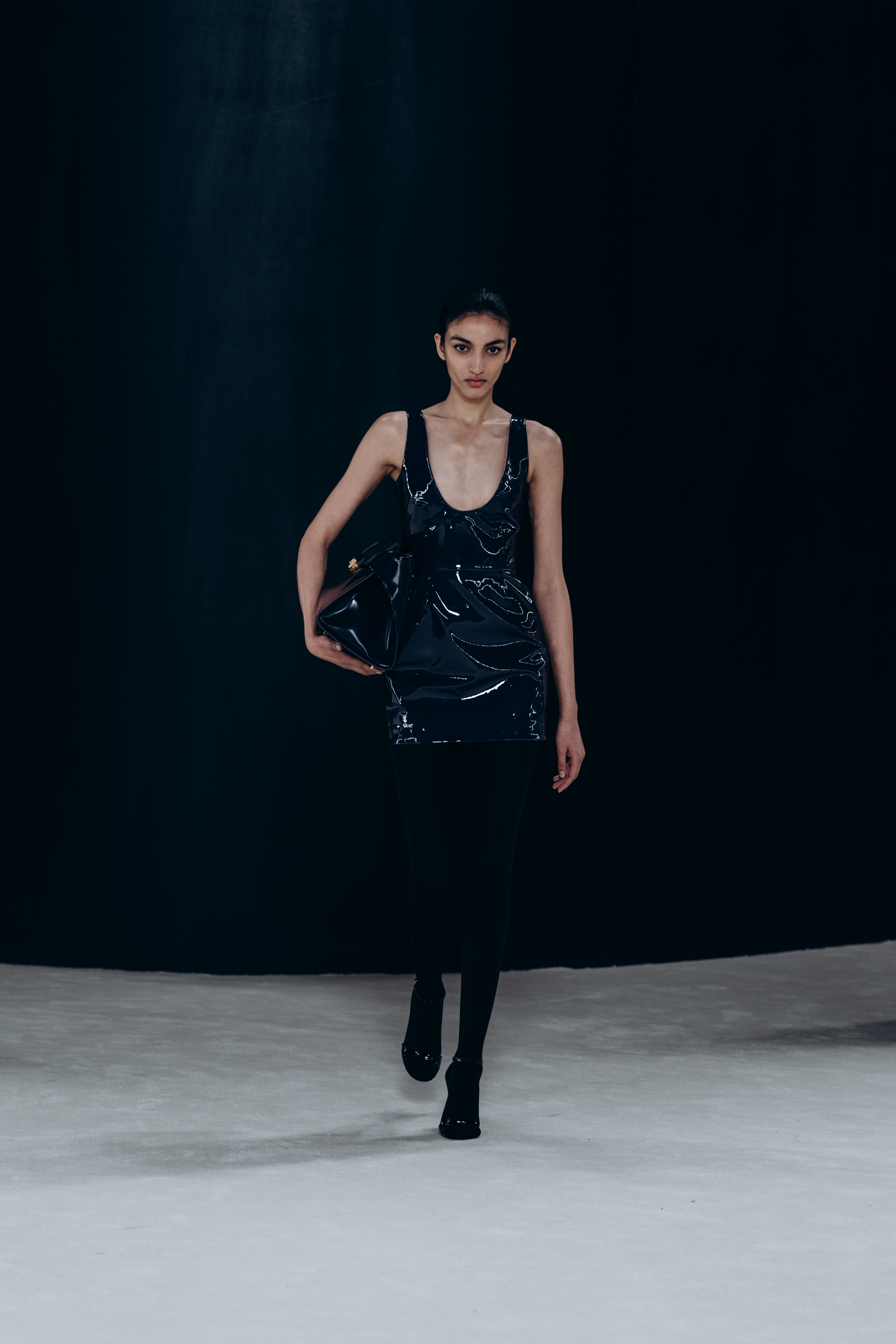 The graceful evolution of scarf dressing, a key code of Ferragamo, appears in a contrast to strict silhouettes. “I wanted to introduce the more romantic side of the fifties, and the two elements appear to contrast so directly – the ethereality against the rigour – that they somehow go hand-in-hand,” explains Davis. The emergence of that languid elegance, expressed in bat-wing sleeves and Renaissance draped details, presents a counterpoint to the high-octane, fetishistic glamour of shimmering lamé minidresses and patent leather that emerges through the close of the collection. “This is my take on what people from the 50s would think of the future: alienated metallics and high shine,” says Davis.