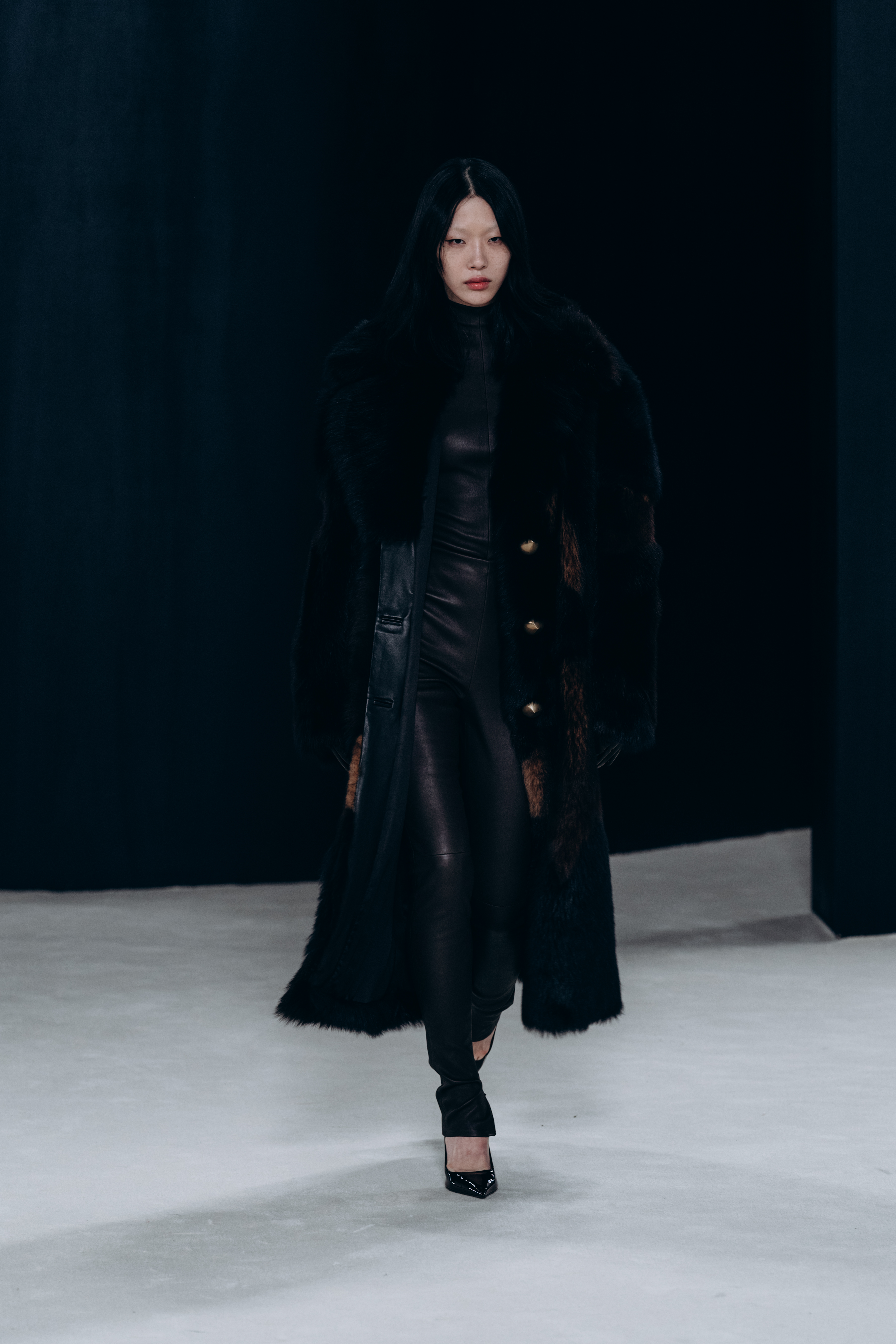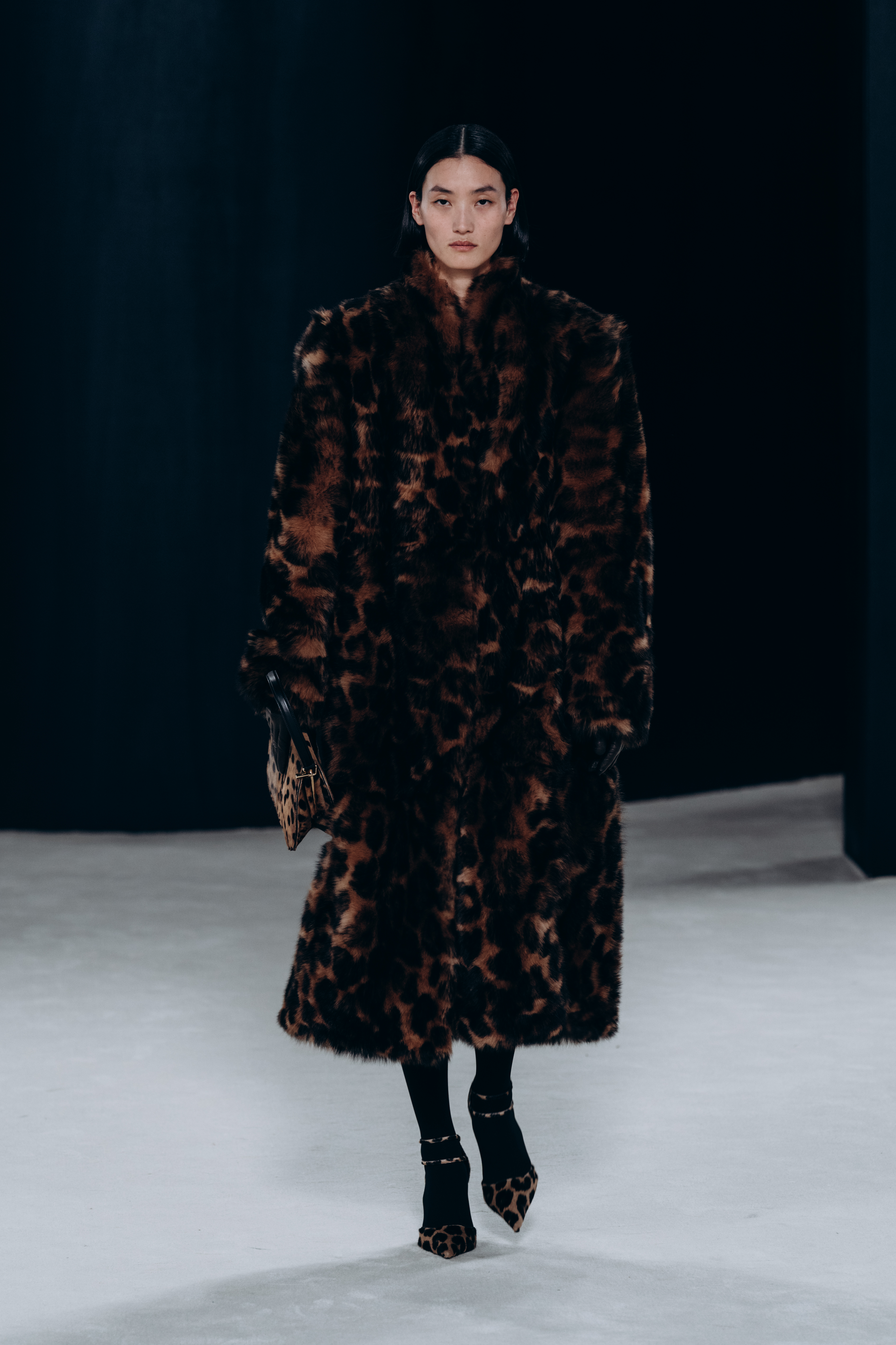 Exotic prints taken from the archives are scanned and manipulated before appearing screen-printed onto shearling, or leather and ponyskin accessories, with a slight distortion “to make them feel like heirloom pieces, taken from the past but brought into the future.” The ornate language of an archival shoe, originally manufactured in 1956 in 18 carat gold, is revived through key details: its angular shape informing the kick-heel of stilettoes, its twisted rope appearing as a top-handle strap. A handbag silhouette from SS98 is reworked in new proportions and with new hardware; the Wanda bag appears in myriad new incarnations.