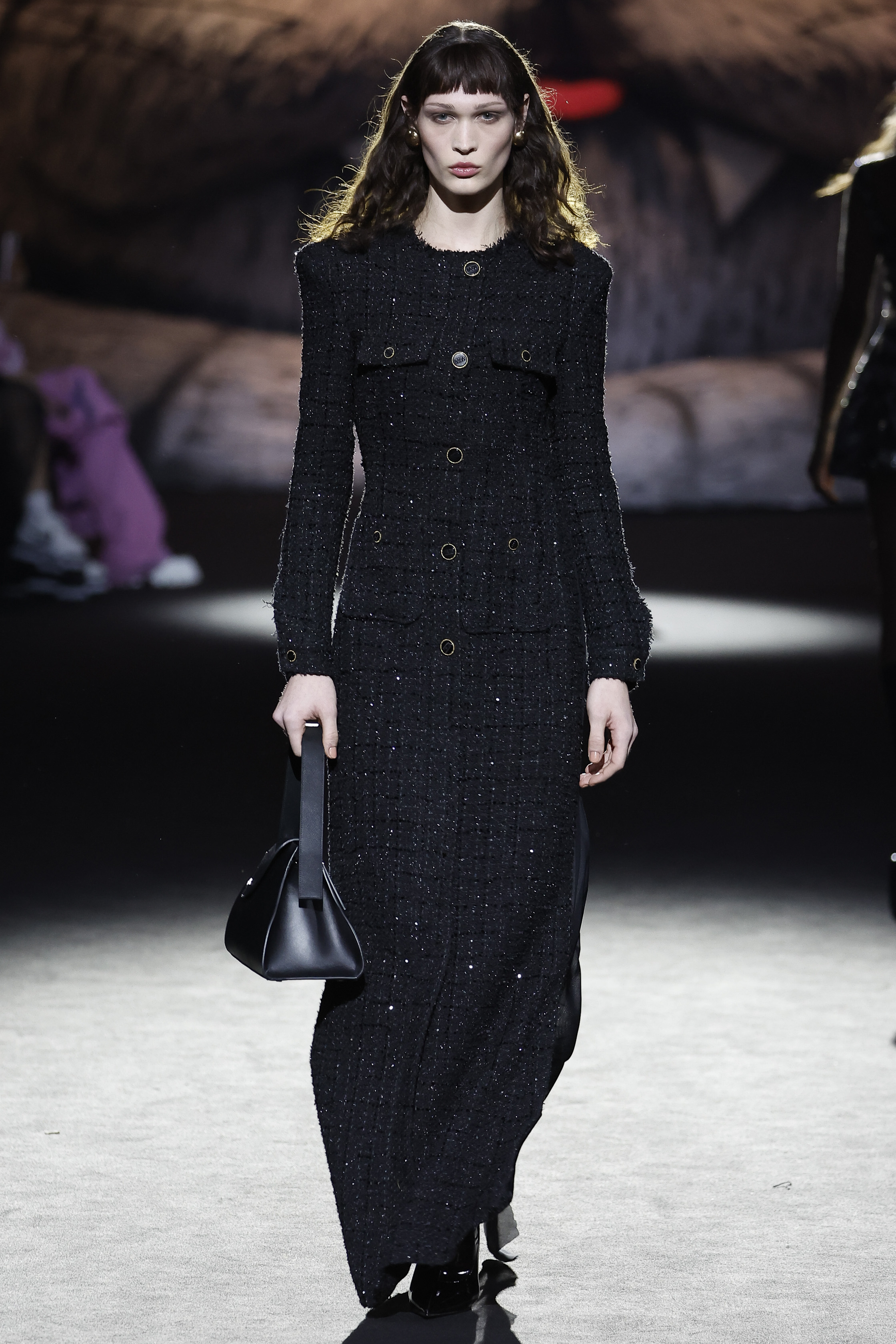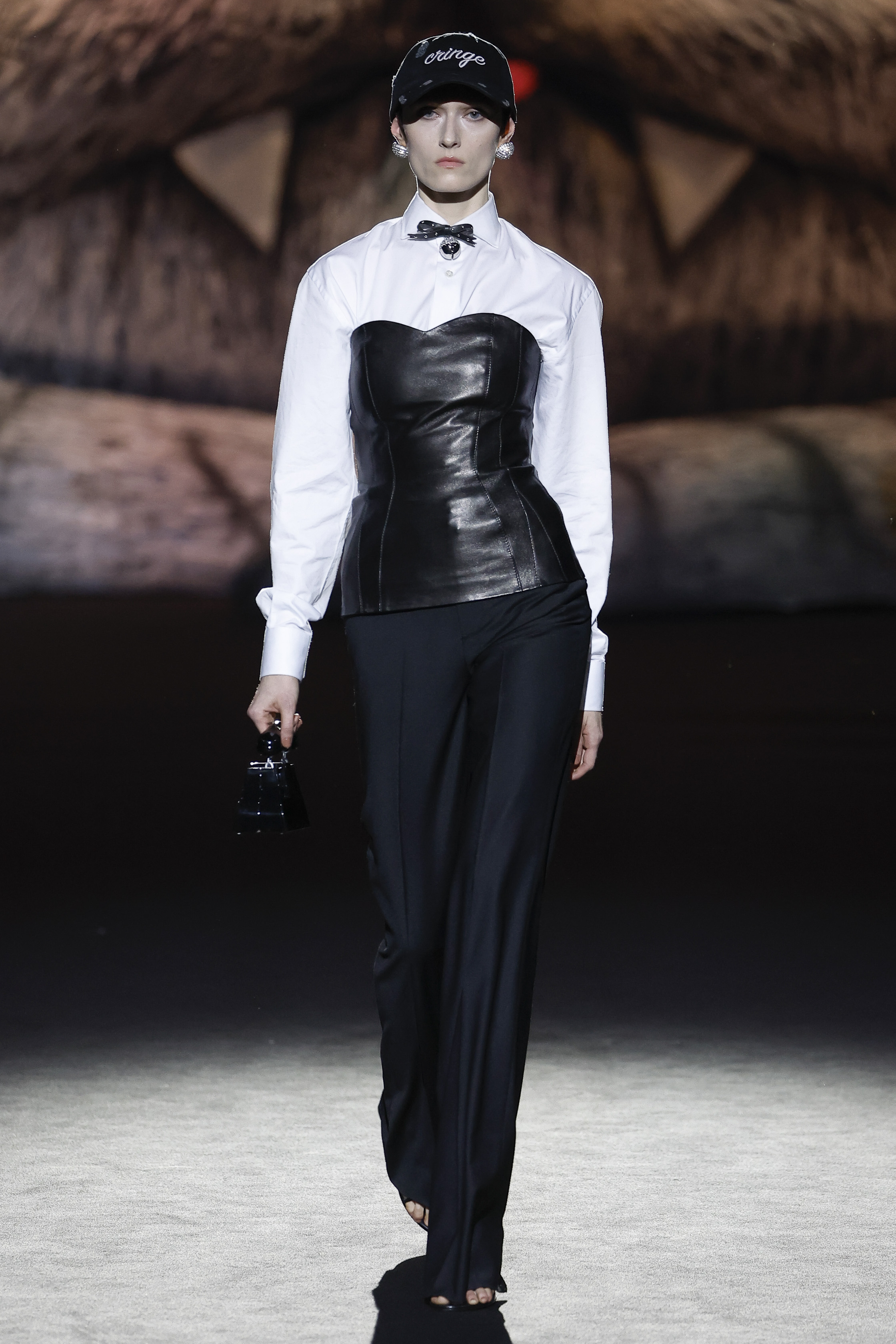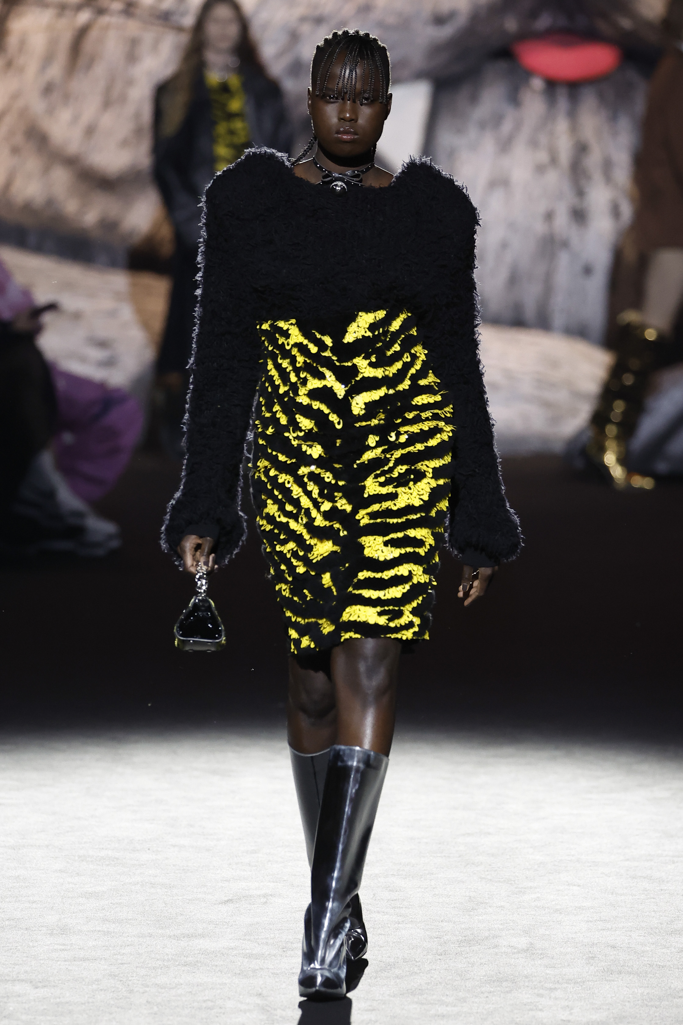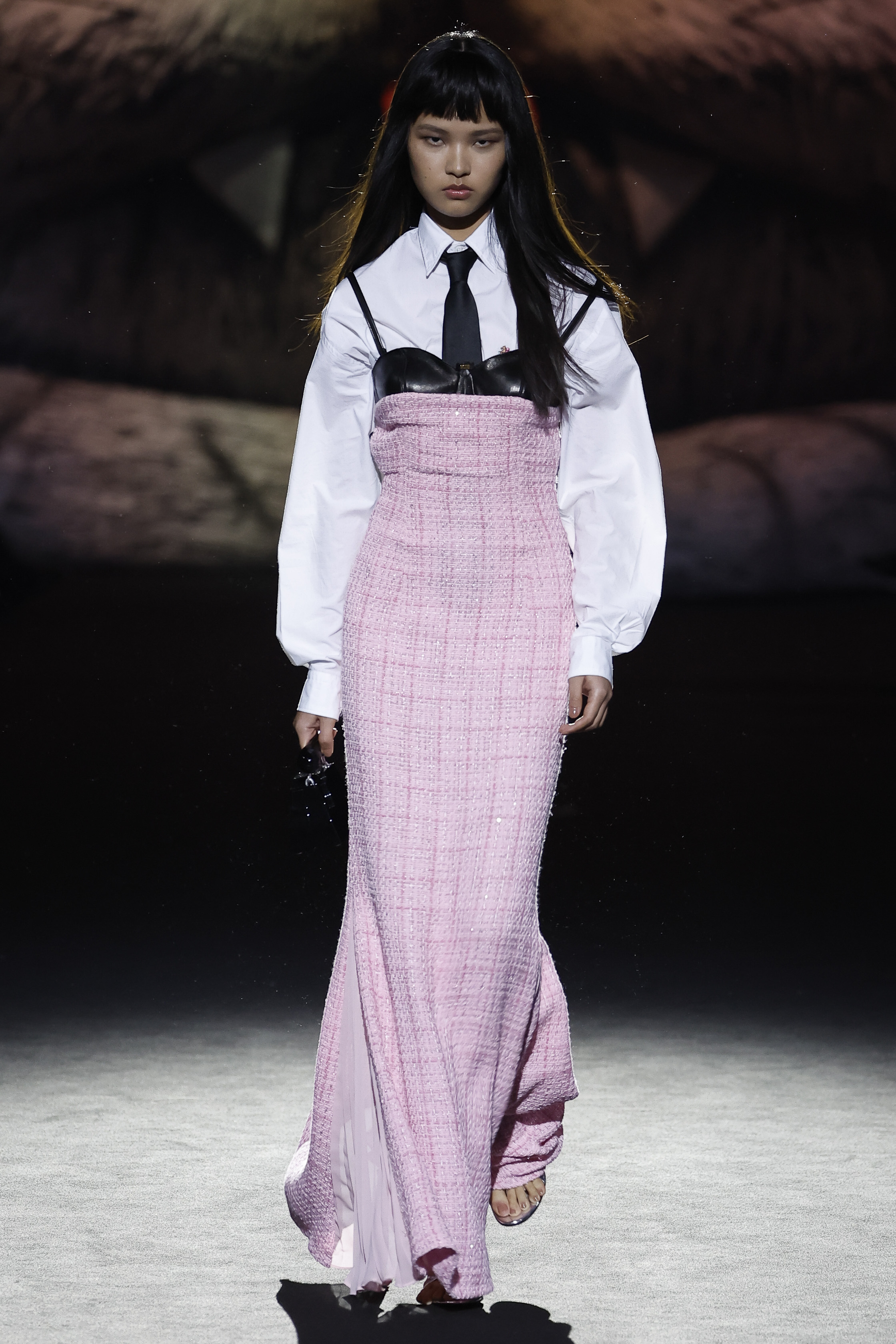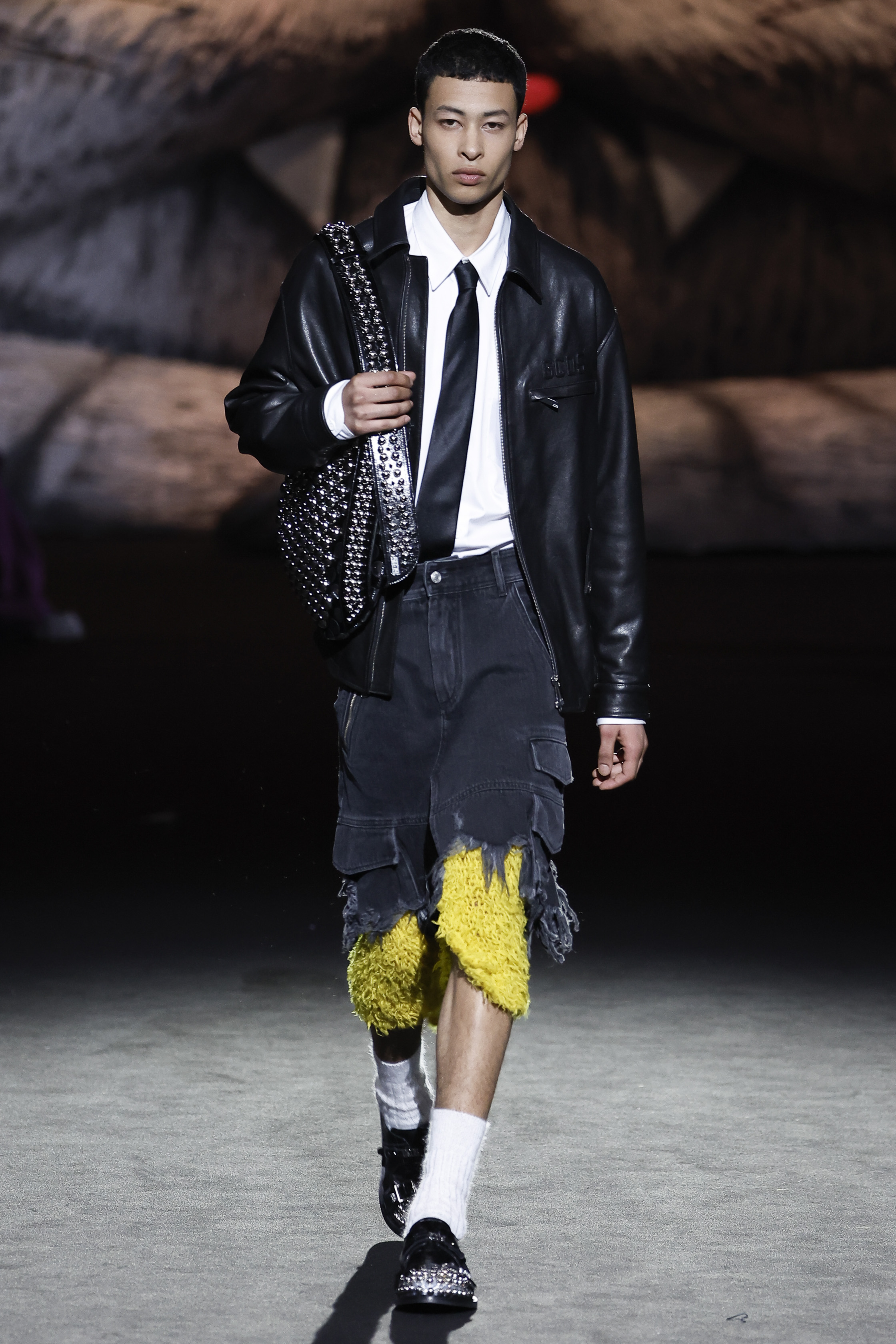 The house is the frame and the inspiration: à la GCDS, but of course. Giuliano Calza explores the obsessions and the proclivities that make him creatively thick: the very bourgeois tweeds of the jackets ladies wear; the pinstripes gentlemen depend on; the worn out leathers of their rebel off springs; the velvets of sofas and the tufty textures of bath mats. No prints this time round, nor bold patterns. Just like the household is a place with diff erent souls, one probably tender, and one more sultry, so the collection relies on the face off of the sweet and the darkly seductive, with accessories blowing the claws of domestic felines to human proportions, turning them into sensual weapons.