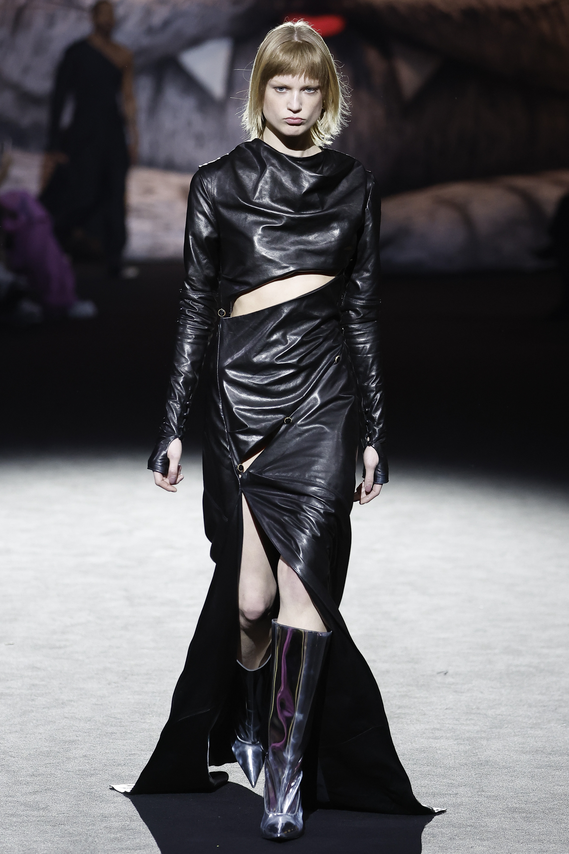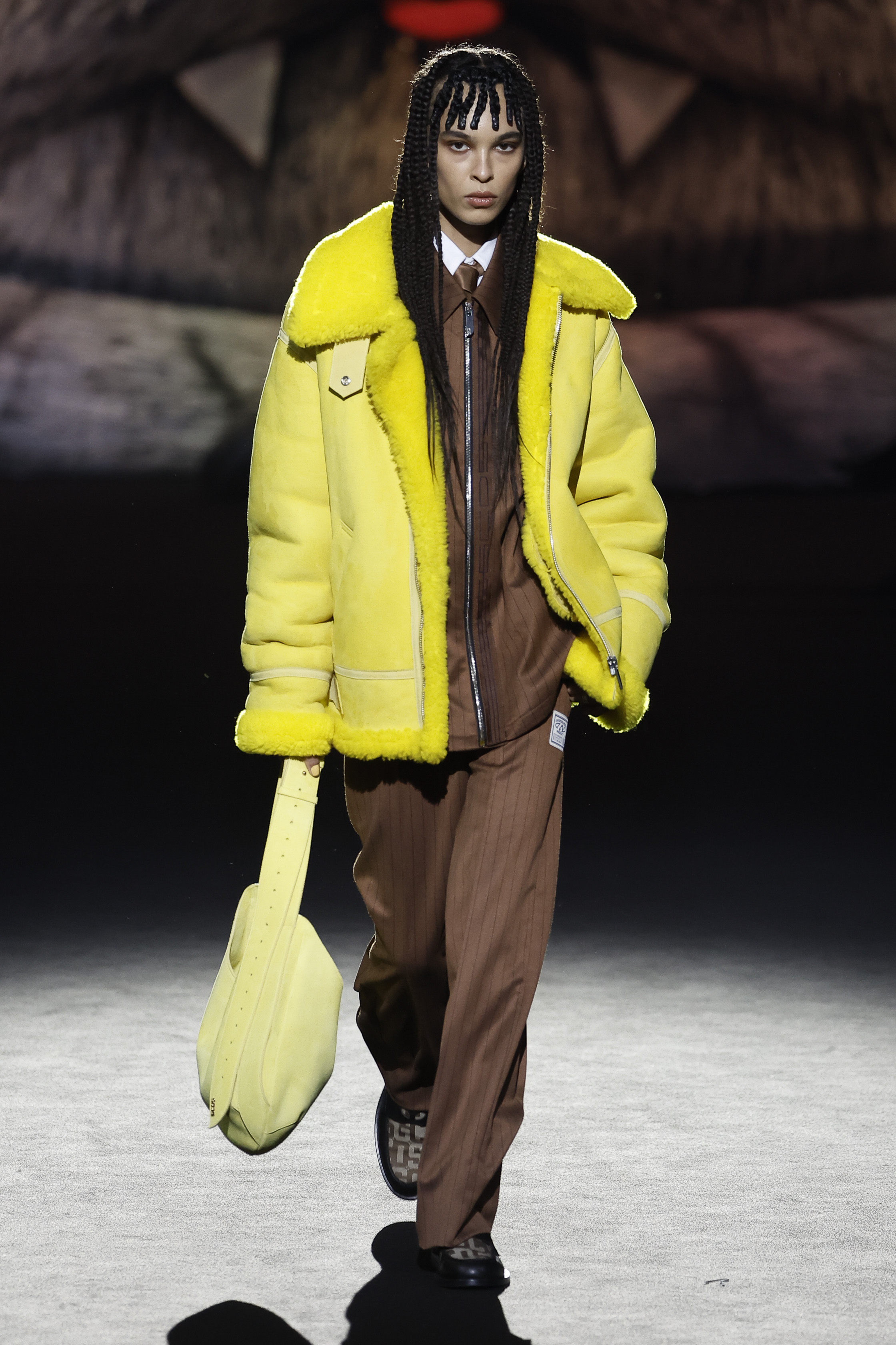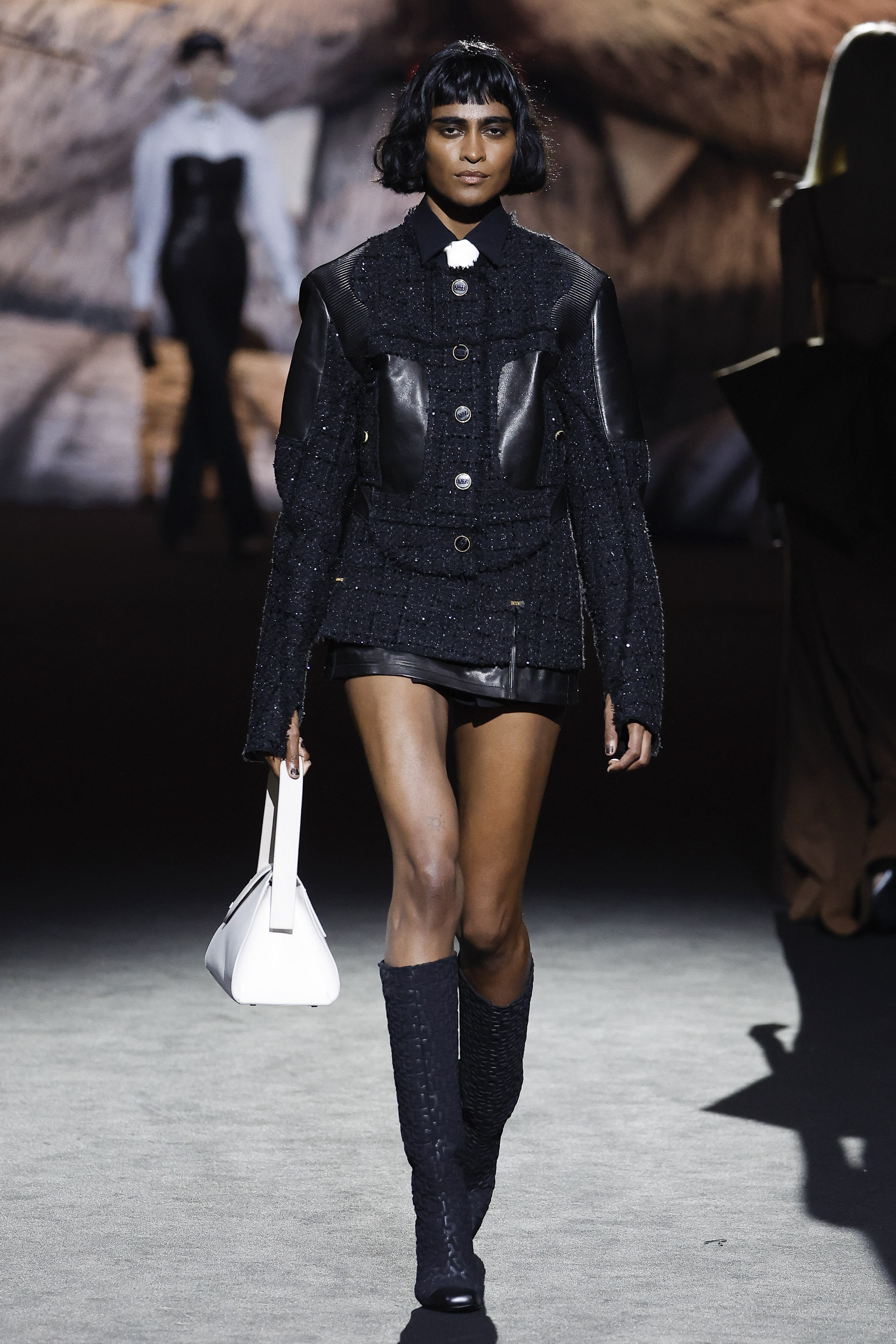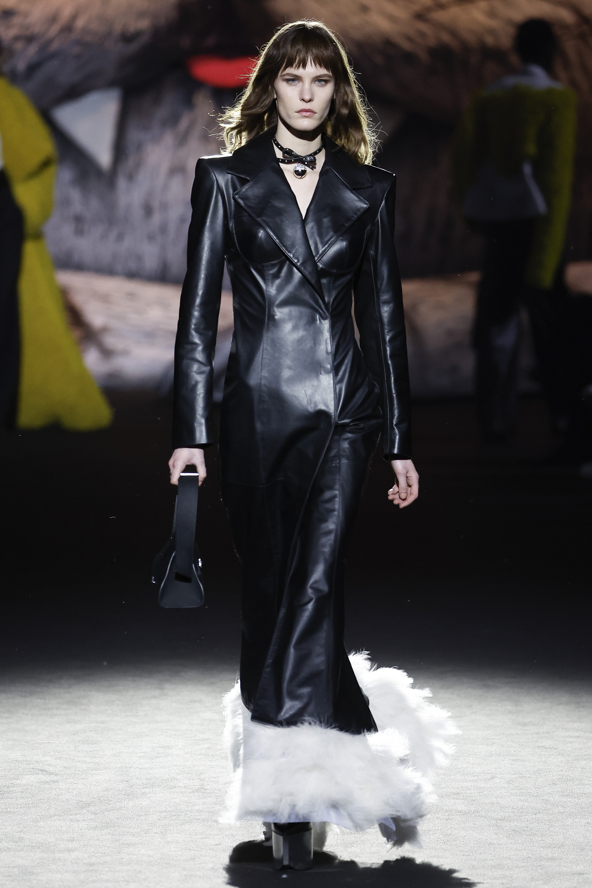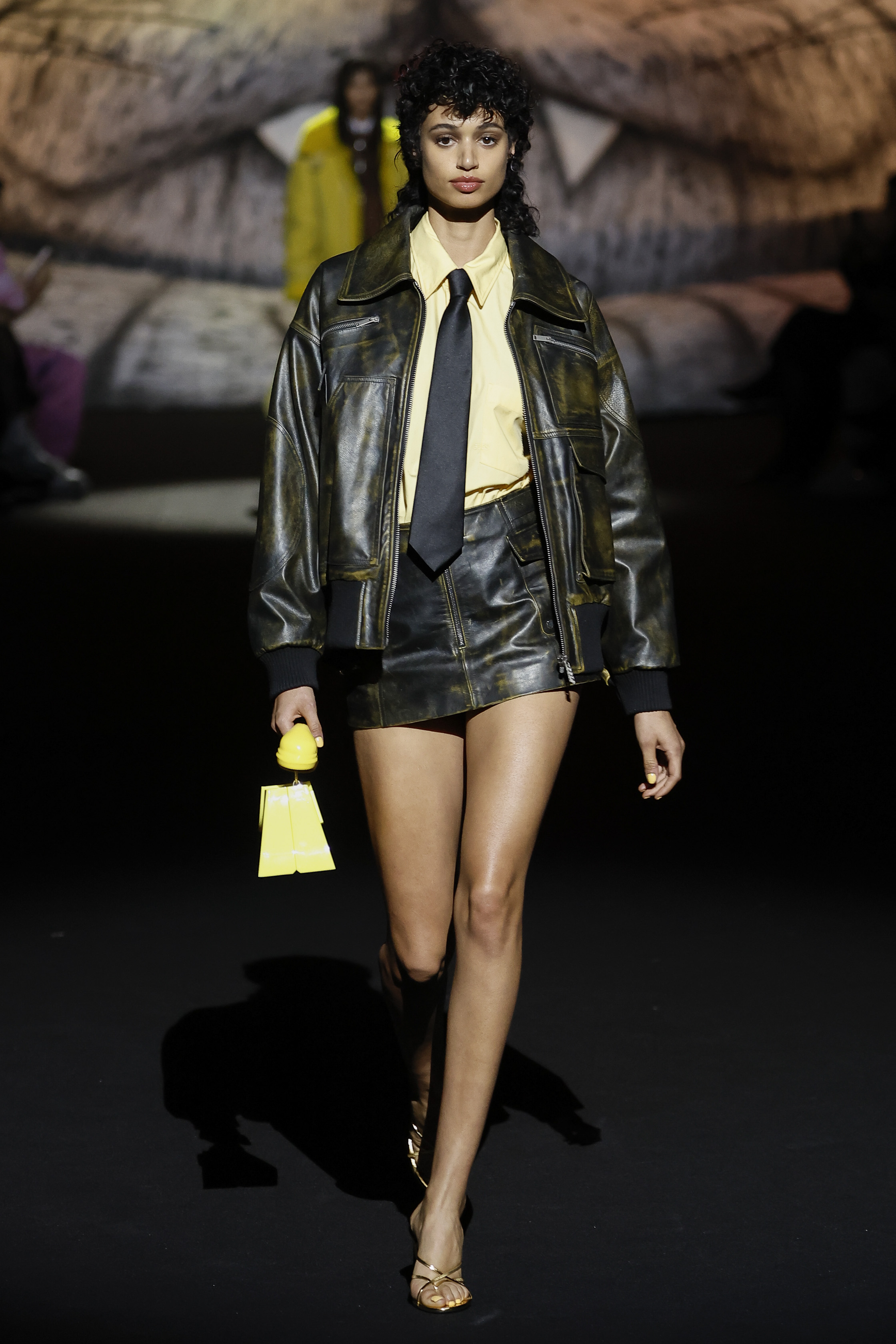 The house is the frame and the inspiration: à la GCDS, but of course. Giuliano Calza explores the obsessions and the proclivities that make him creatively thick: the very bourgeois tweeds of the jackets ladies wear; the pinstripes gentlemen depend on; the worn out leathers of their rebel off springs; the velvets of sofas and the tufty textures of bath mats. No prints this time round, nor bold patterns. Just like the household is a place with diff erent souls, one probably tender, and one more sultry, so the collection relies on the face off of the sweet and the darkly seductive, with accessories blowing the claws of domestic felines to human proportions, turning them into sensual weapons.