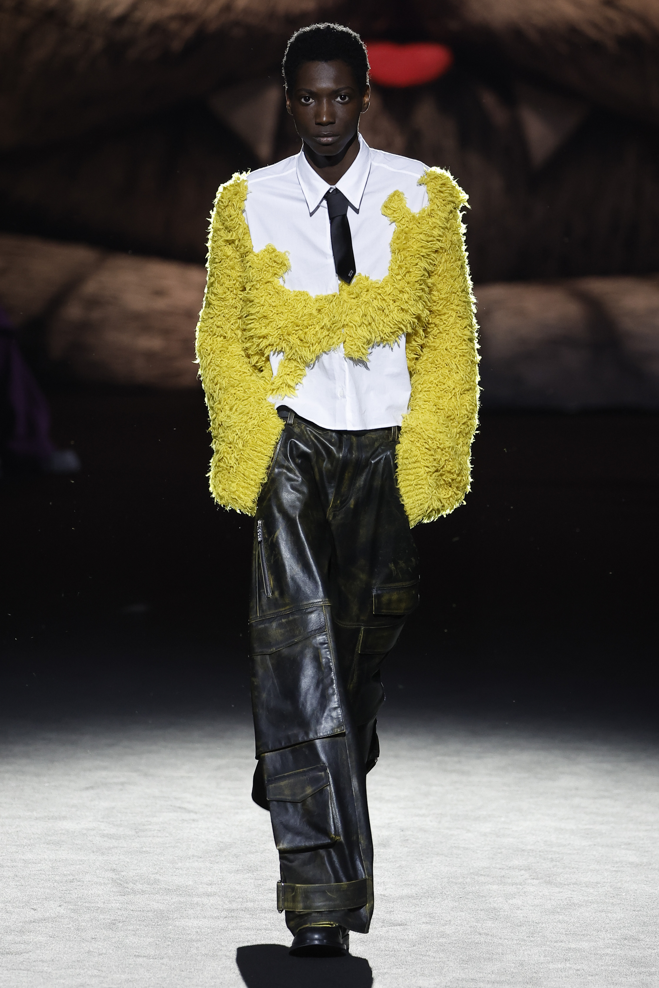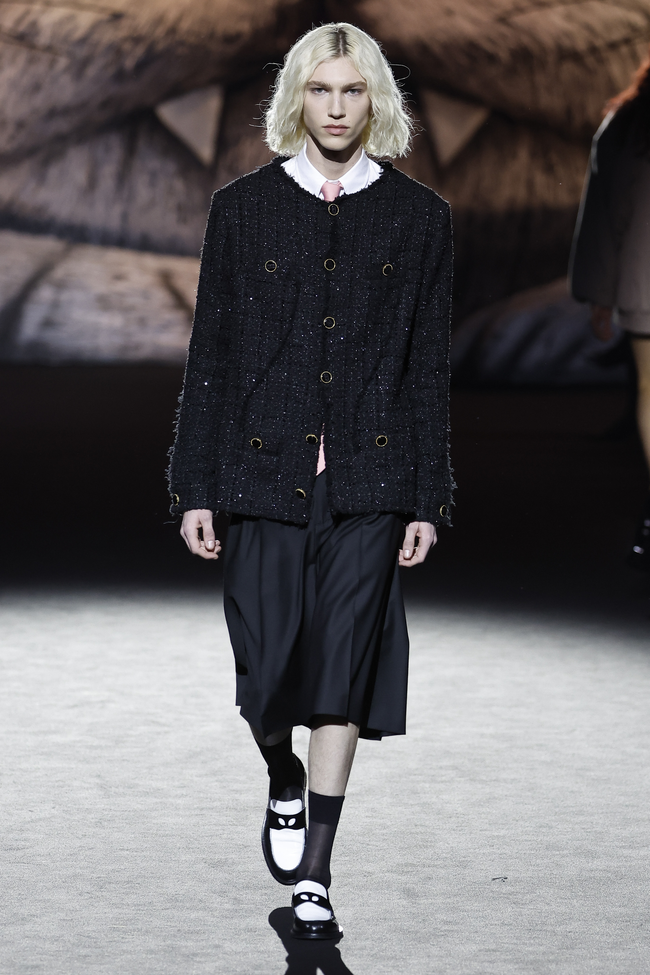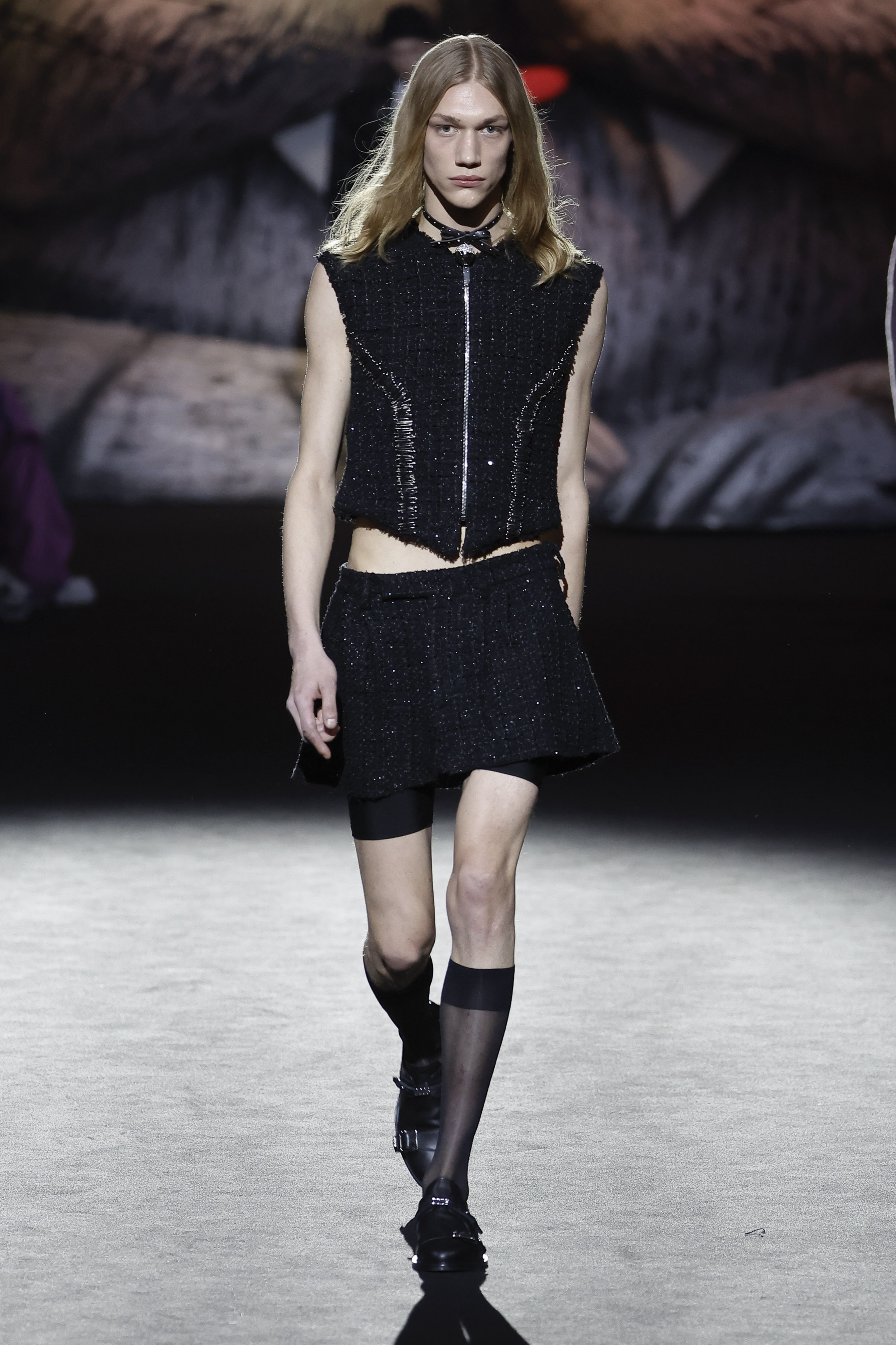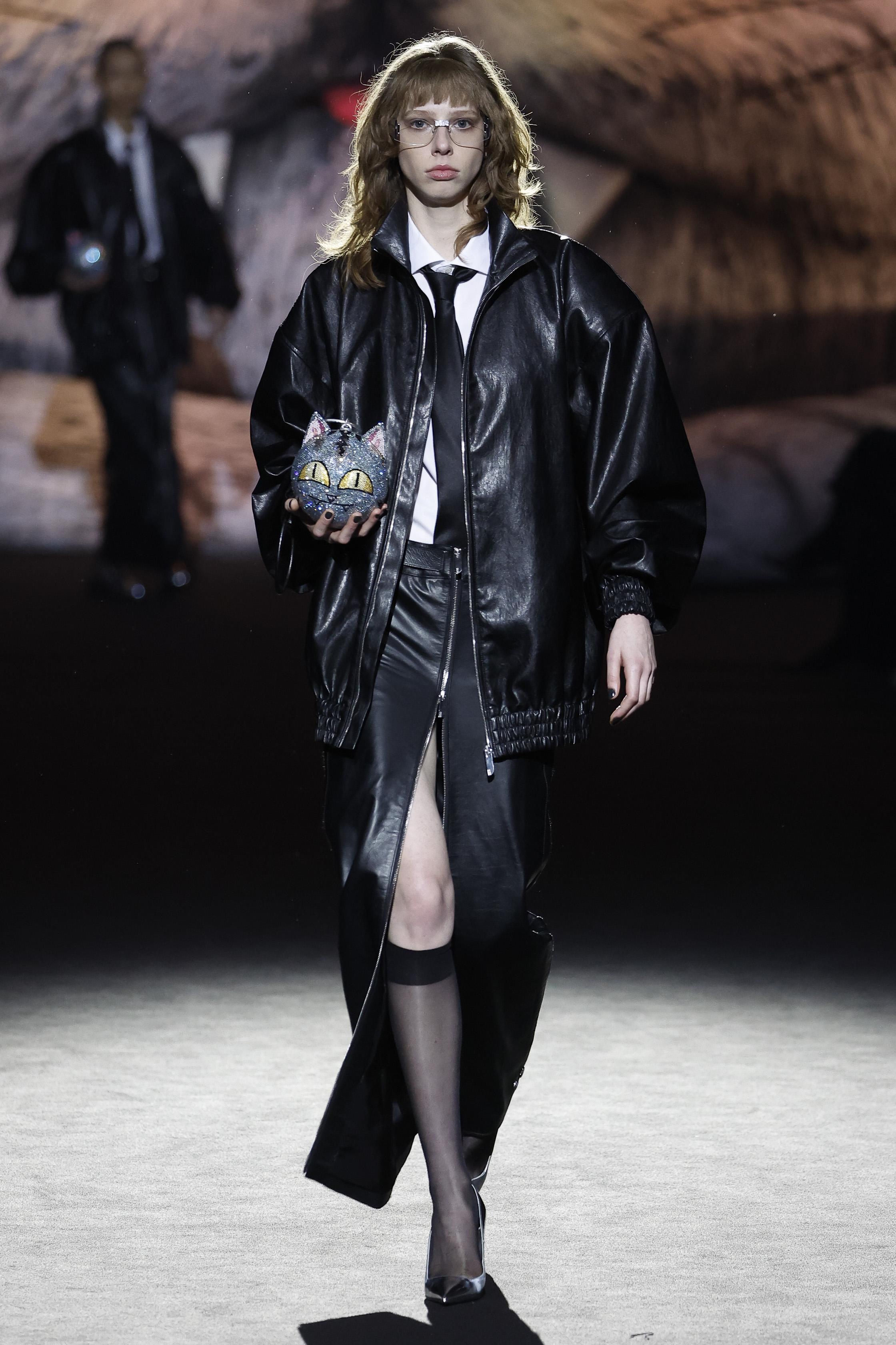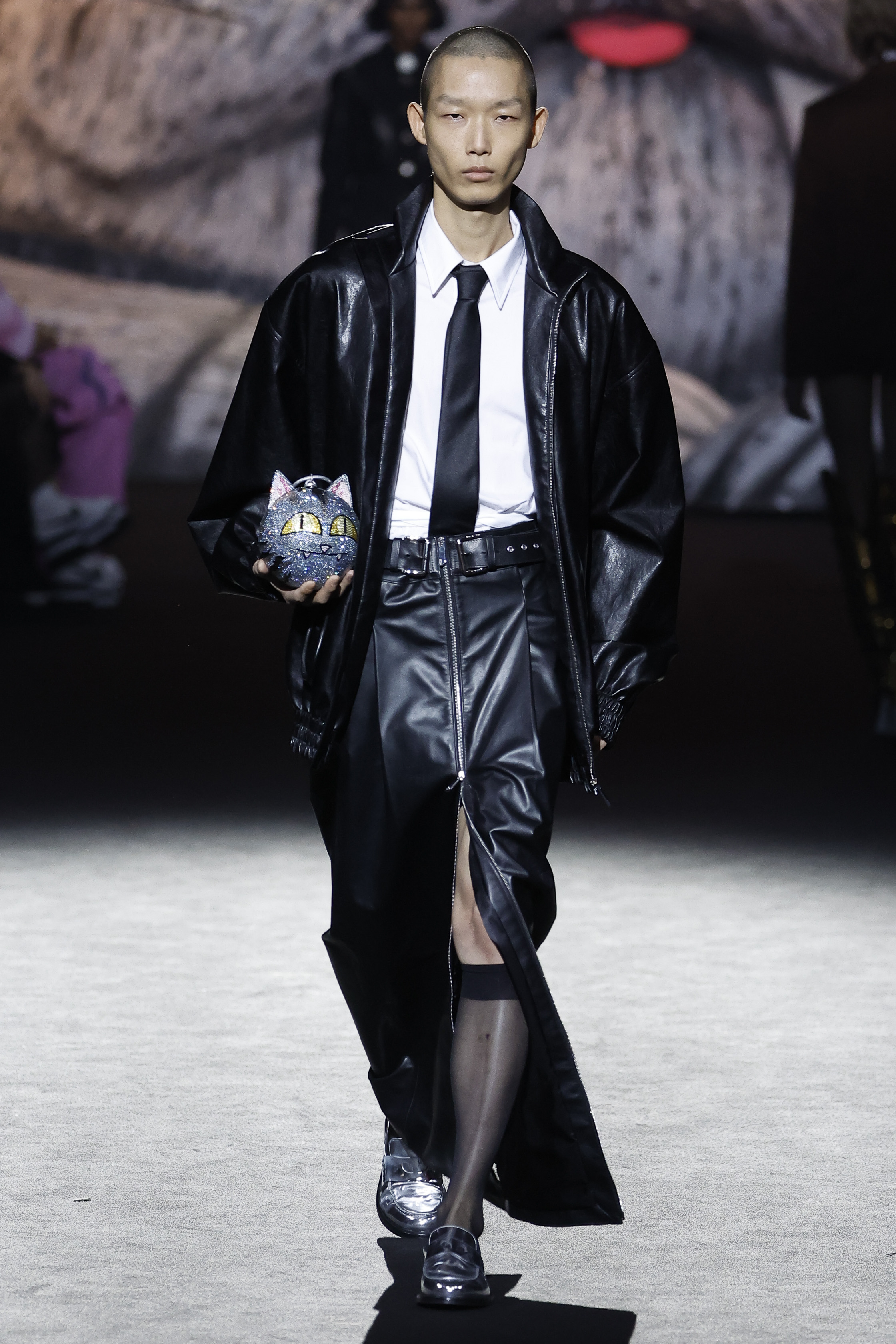 Reducing the distance between his perceived public persona, and who he really is, this season Giuliano Calza brings the GCDS action home. Literally, in his household, where Kittho the cat reigns supreme. It’s Kittho himself who presides over the catwalk, blown up to gigantic proportions thanks to the artistry of Carnevale di Viareggio masters Fratelli Cinquini Scenografi e - another celebration of Made in Italy craft and skills - and covered in newspaper clippings - that’s just because Giuliano feeds his creativity with the news. There is nothing Giuliano loves more than being with Kittho, but most of all there is nothing he loves more than making clothes: real ones, meant to be worn, not tricks intended to trigger viral yet virtual response. This collection is a fusion of such urgencies, condensed in a pure act of fashion making.