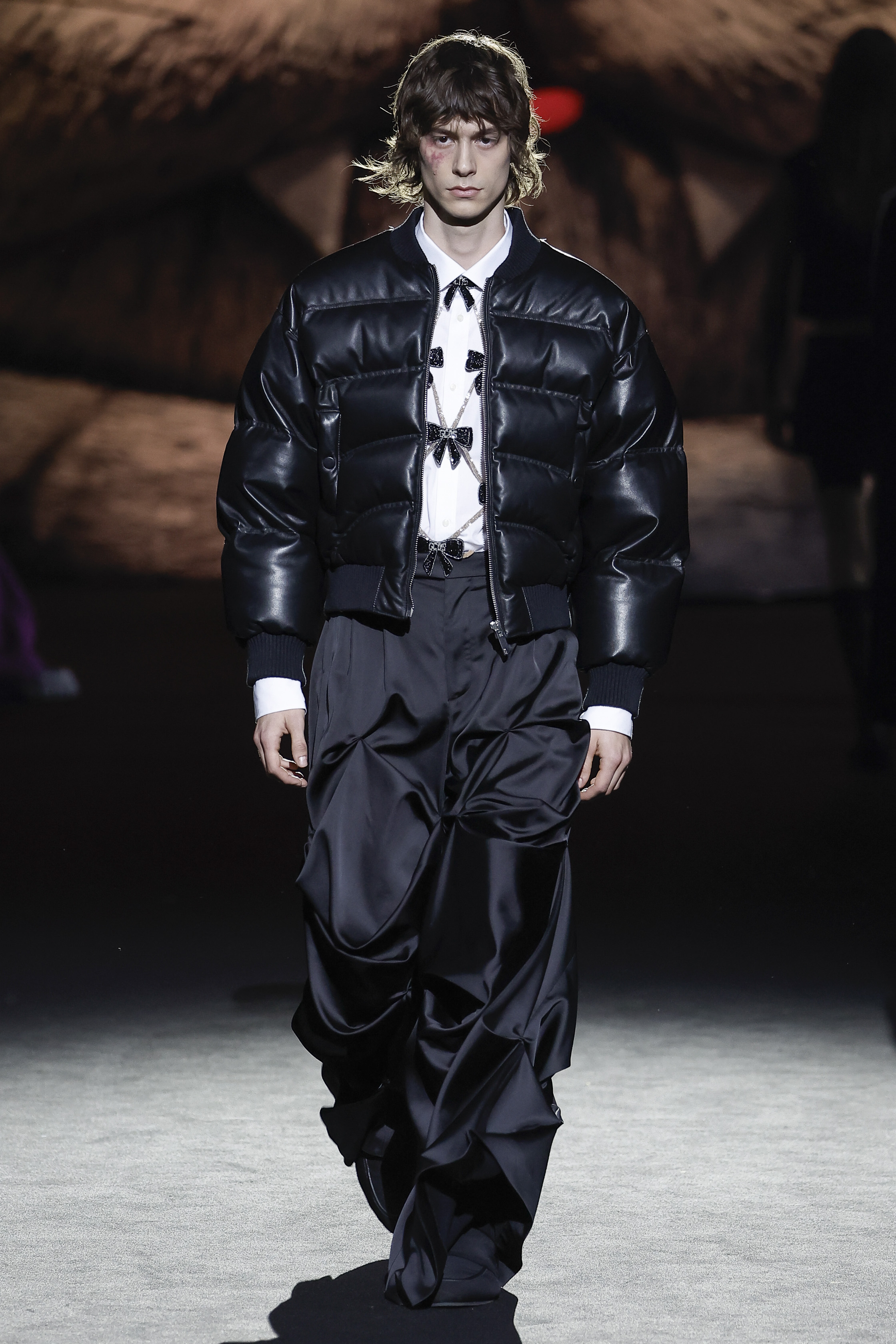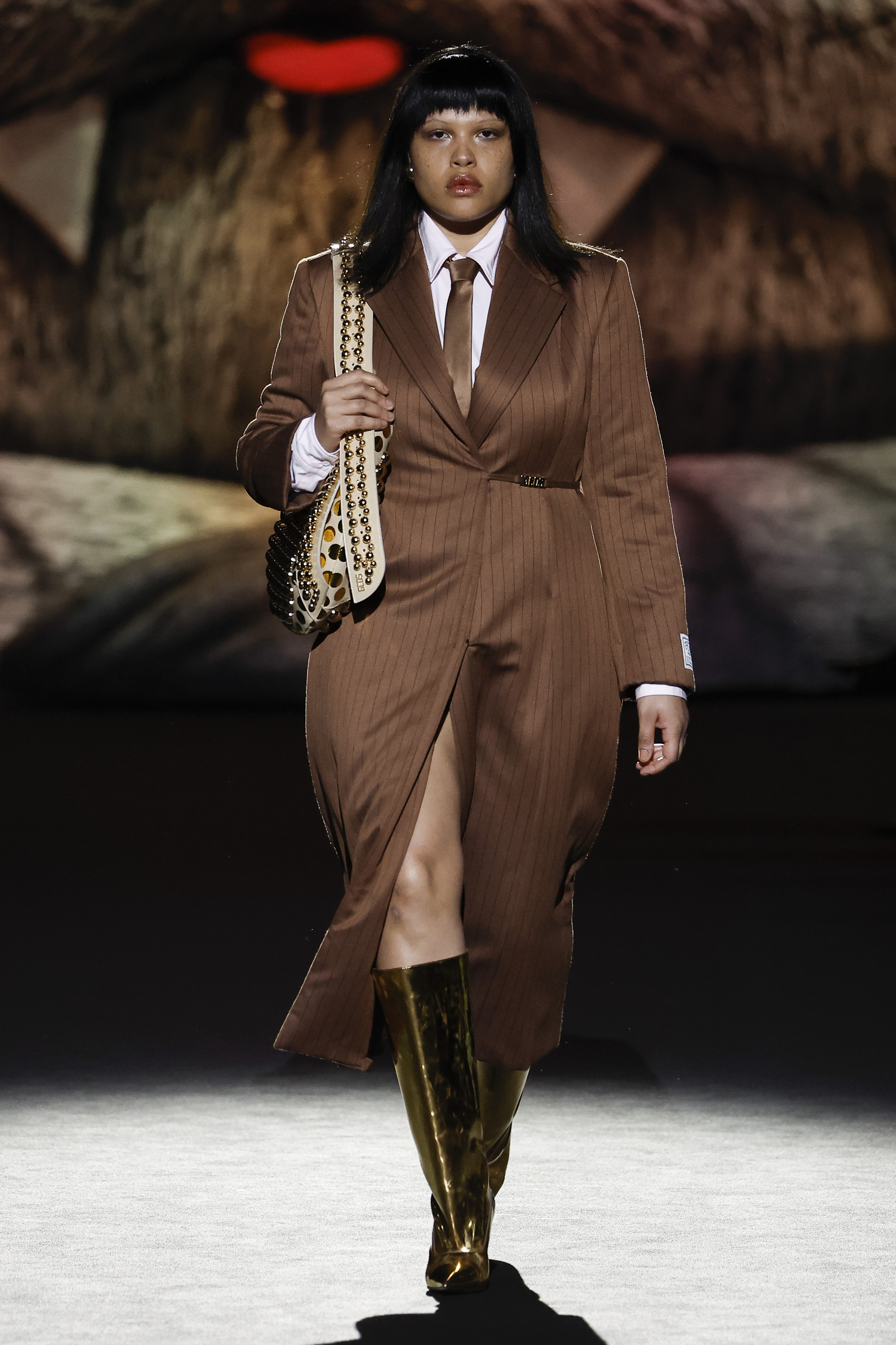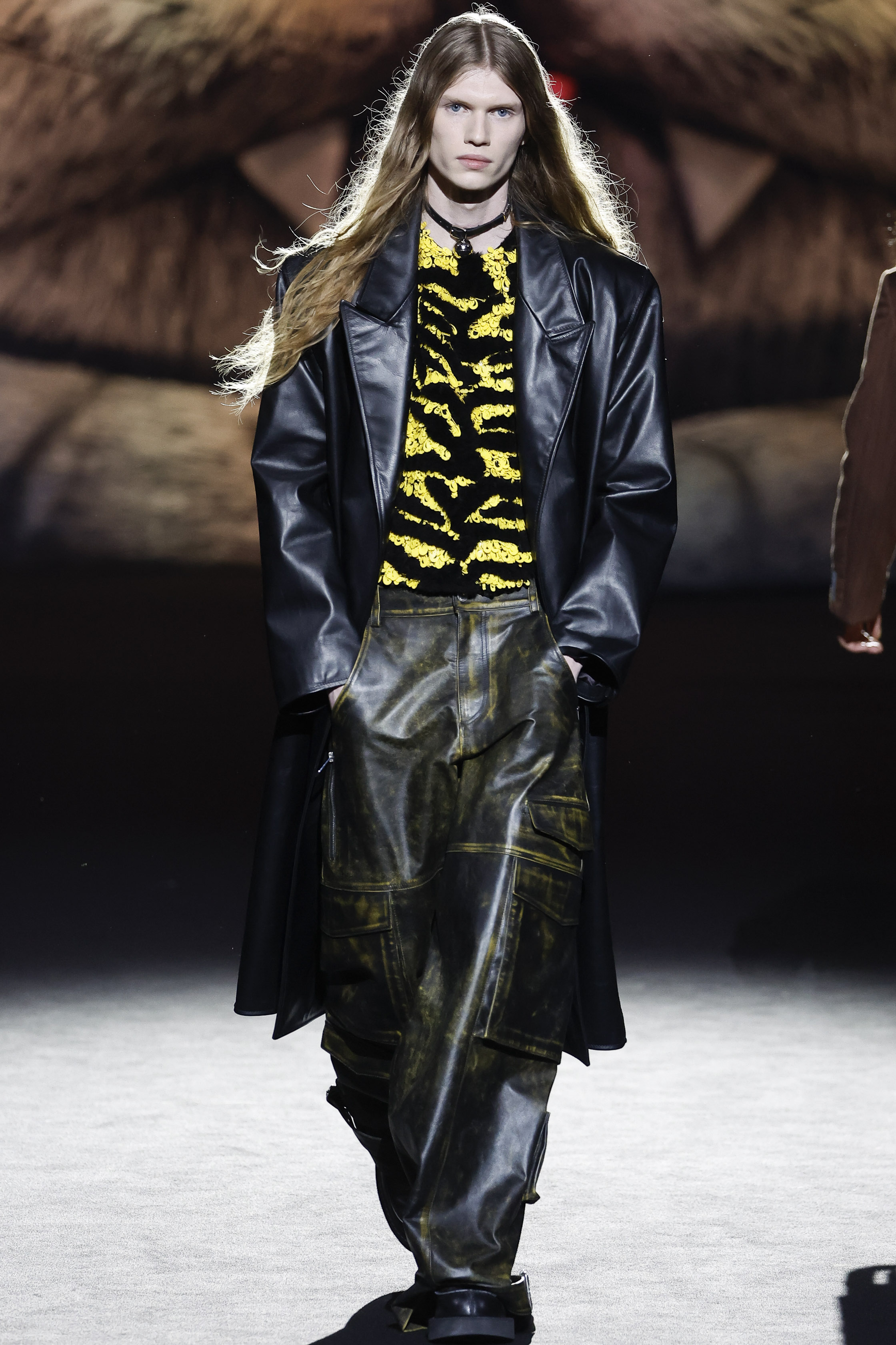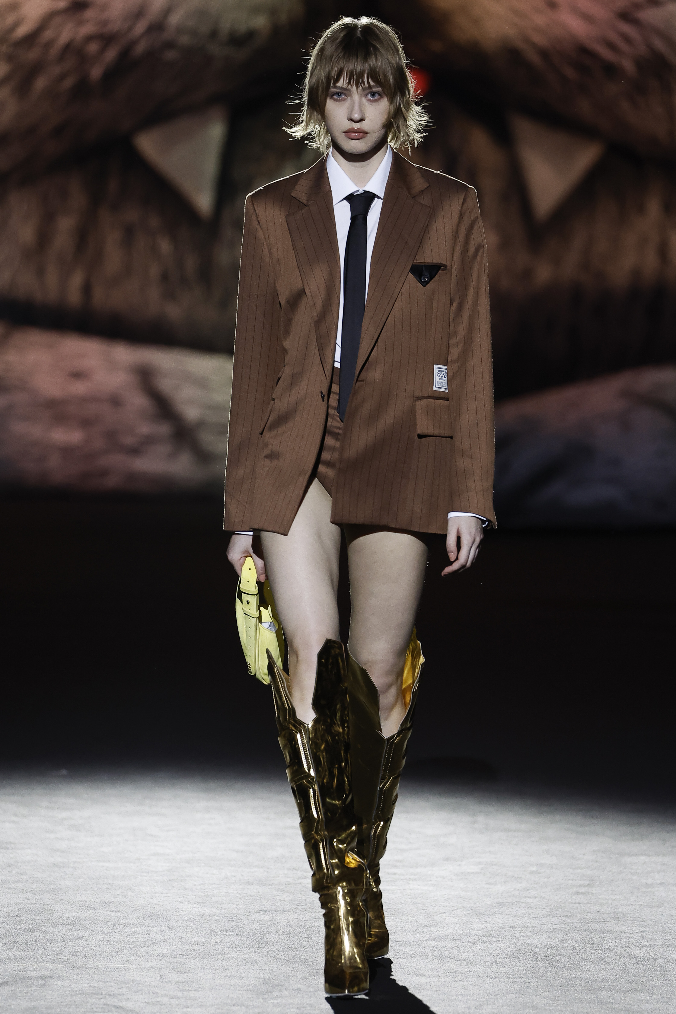 Reducing the distance between his perceived public persona, and who he really is, this season Giuliano Calza brings the GCDS action home. Literally, in his household, where Kittho the cat reigns supreme. It’s Kittho himself who presides over the catwalk, blown up to gigantic proportions thanks to the artistry of Carnevale di Viareggio masters Fratelli Cinquini Scenografi e - another celebration of Made in Italy craft and skills - and covered in newspaper clippings - that’s just because Giuliano feeds his creativity with the news. There is nothing Giuliano loves more than being with Kittho, but most of all there is nothing he loves more than making clothes: real ones, meant to be worn, not tricks intended to trigger viral yet virtual response. This collection is a fusion of such urgencies, condensed in a pure act of fashion making.