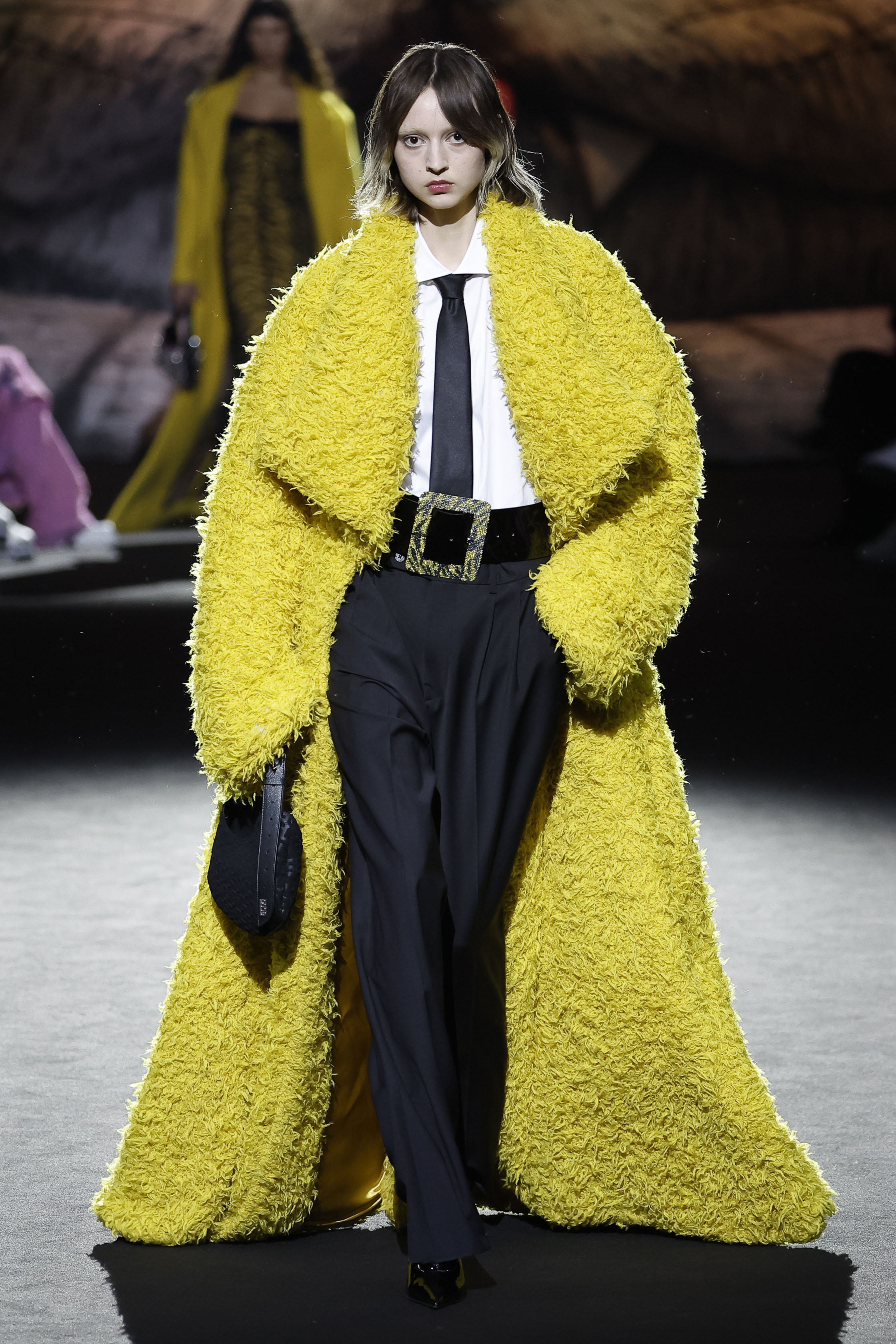 A beloved bakelite telephone comes back as a bag handle. The cozyness of punto pelliccia knitwear wrapping the body like a blanket is contradicted by the abundance of slashes and openings. And this being an act of fashion making, the work in progress is constantly shown, with safety pins aplenty holding things in place.