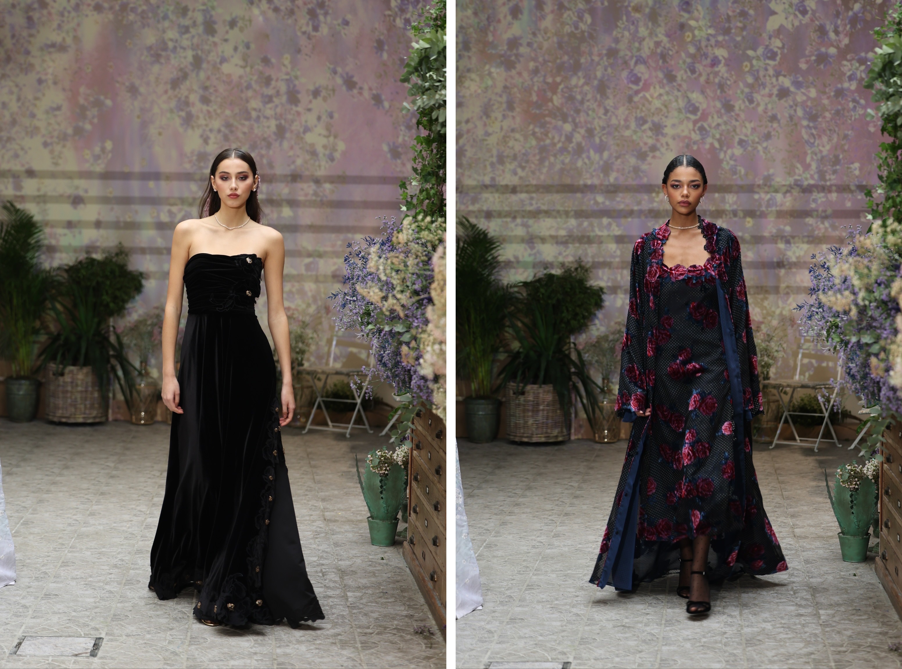 Among the fabrics: brocade, thousands velvets — smooth, corduroy, printed, dévoreé — and wools — stretch felted, tweed, cashmere — beyond georgette, chiffons and embroidered tulle. Shapes are soft and enhancing, with accent on the waist, alternating more sketched silhouettes made of “architectures” of satin and flounces. Lengths are mini to maxi.