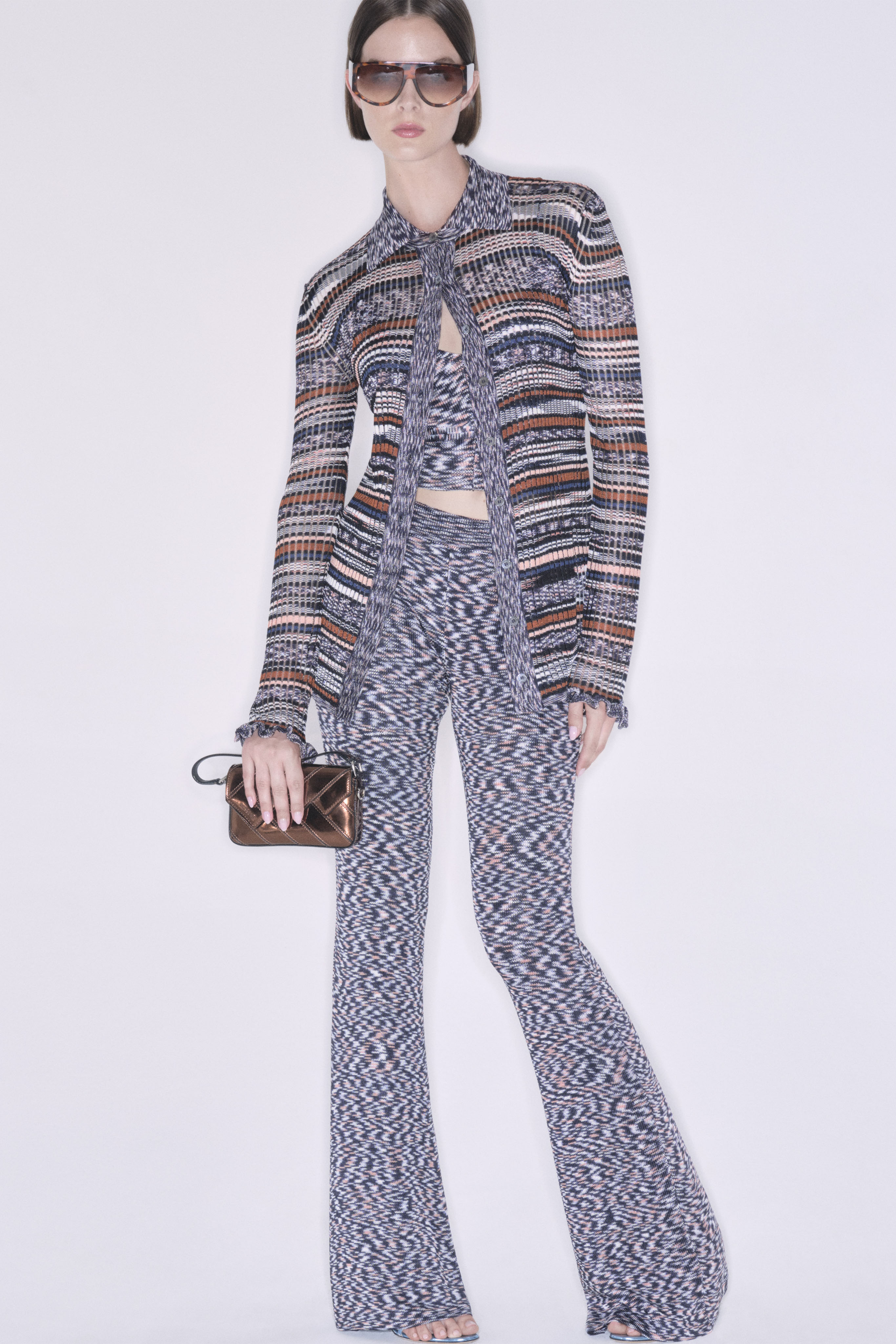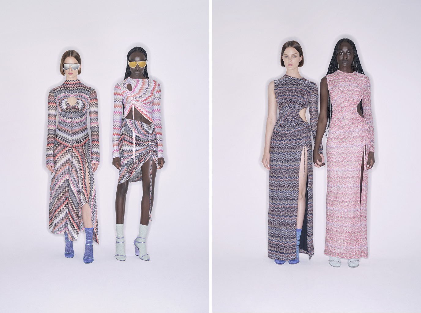 The Missoni woman experiences her physicality spontaneously. She layers, covering up and uncovering; she plays with drawstrings that create openings, portholes and gatherings; she mixes proportions, micro and macro, short and long, creating a grammar of shapes, patterns and surfaces that turn black and sparkling in the evening, remaining just as textural.