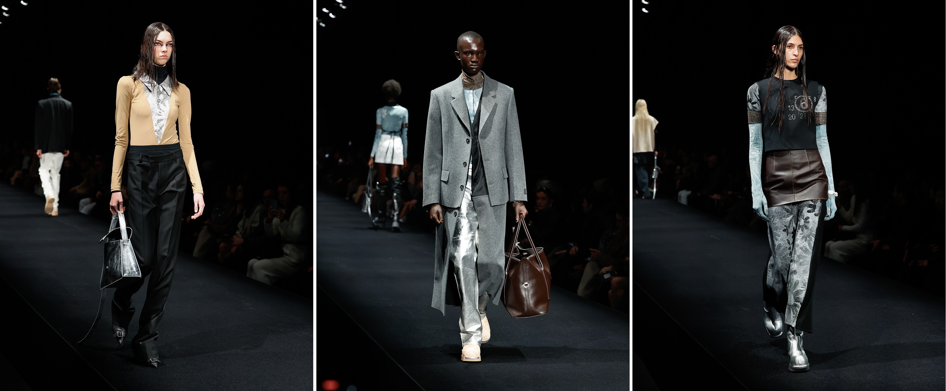 Shoes and accessories are also refracted through this season’s hall of mirrors. Bulky-footed thigh-high boots are crafted from panelled brushed calfskin and distressed suede, featuring 7cm flatforms to create a subtle illusion of height. A pointed kitten heel mule and boot figure in a silver foil finish that echoes across this season’s jeans and a three-size-run of MM6 Maison Margiela’s geometrically constructed Numeric Bag. Reiterating the collection’s interpretation of modular aesthetics, the iconic Japanese Bag returns as a triple-handled iteration and as a full-size Weekender.