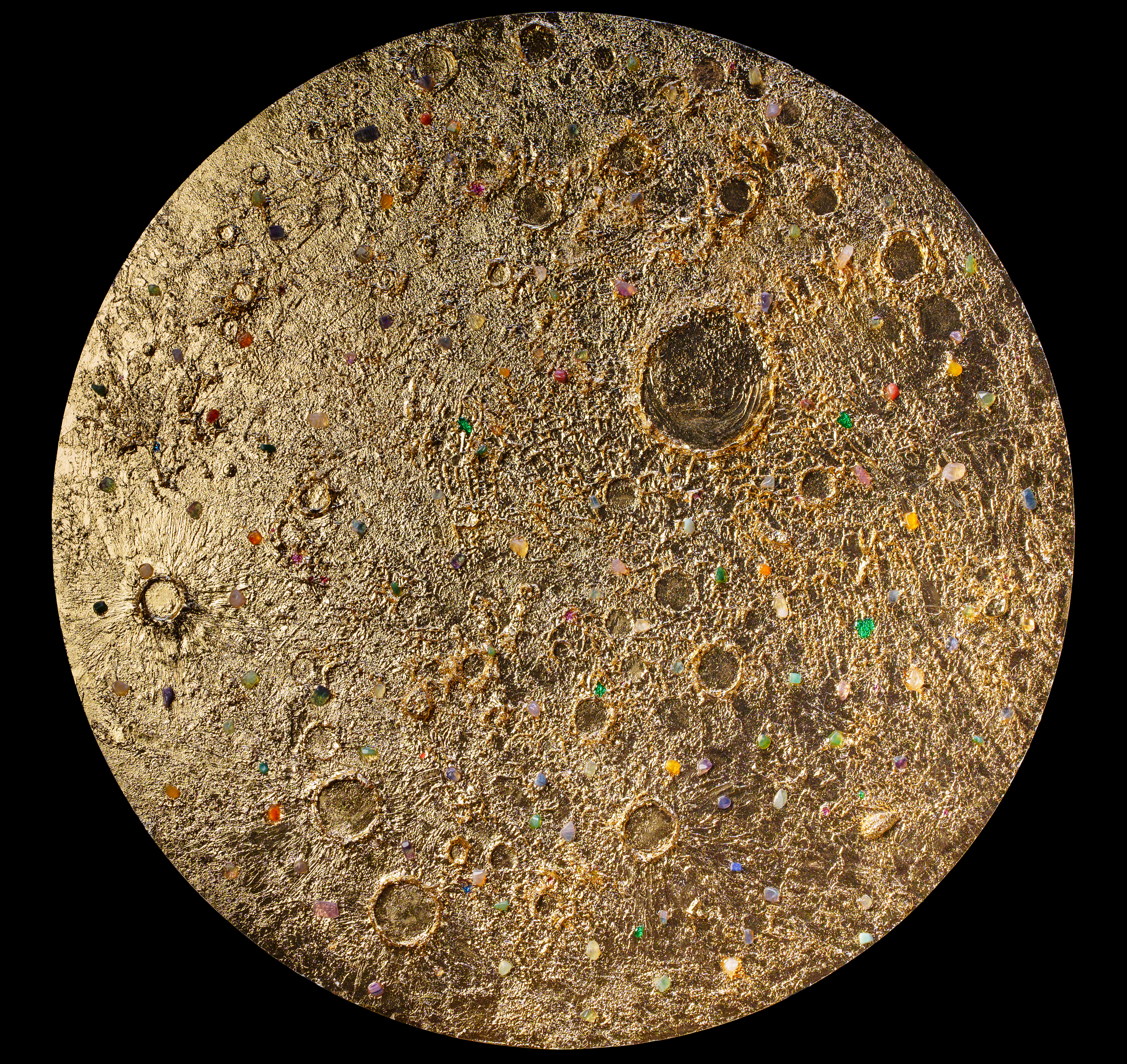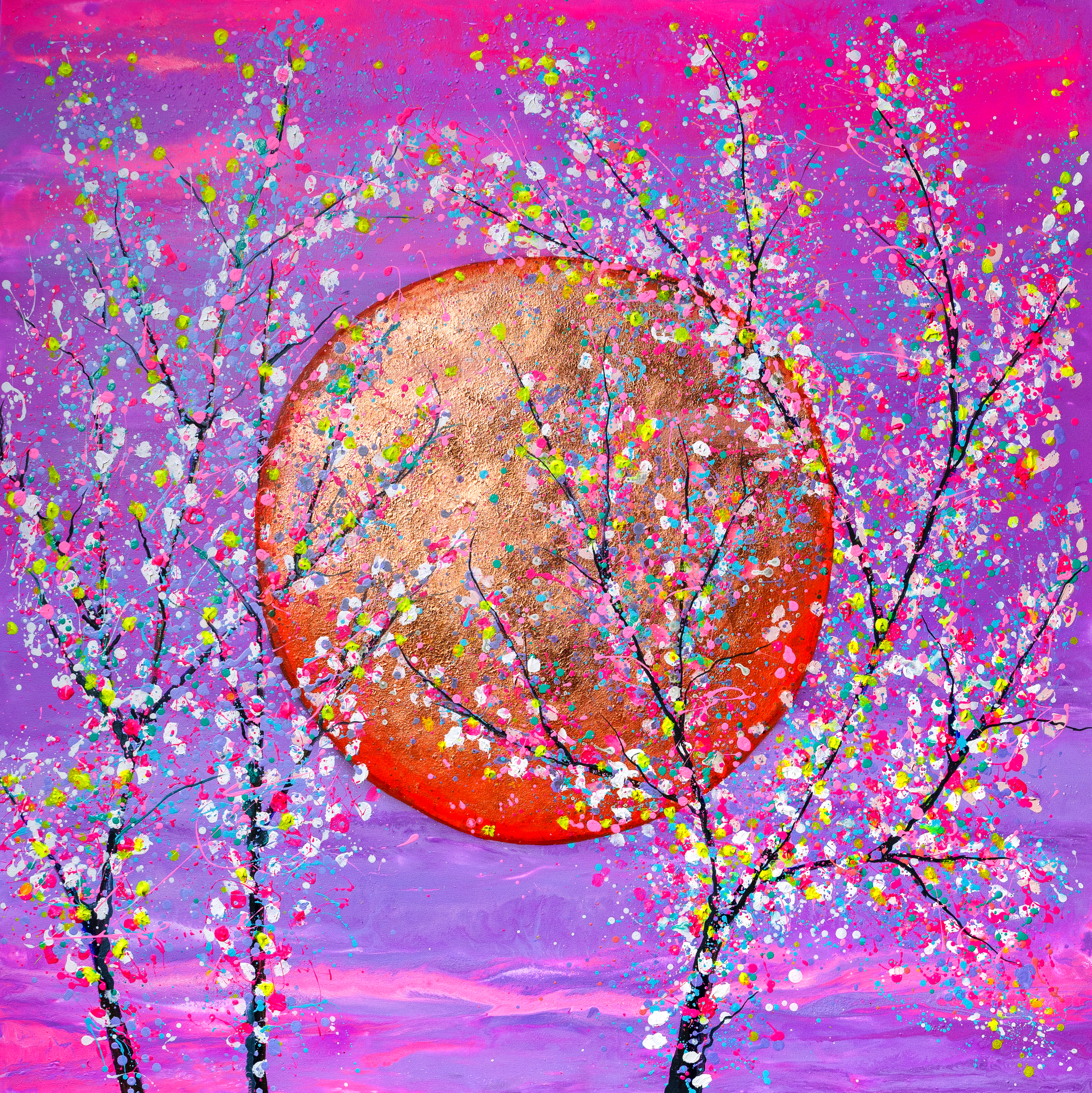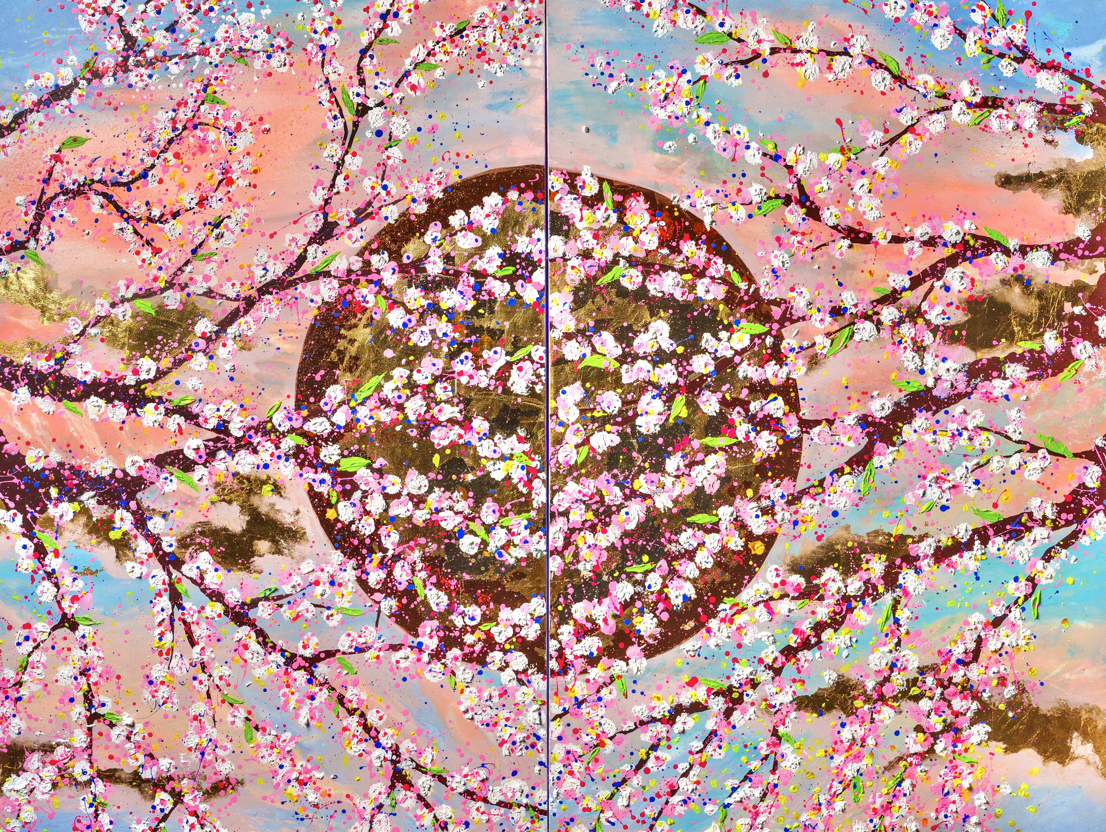 The Lunar exhibition presents an array of distinctive sun and moon renditions that are bold and playful. The use of gold and silver in her works symbolize wealth. Similarly, the sun represents the symbols of power, creative energy, vitality, passion, courage, eternal youth, knowledge, intelligence and masculine energy. On the other hand, the moon reflects sunlight embodying feminine energy with fertility, water, rebirth and a cyclical process. Additionally, her artwork with blossoming trees portray the coming of spring with emotions of newness, youth and love.