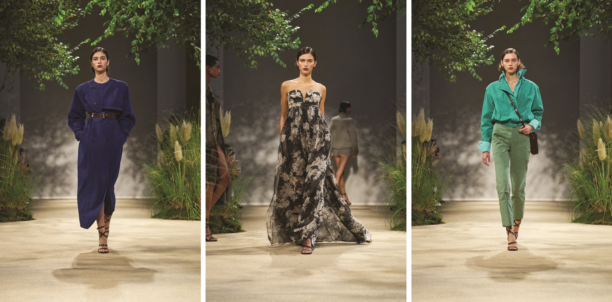Their jodhpurs, siren suits and other workwear classics are the inspiration for Max Mara’s utility glamour, featuring pockets and pouches capacious enough for a potting trowel, tough reinforced stitching and sturdy suspenders. They are realized in characterful drills dyed in an astonishing profusion of pretty colors like the flowers on the riotous sweet peas in a midsummer cottage garden. Of course, there are sandy neutrals too, conferring a sense of understated luxury to the perfectly designed trench coats, generous military style jackets and rompers. Backless dresses inspired by gardeners’ aprons, and triple layered chiffon gowns with gaberdine straps take the tough chic message from day to evening.