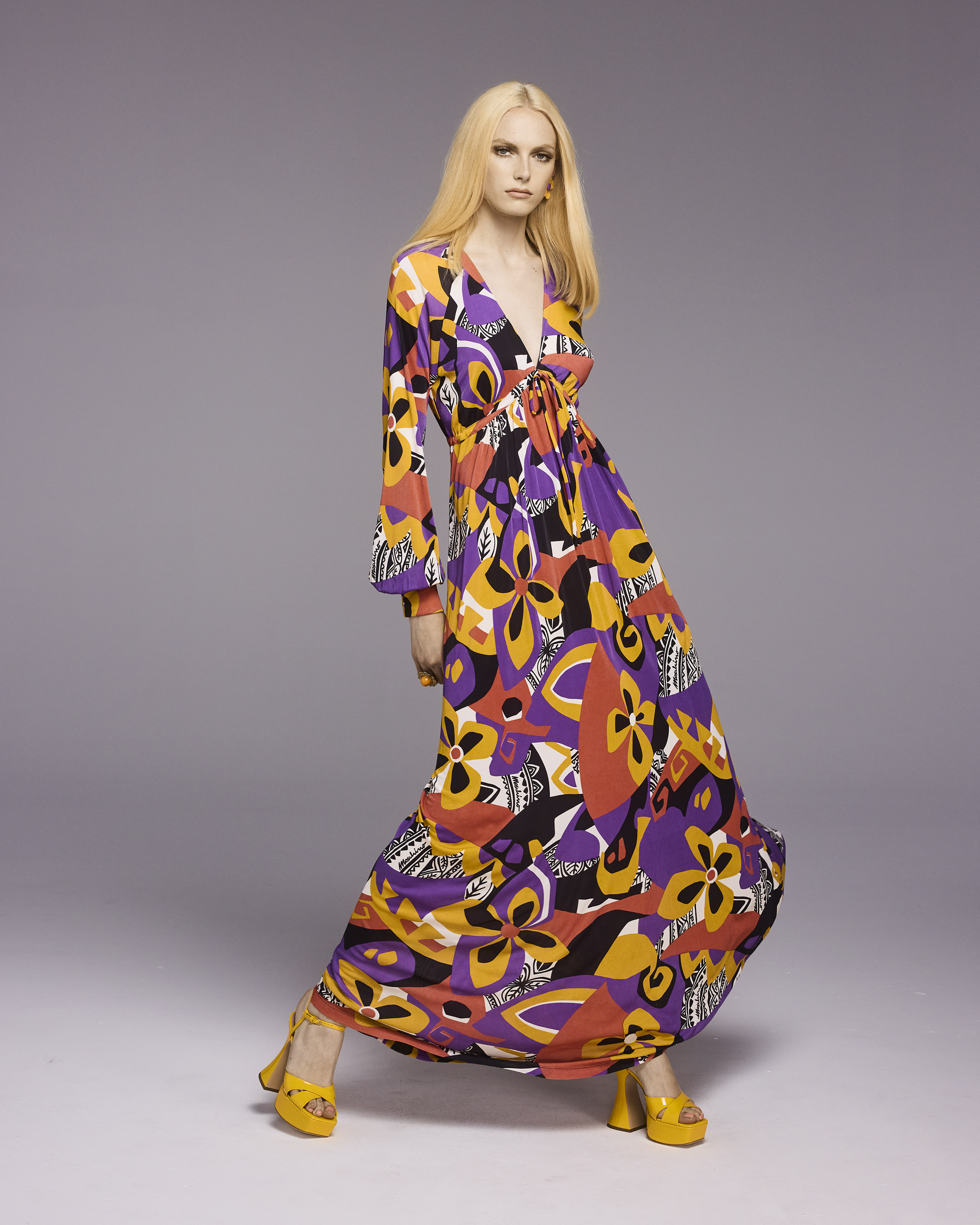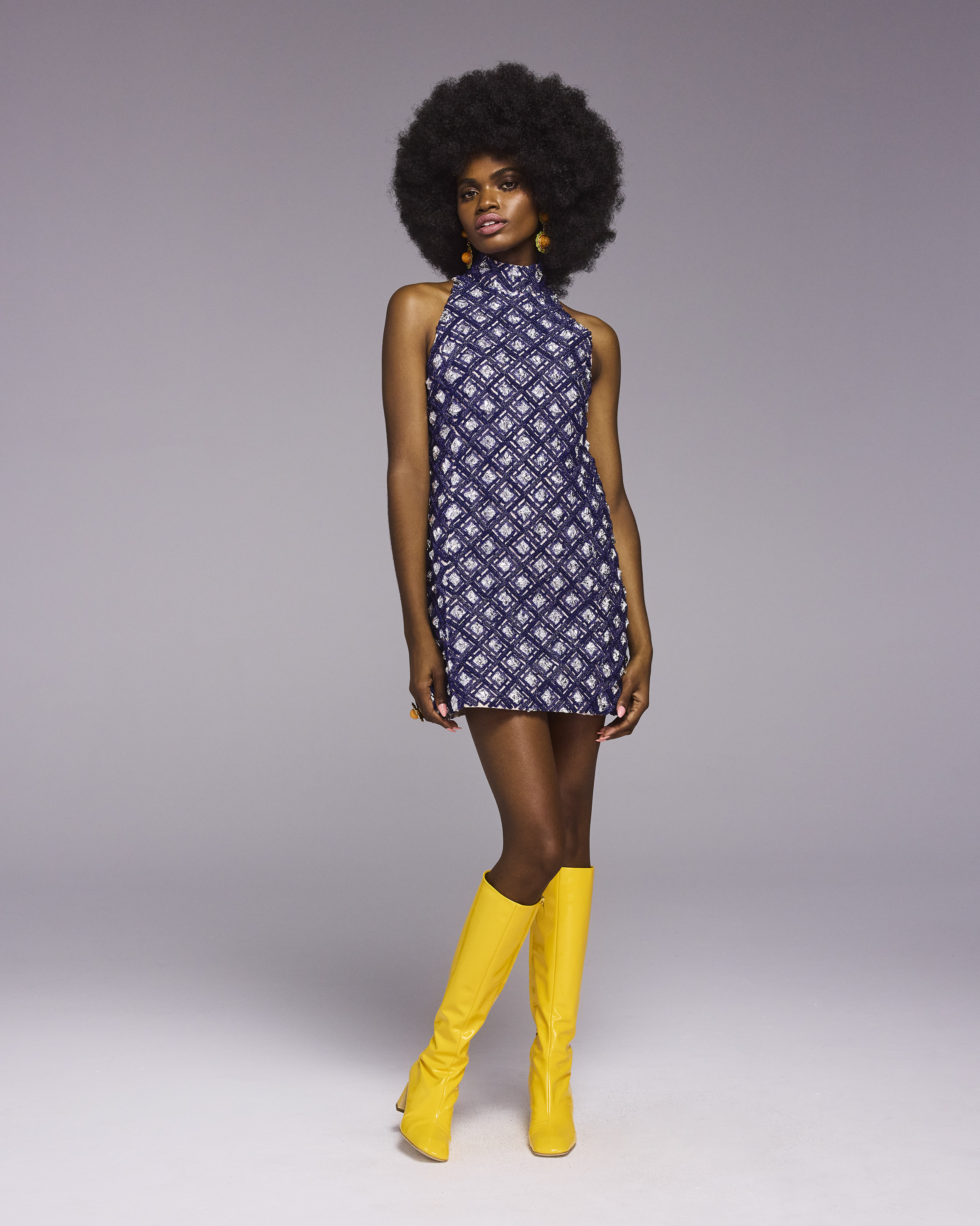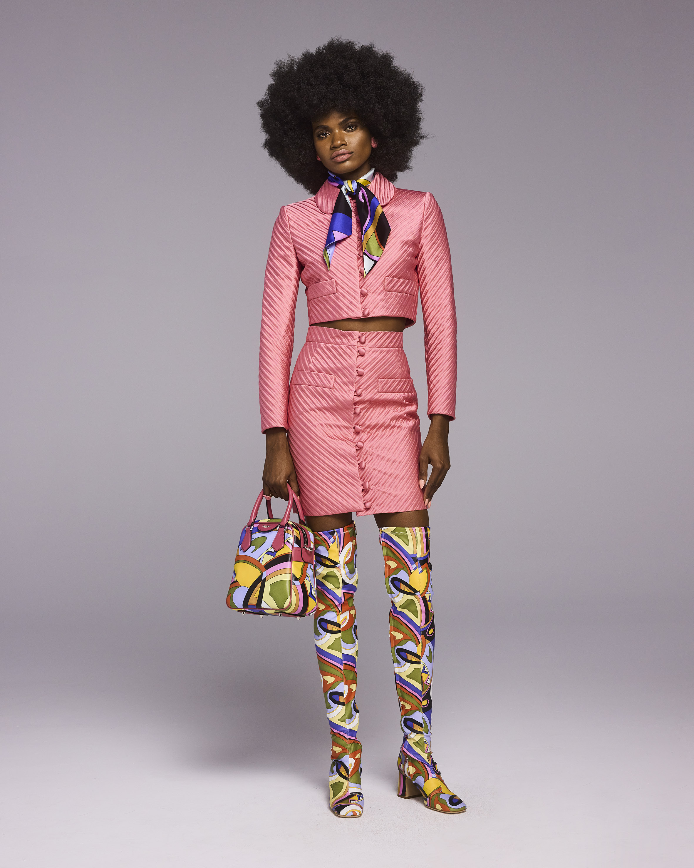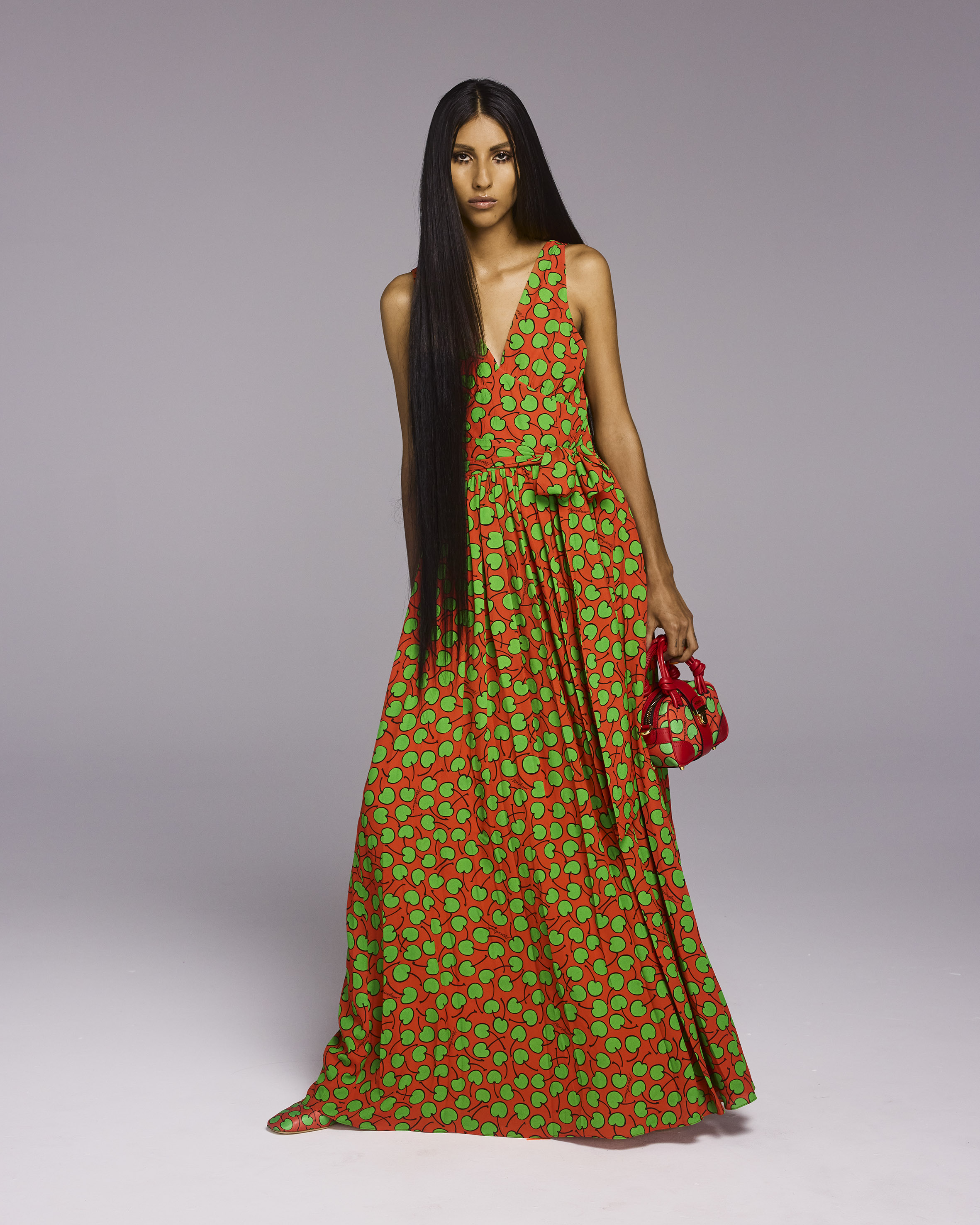 Our trip takes off with a cherry print, though these little fruits are sugared and green, adding a visual garnish to the tropical cocktail. The groove starts to emerge: It’s a look that’s slightly hippie, slightly disco, and slightly formal (remember when flying’s de facto dress code was a chic little suit?), with an emphasis on long silhouettes alongside go-go mini skirts and short-shorts.