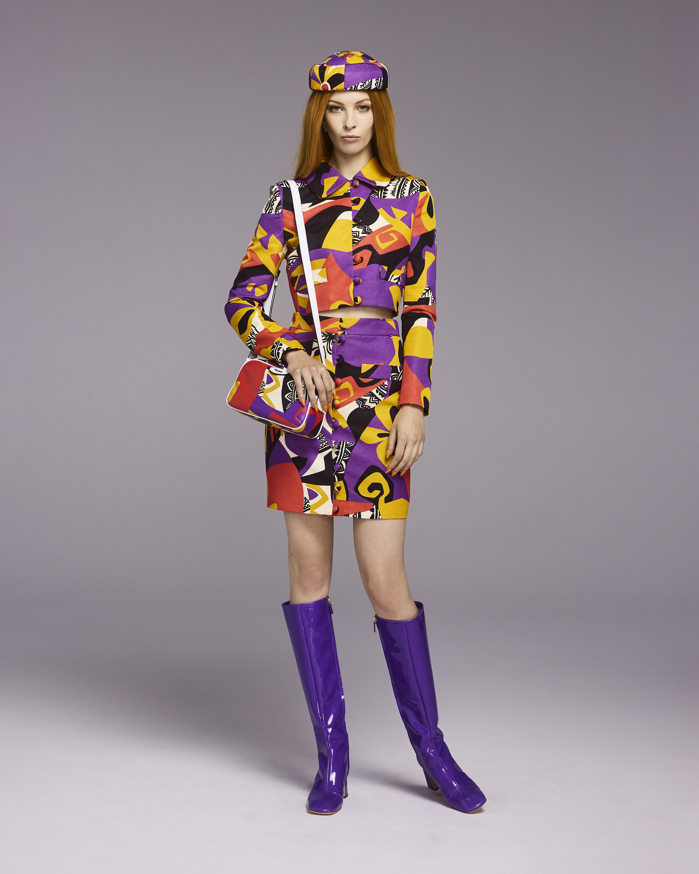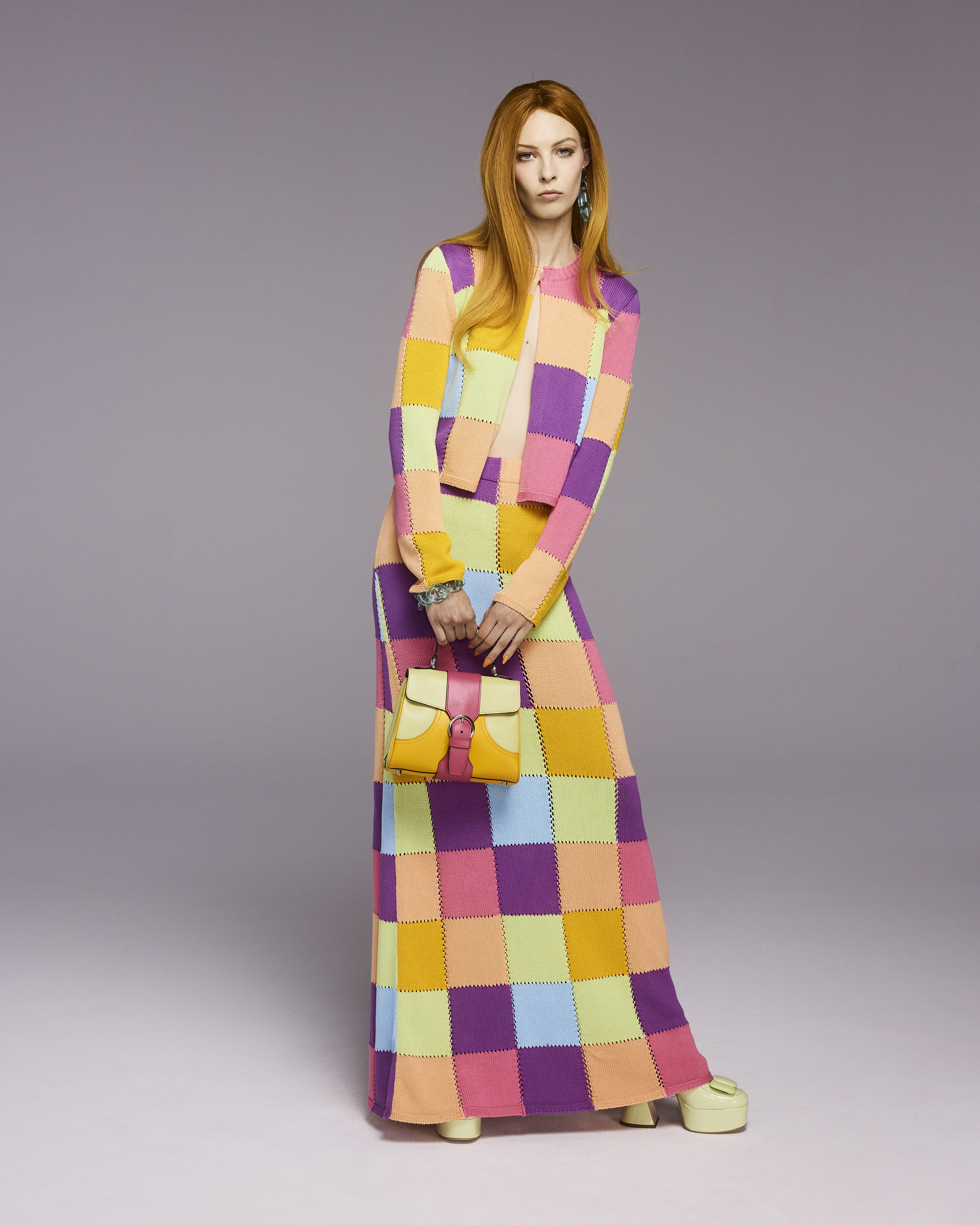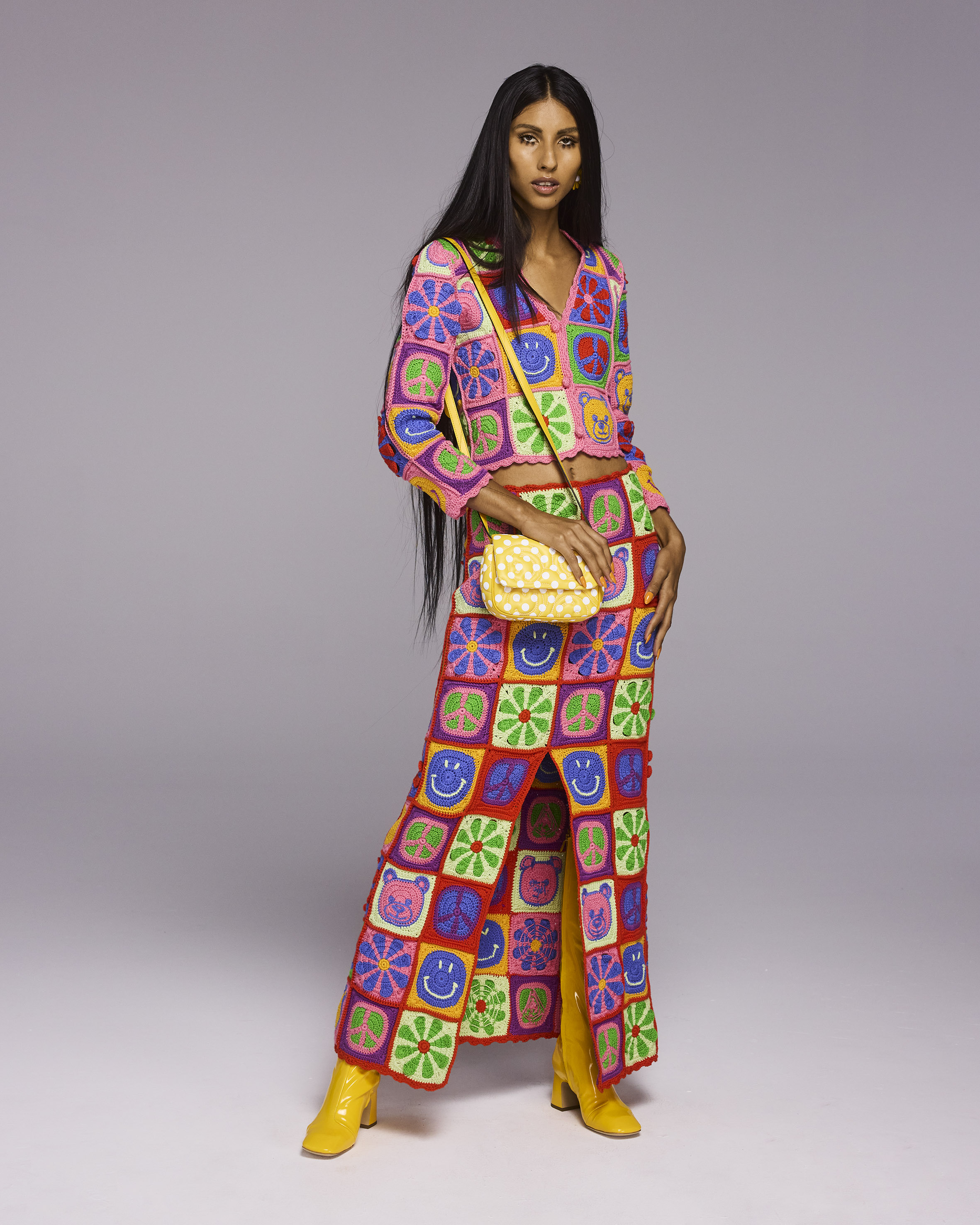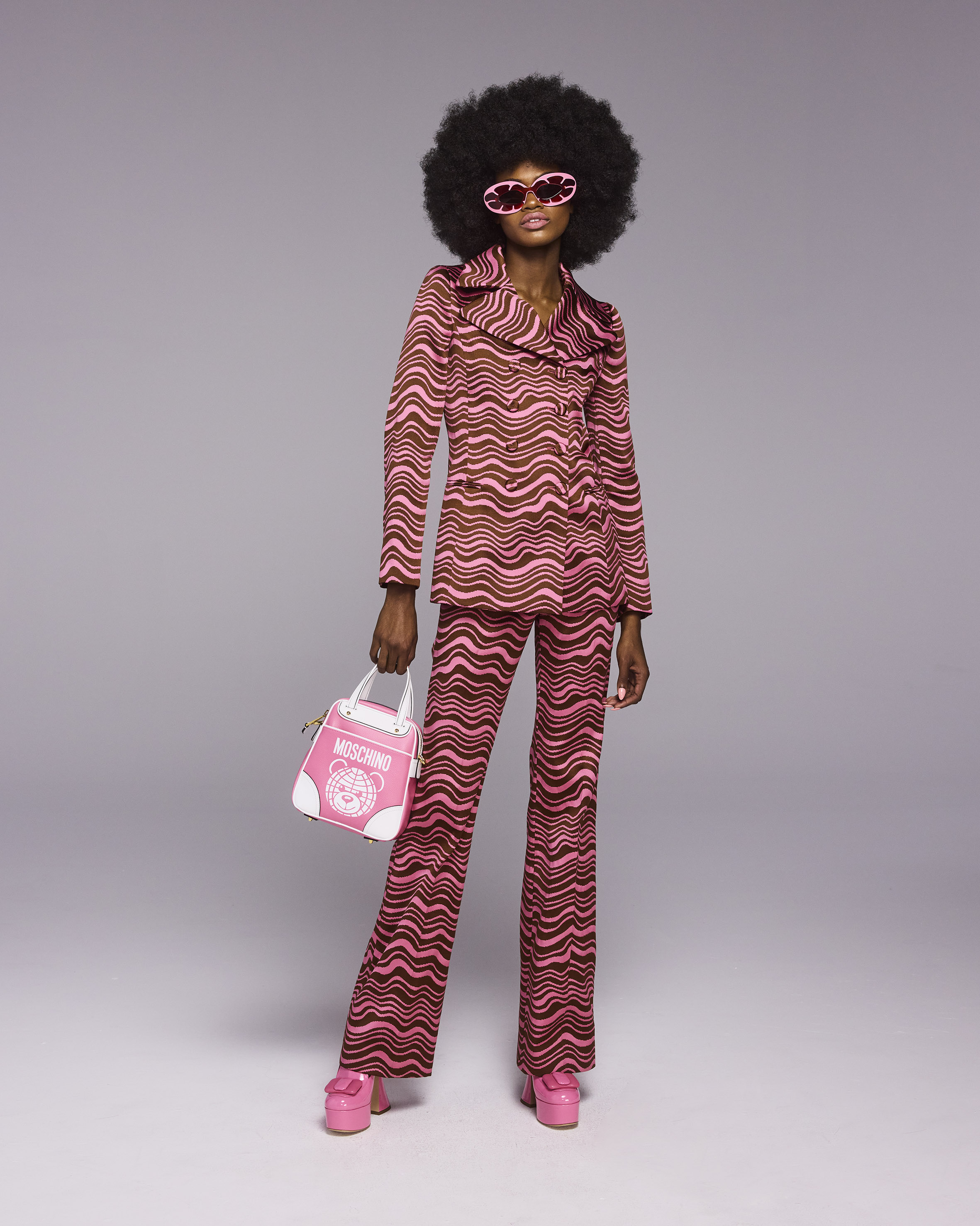 Crochet pieces add to the vintage vibes – in some cases, they’re quilted together, depicting flowers, smiley faces, and a version of Moschino’s teddy bear. Mixed in retro airport upholstery patterns, wavy jacquards and polka-dot embroideries enhance the atmosphere across a maxi-dress, a bra top, leggy trousers, a beret and much more. The accessories, too, take a trip down memory lane, particularly with Moschino-fied flight bags and Bakelite-bright costume jewelry.